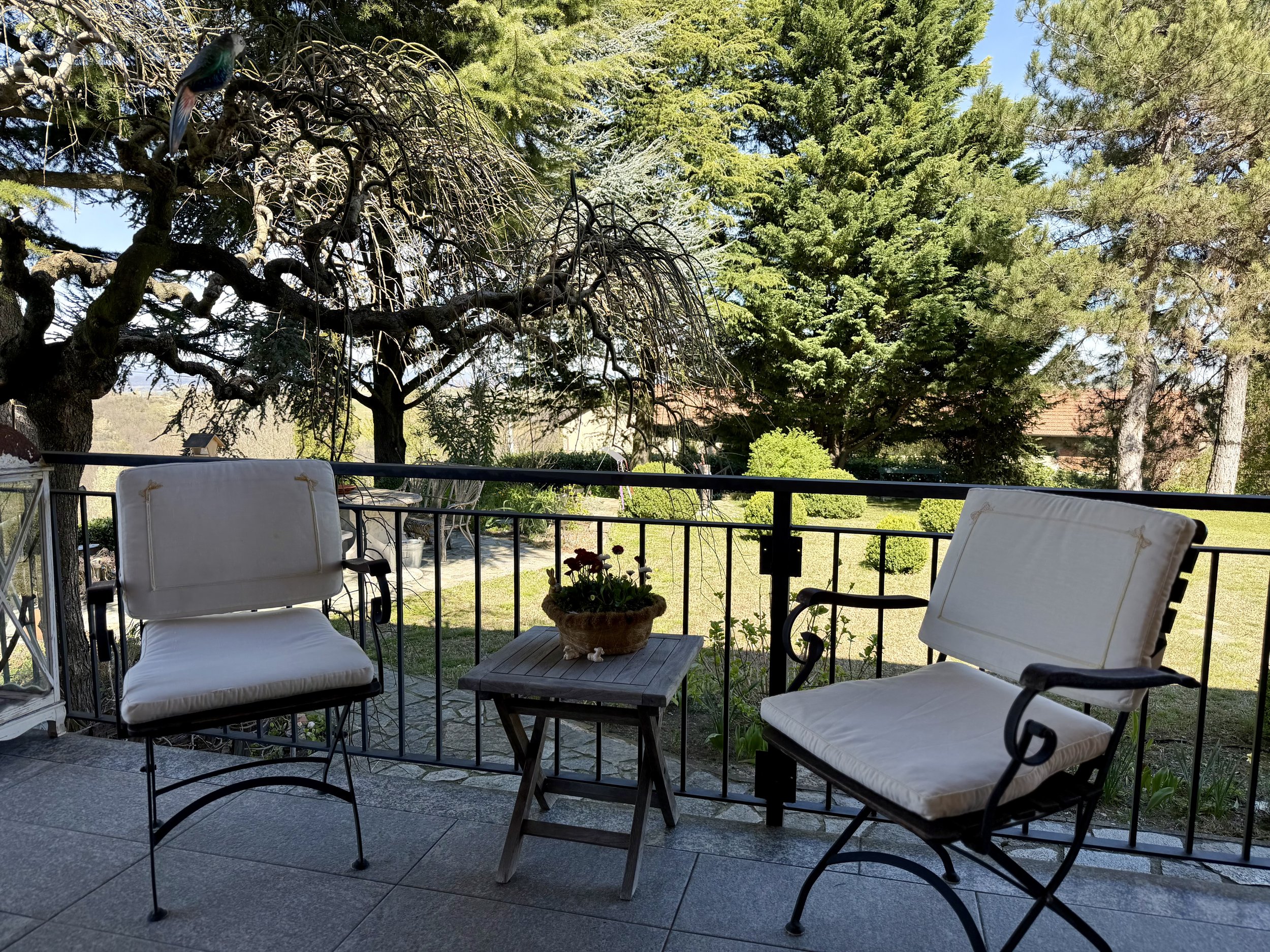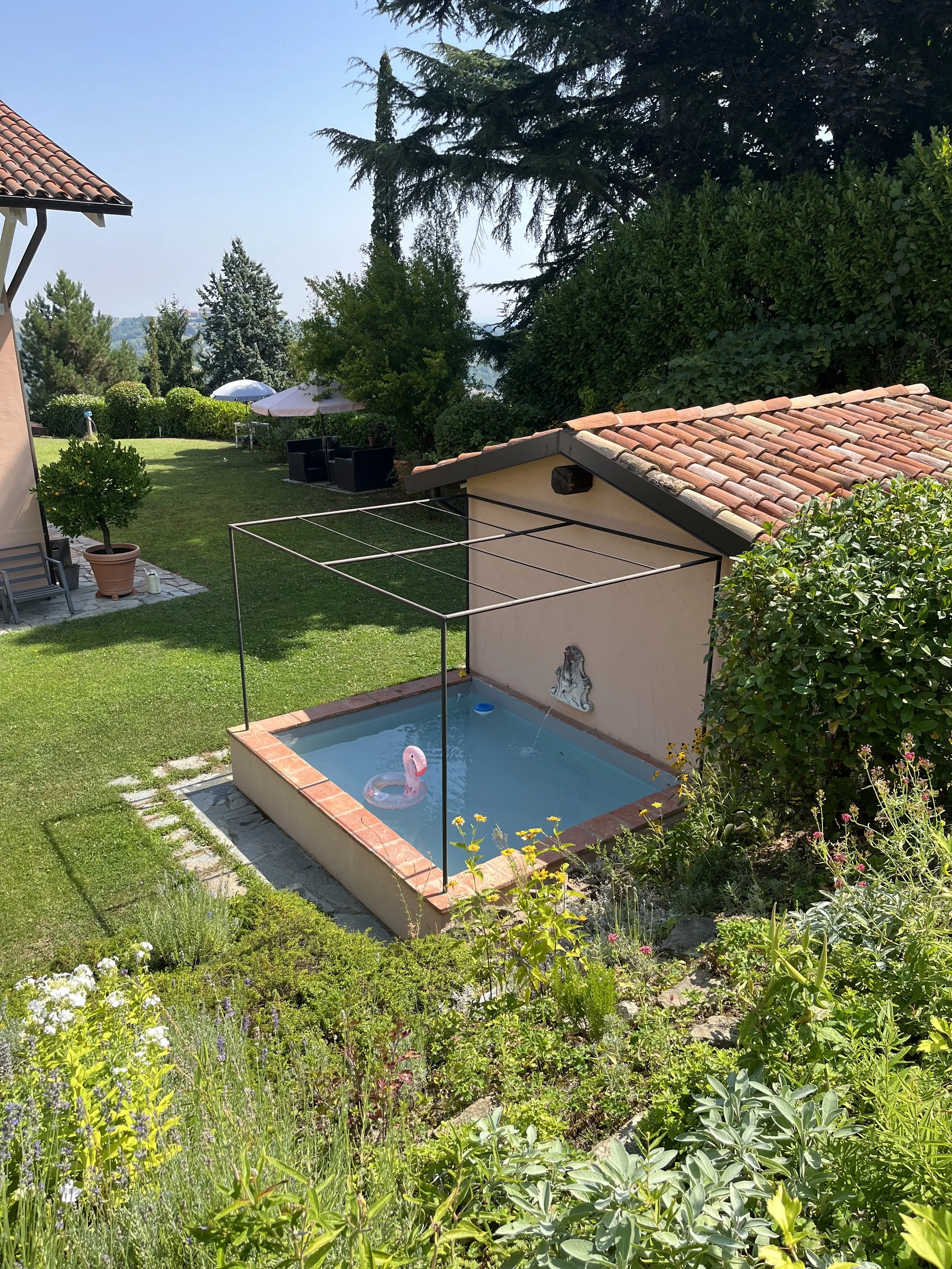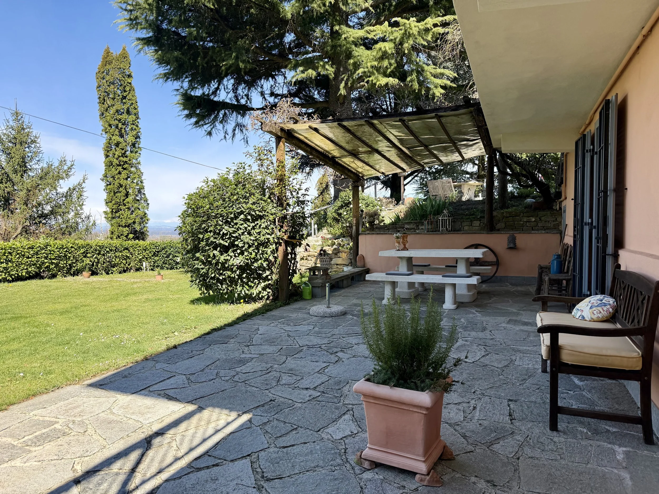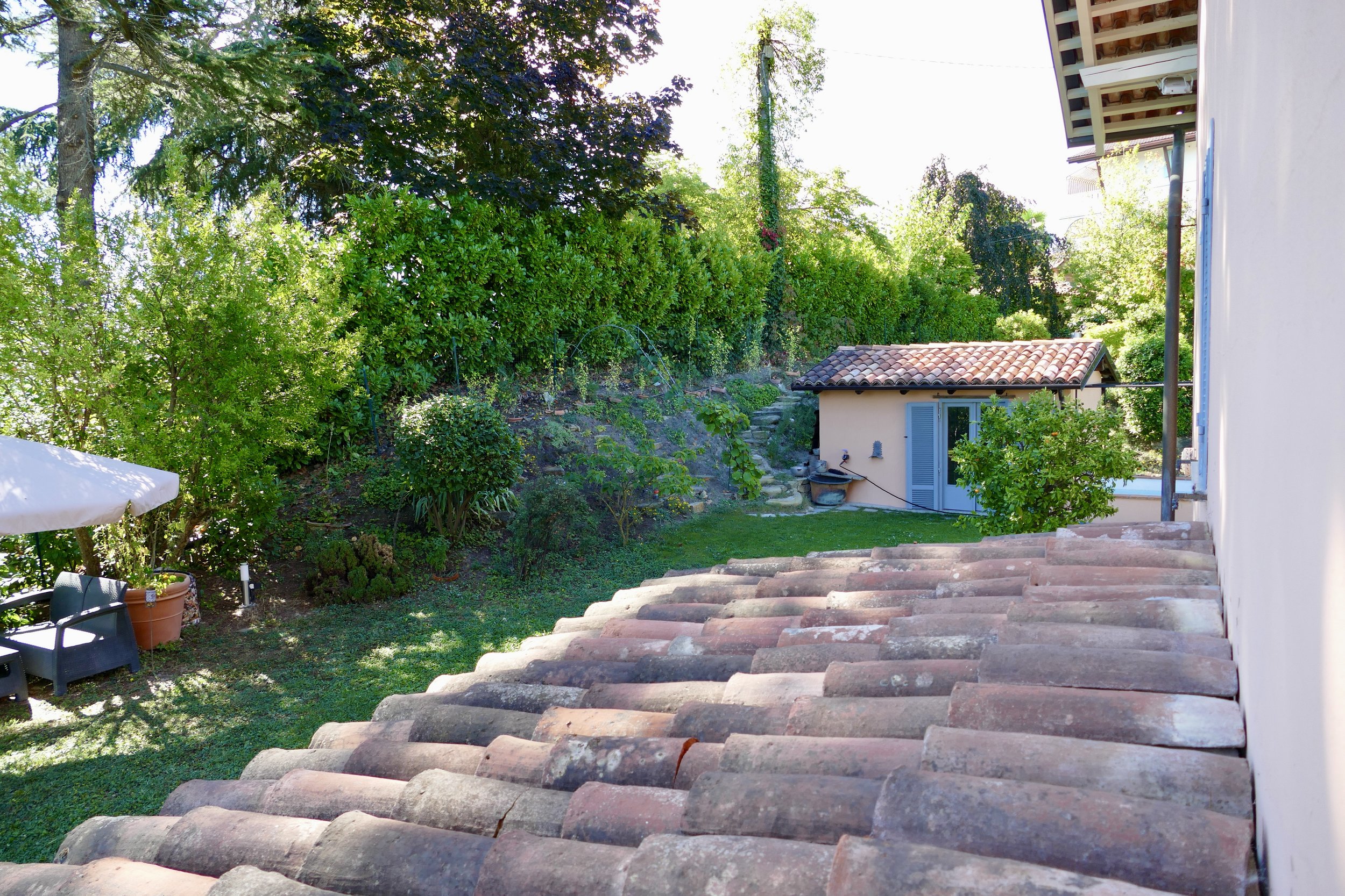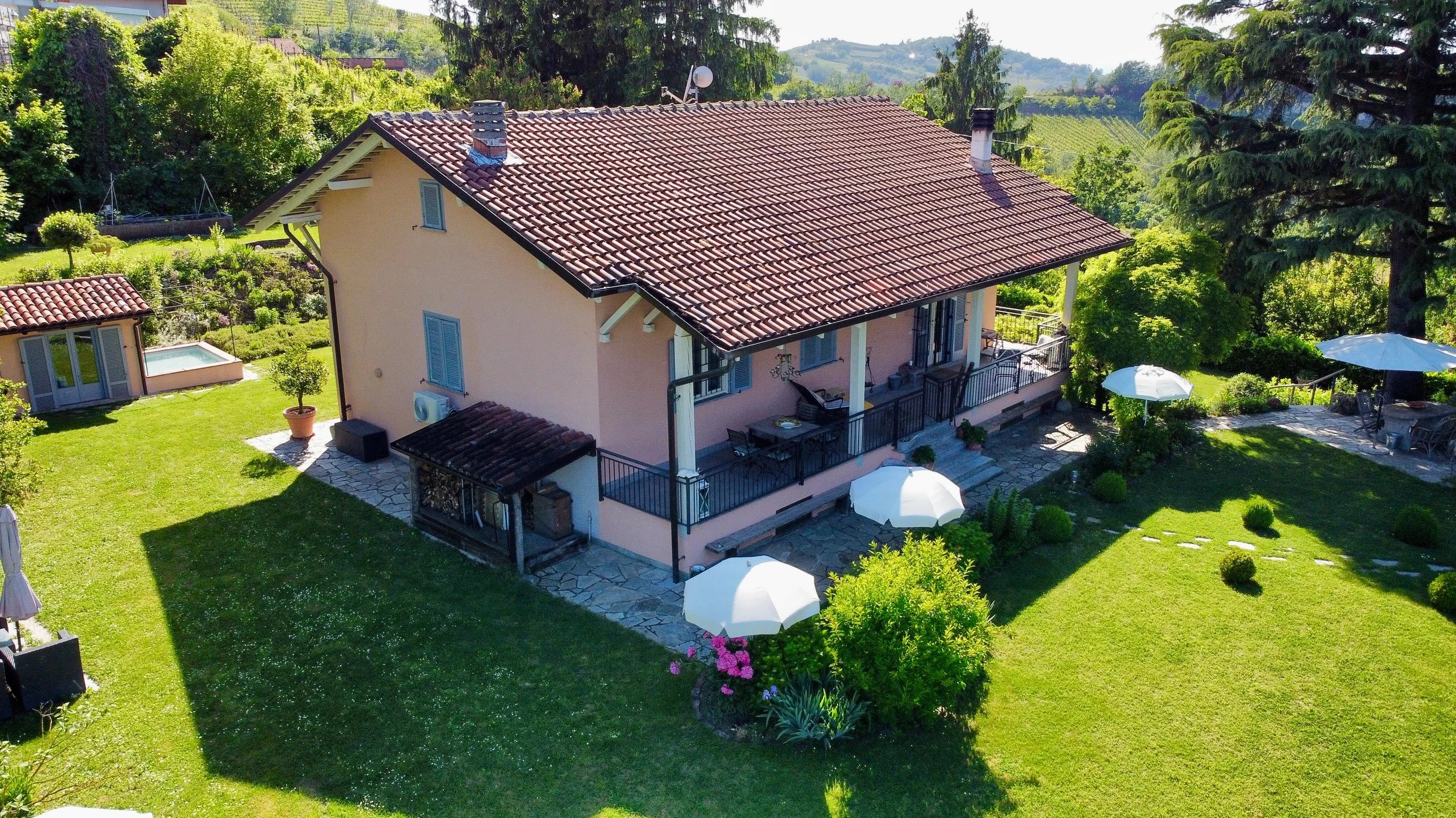 There are many different seating areas in the mature and beautifully landscaped garden. A practical, small outbuilding make the backdrop for the small plunge pool at the south side of the house and external staircases from the wrap-around balcony provide easy access between the house and the garden.
