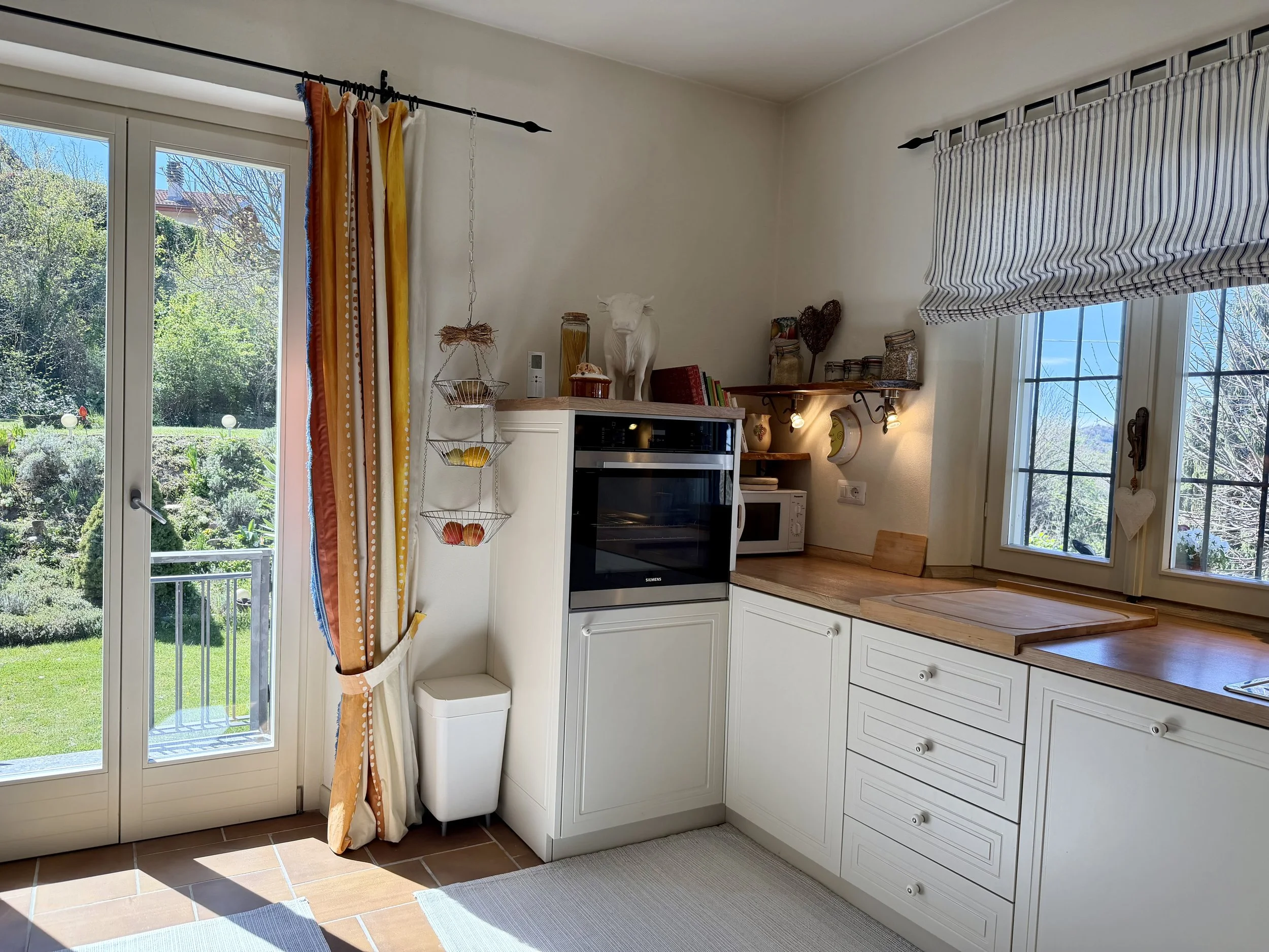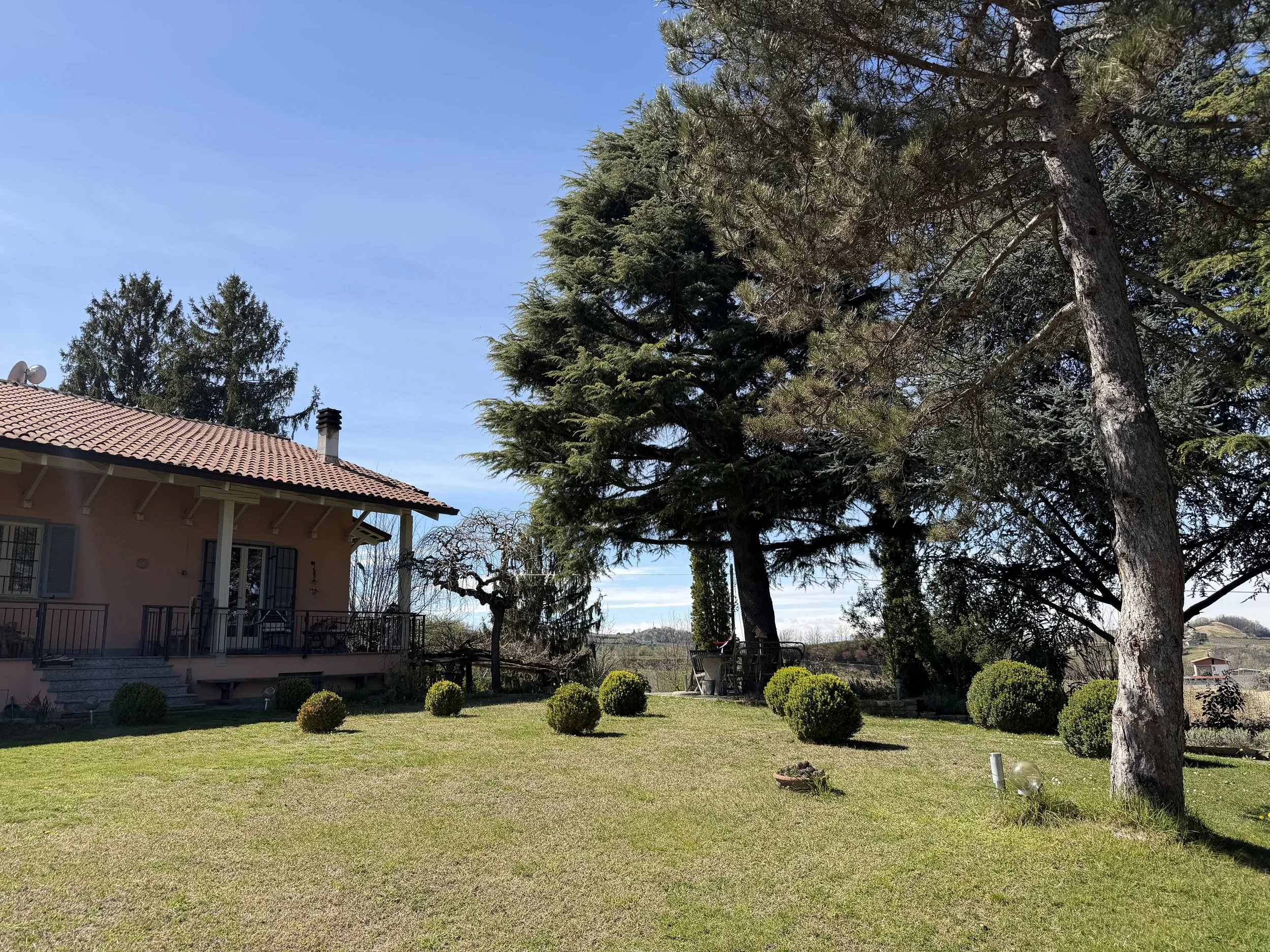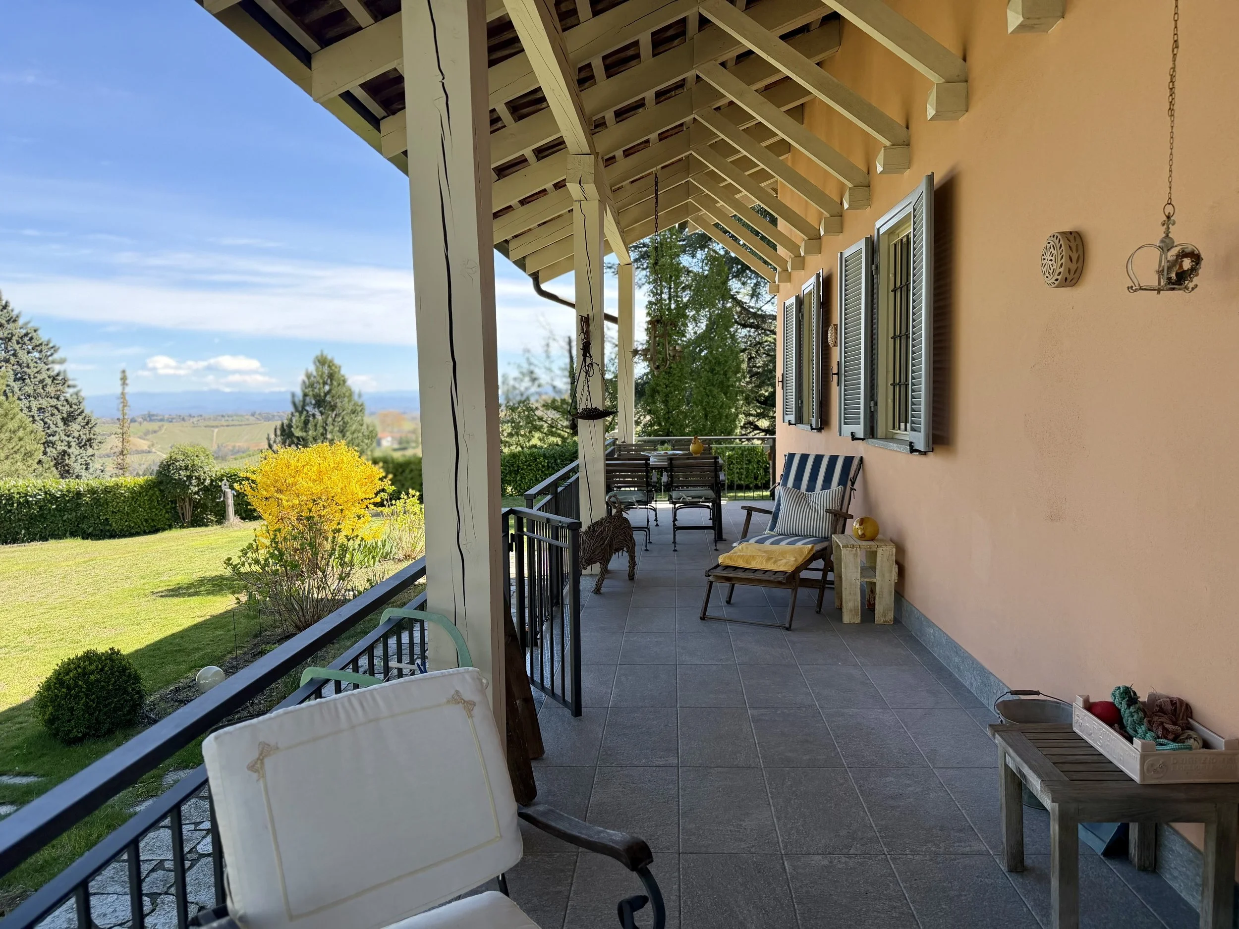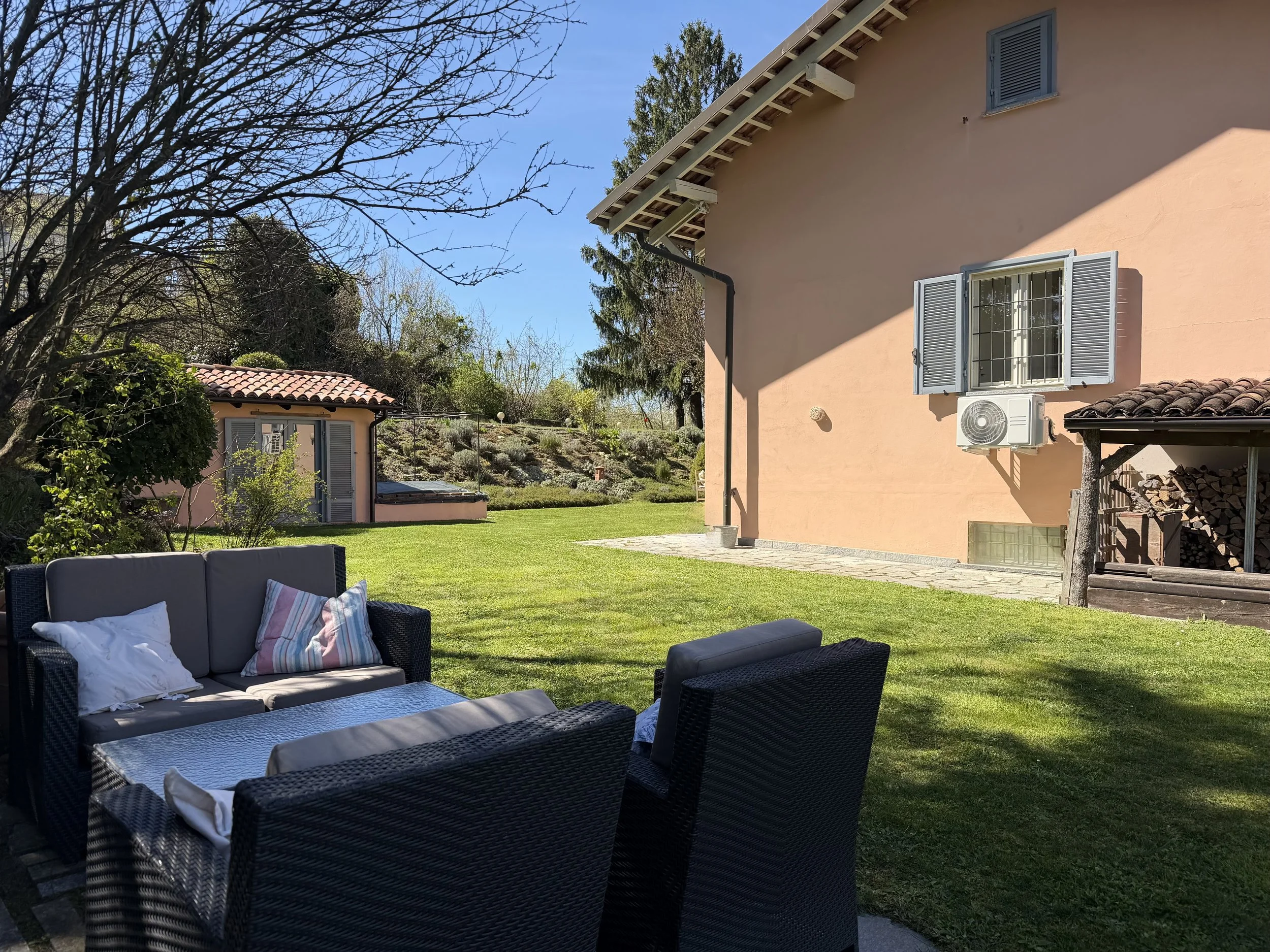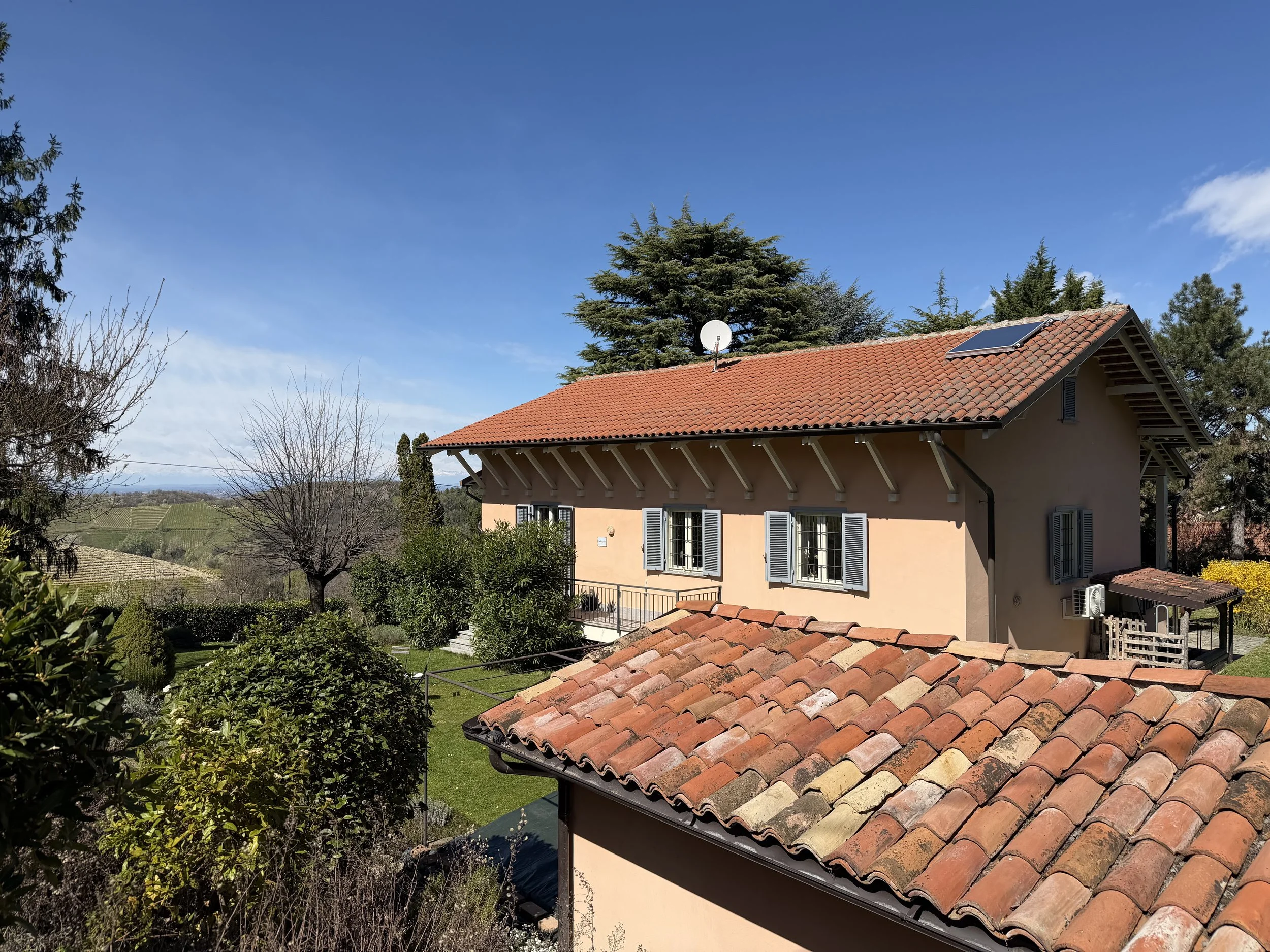 If you are looking to combine stunning views with genuine Italian lifestyle, look no further. This charming house is situated on a hilltop in walking distance to the beautiful village of Montabone with its timeless atmosphere and old stone houses. The village is at 450 m in elevation and from the house you can see the Alps towards the north west and the Ligurian Apennines towards the south east. The property was purchased by the current owner in 2018 and immediately refurbished to its present state. The electrics and plumbing were changed, all external walls insulated, new boiler fitted as well as a solar panel for hot water on the roof. Two new bathrooms were made, new kitchen and air condition units fitted in the ground floor bedroom and living room. On the ground floor is bright open plan kitchen/dining/living room with a wood burning fire place and terrace doors leading out to the back and front garden. This is followed by a double bedroom with ample wardrobe space, a good size bathroom with both a bath tub and walk in shower plus a separate toilet.