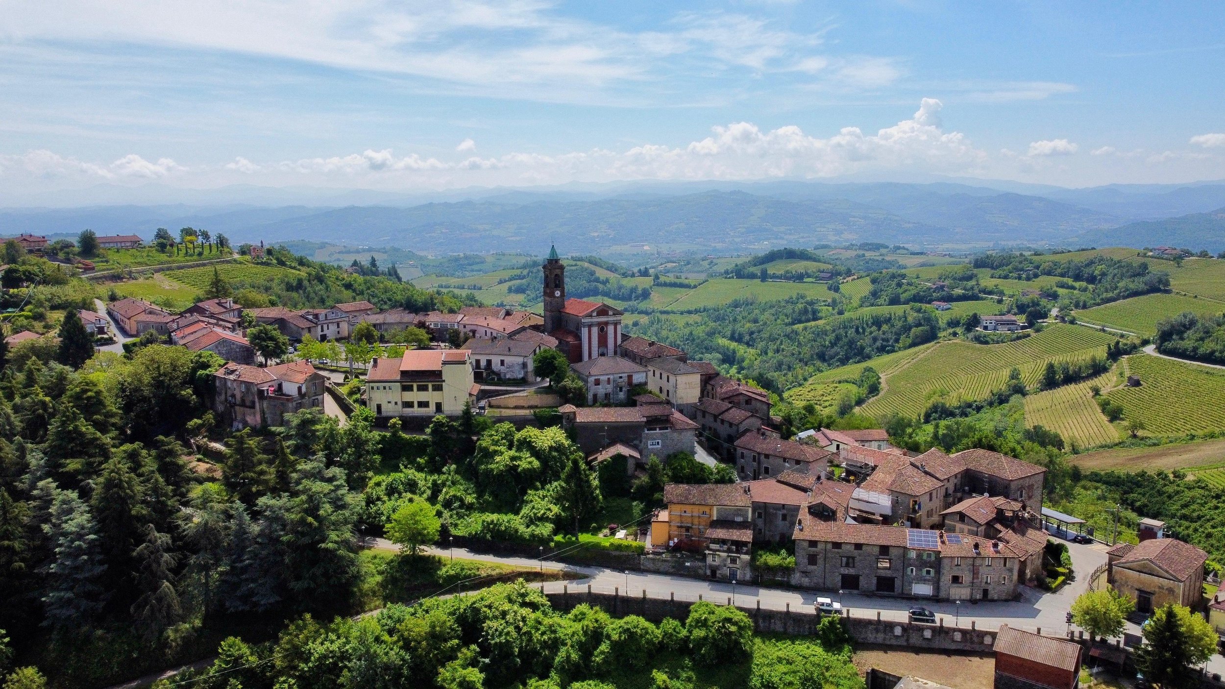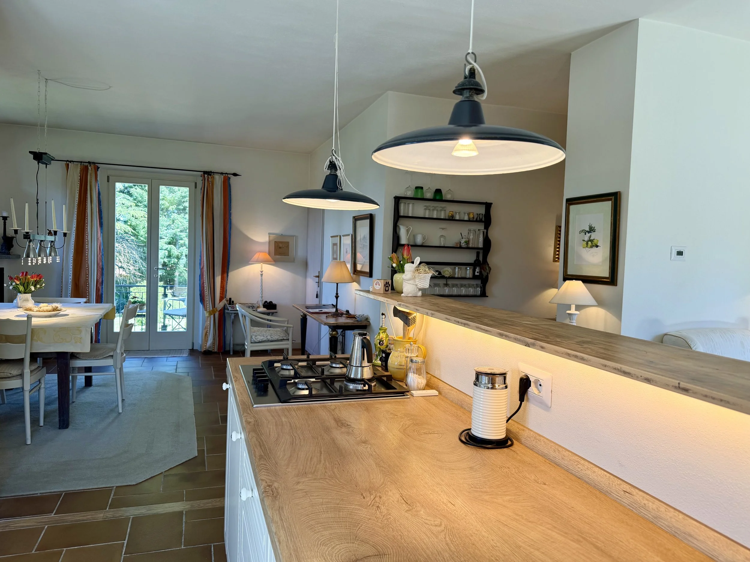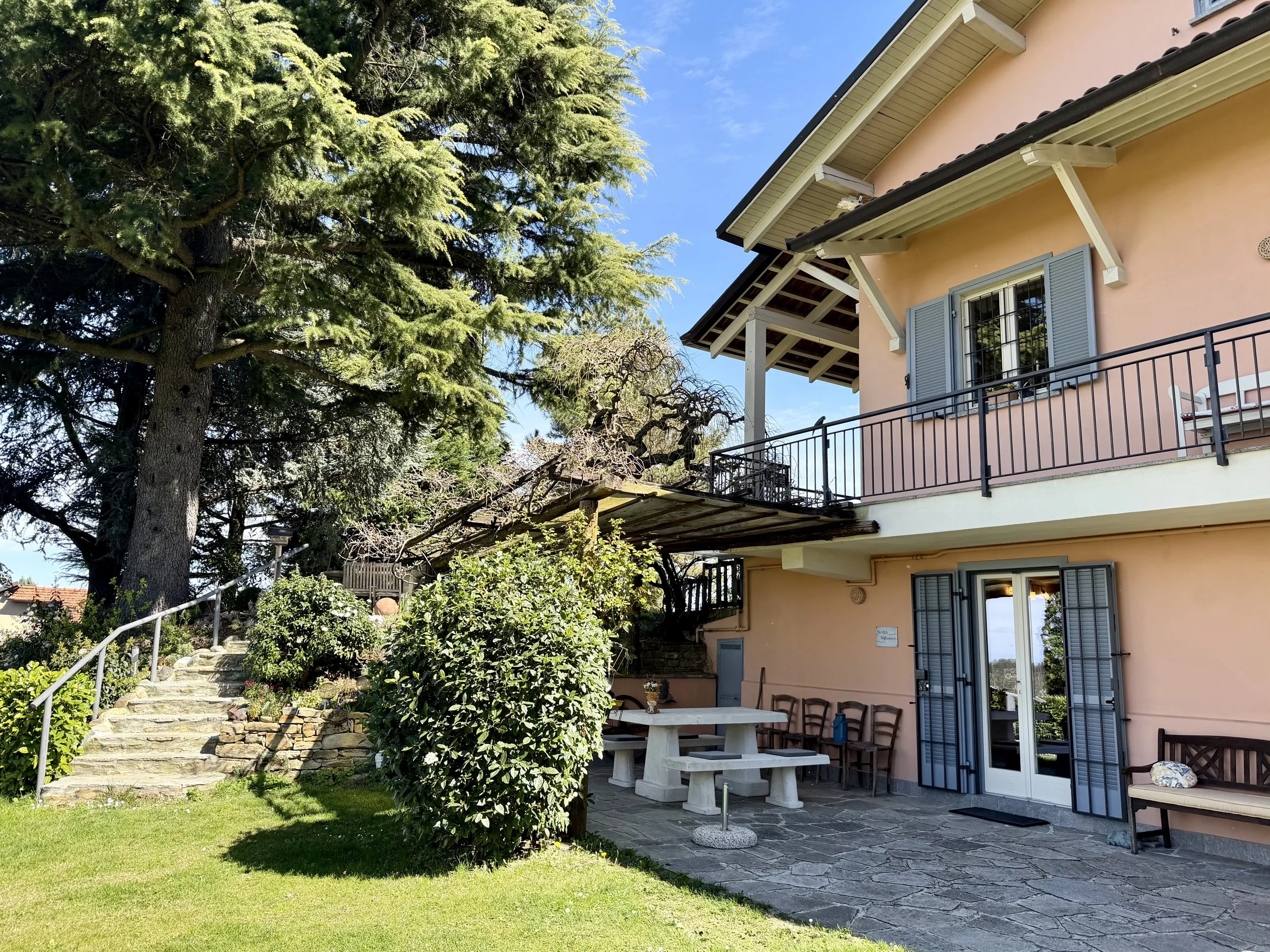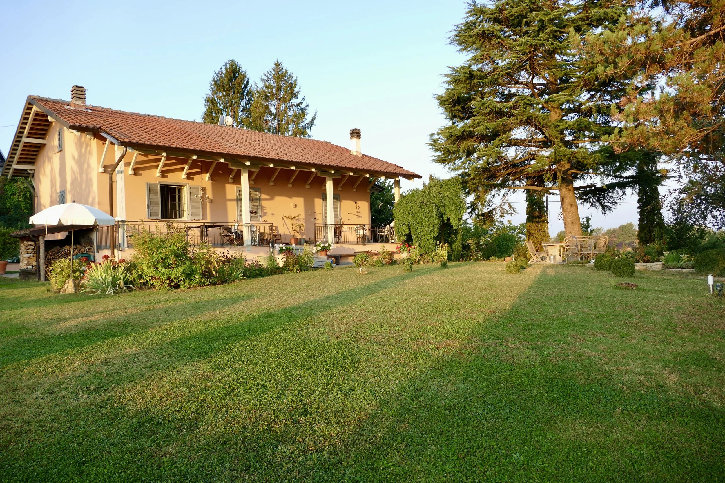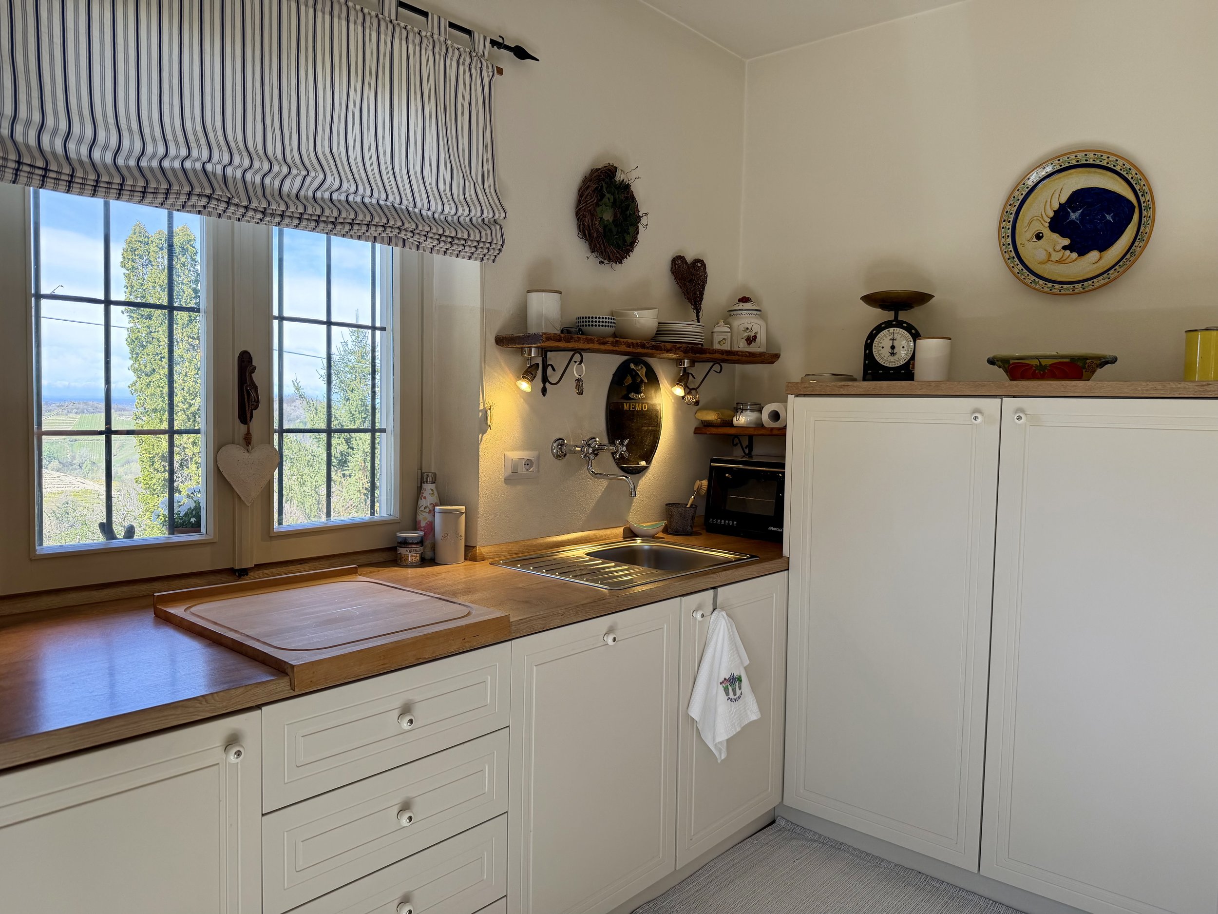 If you are looking to combine stunning views with genuine Italian lifestyle, look no further. This charming house is situated on a hilltop in walking distance to the beautiful village of Montabone with its timeless atmosphere and old stone houses. The village is at 450 m in elevation and from the house you can see the Alps towards the north west and the Ligurian Apennines towards the south east. The property was purchased by the current owner in 2018 and immediately refurbished to its present state. The electrics and plumbing were changed, all external walls insulated, new boiler fitted as well as a solar panel for hot water on the roof. Two new bathrooms were made, new kitchen and air condition units fitted in the ground floor bedroom and living room. On the ground floor is bright open plan kitchen/dining/living room with a wood burning fire place and terrace doors leading out to the back and front garden. This is followed by a double bedroom with ample wardrobe space, a good size bathroom with both a bath tub and walk in shower plus a separate toilet.