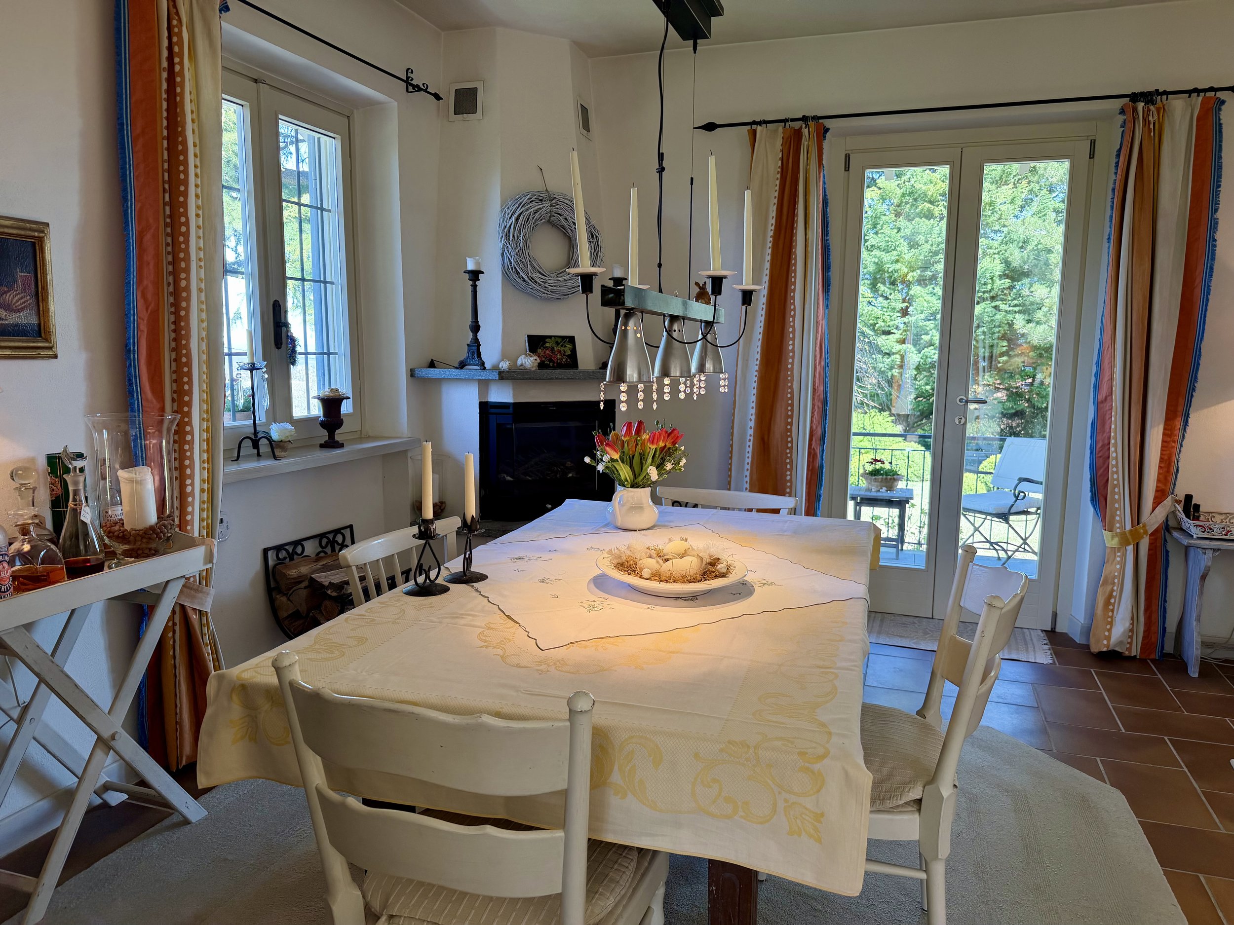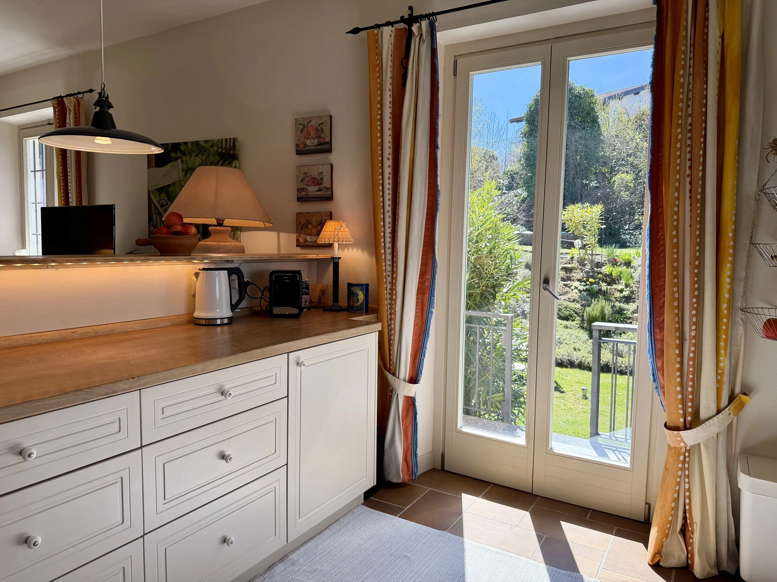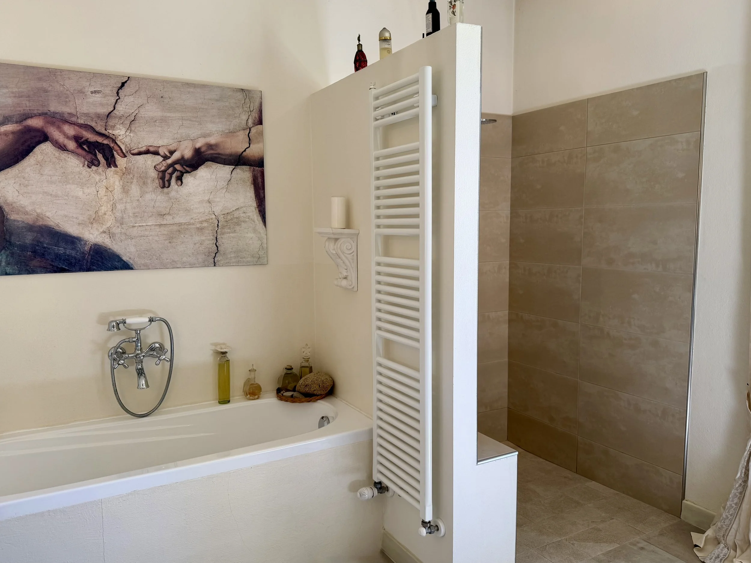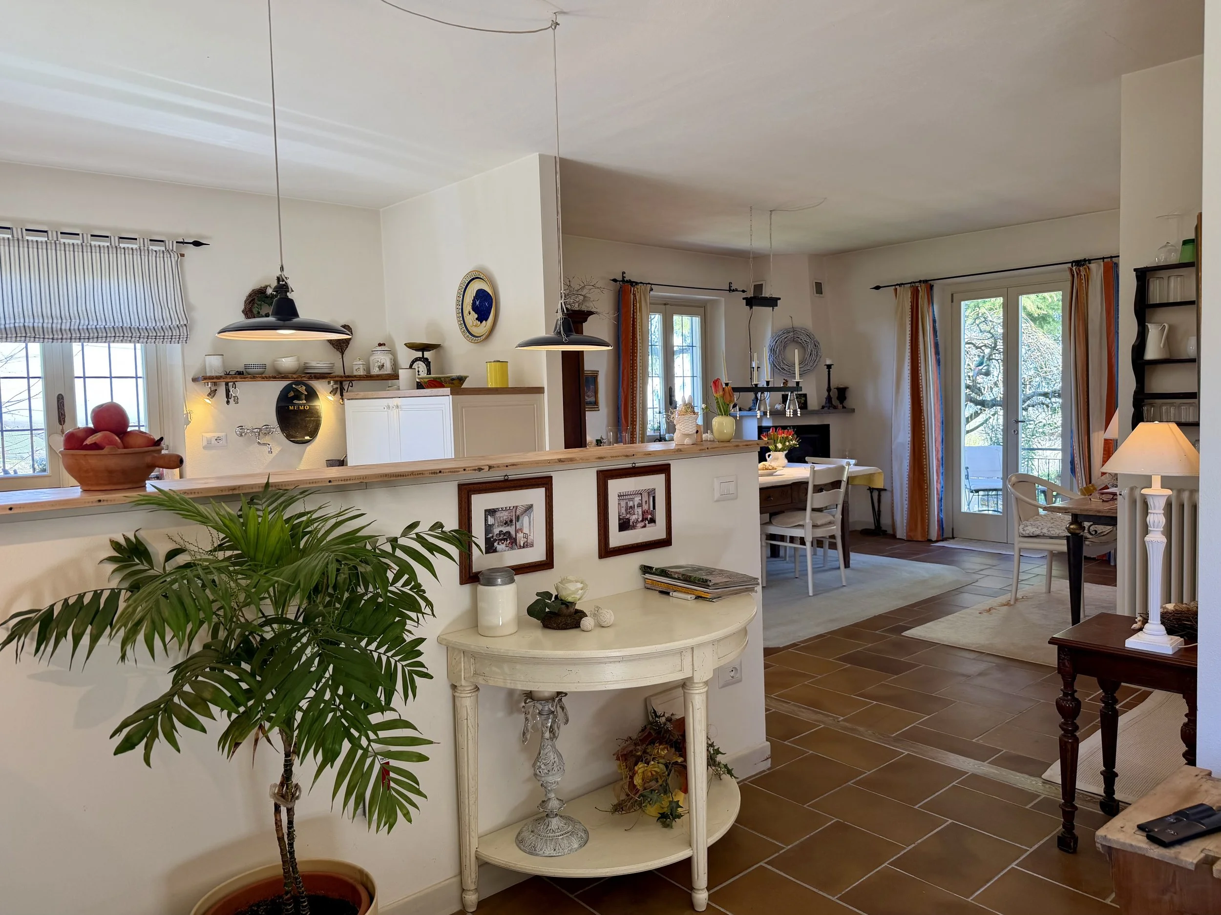 If you are looking to combine stunning views with genuine Italian lifestyle, look no further. This charming house is situated on a hilltop in walking distance to the beautiful village of Montabone with its timeless atmosphere and old stone houses. The village is at 450 m in elevation and from the house you can see the Alps towards the north west and the Ligurian Apennines towards the south east. The property was purchased by the current owner in 2018 and immediately refurbished to its present state. The electrics and plumbing were changed, all external walls insulated, new boiler fitted as well as a solar panel for hot water on the roof. Two new bathrooms were made, new kitchen and air condition units fitted in the ground floor bedroom and living room. On the ground floor is bright open plan kitchen/dining/living room with a wood burning fire place and terrace doors leading out to the back and front garden. This is followed by a double bedroom with ample wardrobe space, a good size bathroom with both a bath tub and walk in shower plus a separate toilet.
