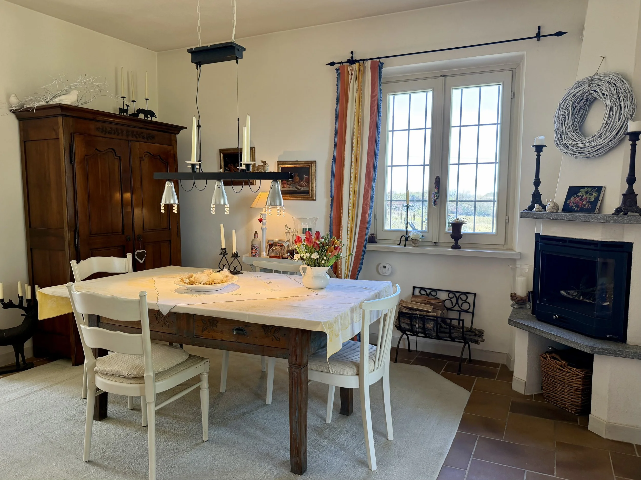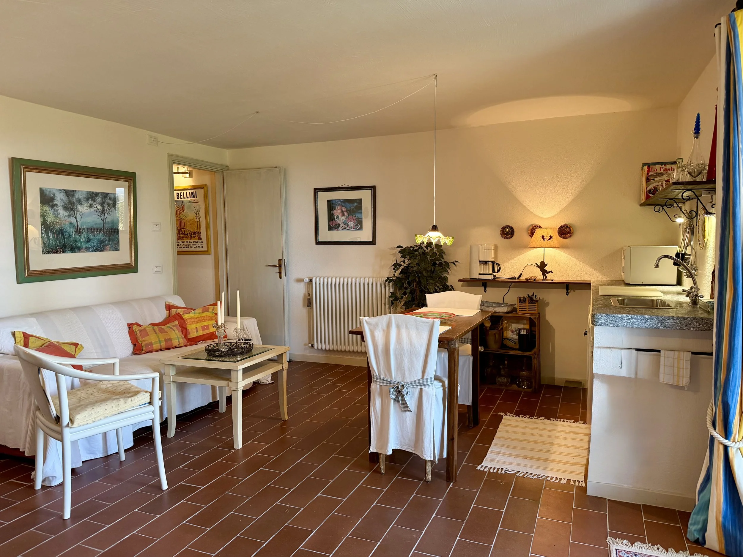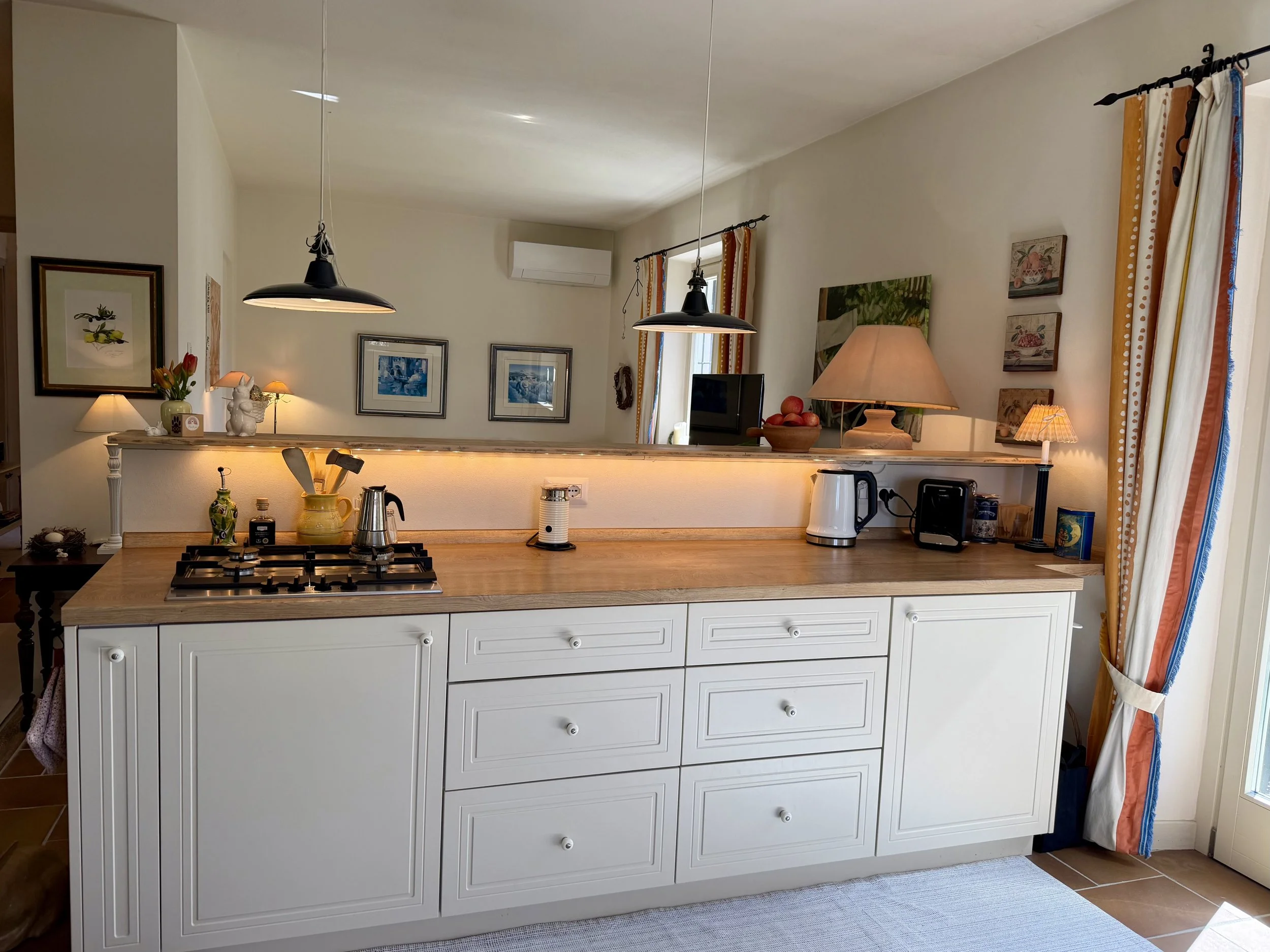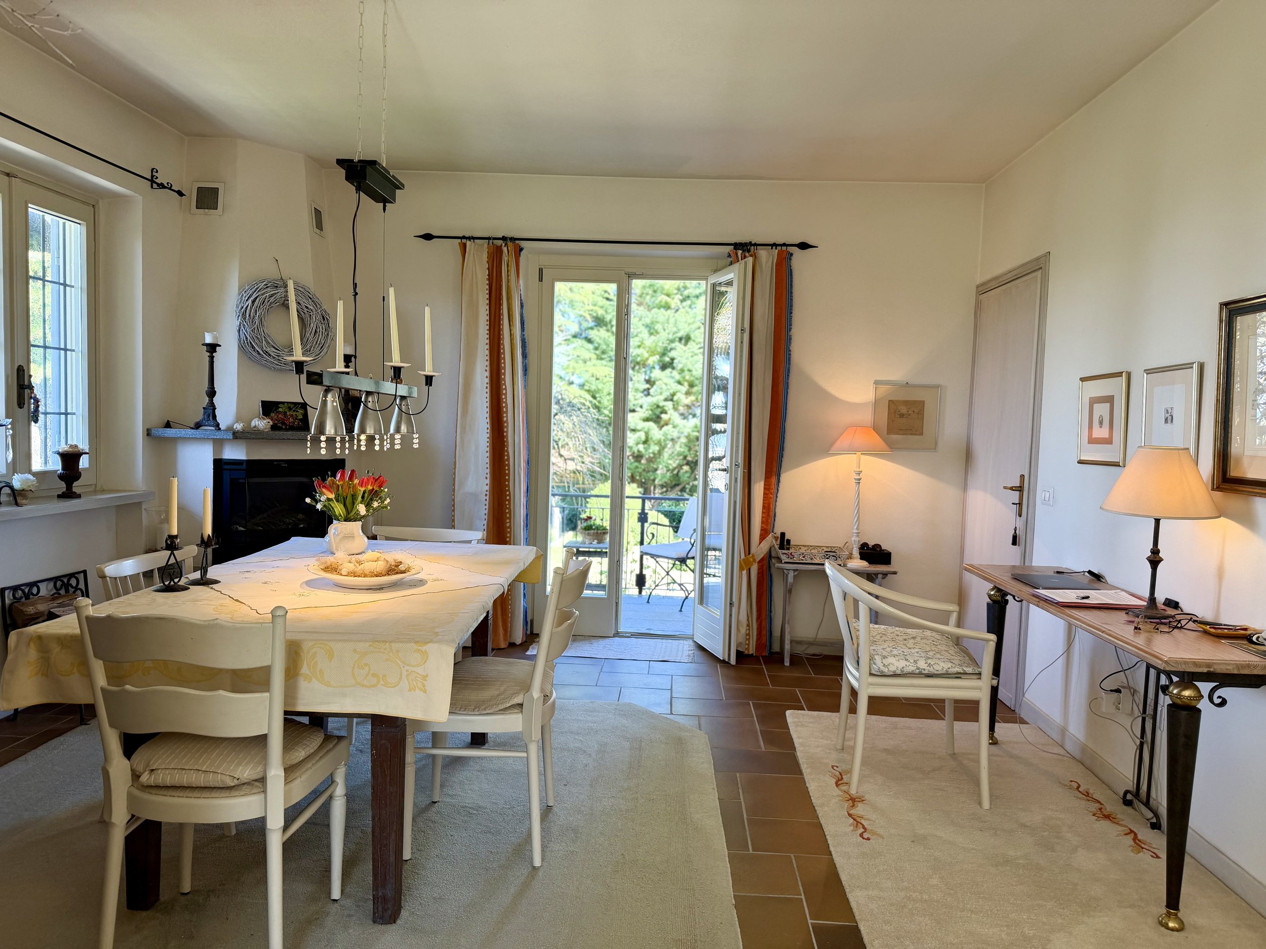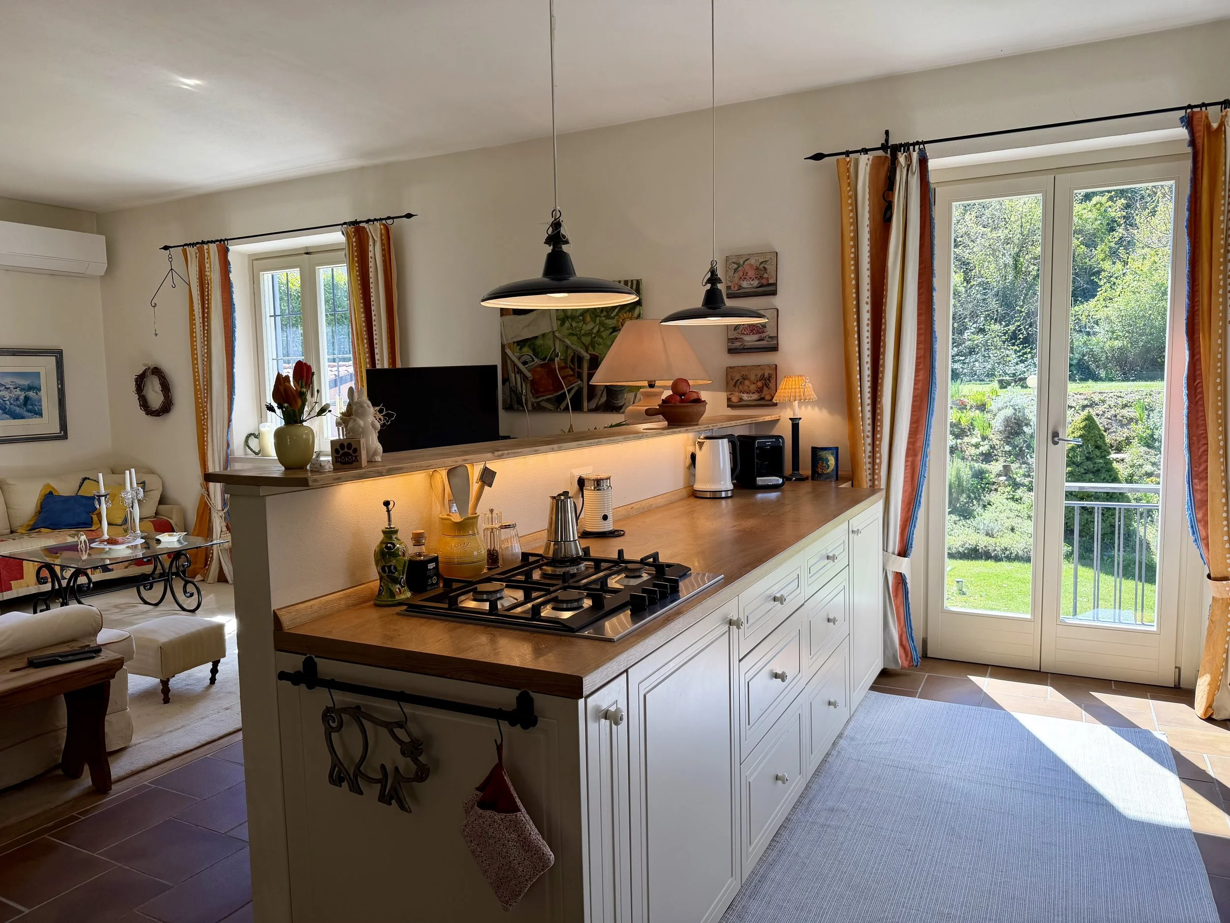 If you are looking to combine stunning views with genuine Italian lifestyle, look no further. This charming house is situated on a hilltop in walking distance to the beautiful village of Montabone with its timeless atmosphere and old stone houses. The village is at 450 m in elevation and from the house you can see the Alps towards the north west and the Ligurian Apennines towards the south east. The property was purchased by the current owner in 2018 and immediately refurbished to its present state. The electrics and plumbing were changed, all external walls insulated, new boiler fitted as well as a solar panel for hot water on the roof. Two new bathrooms were made, new kitchen and air condition units fitted in the ground floor bedroom and living room. On the ground floor is bright open plan kitchen/dining/living room with a wood burning fire place and terrace doors leading out to the back and front garden. This is followed by a double bedroom with ample wardrobe space, a good size bathroom with both a bath tub and walk in shower plus a separate toilet.