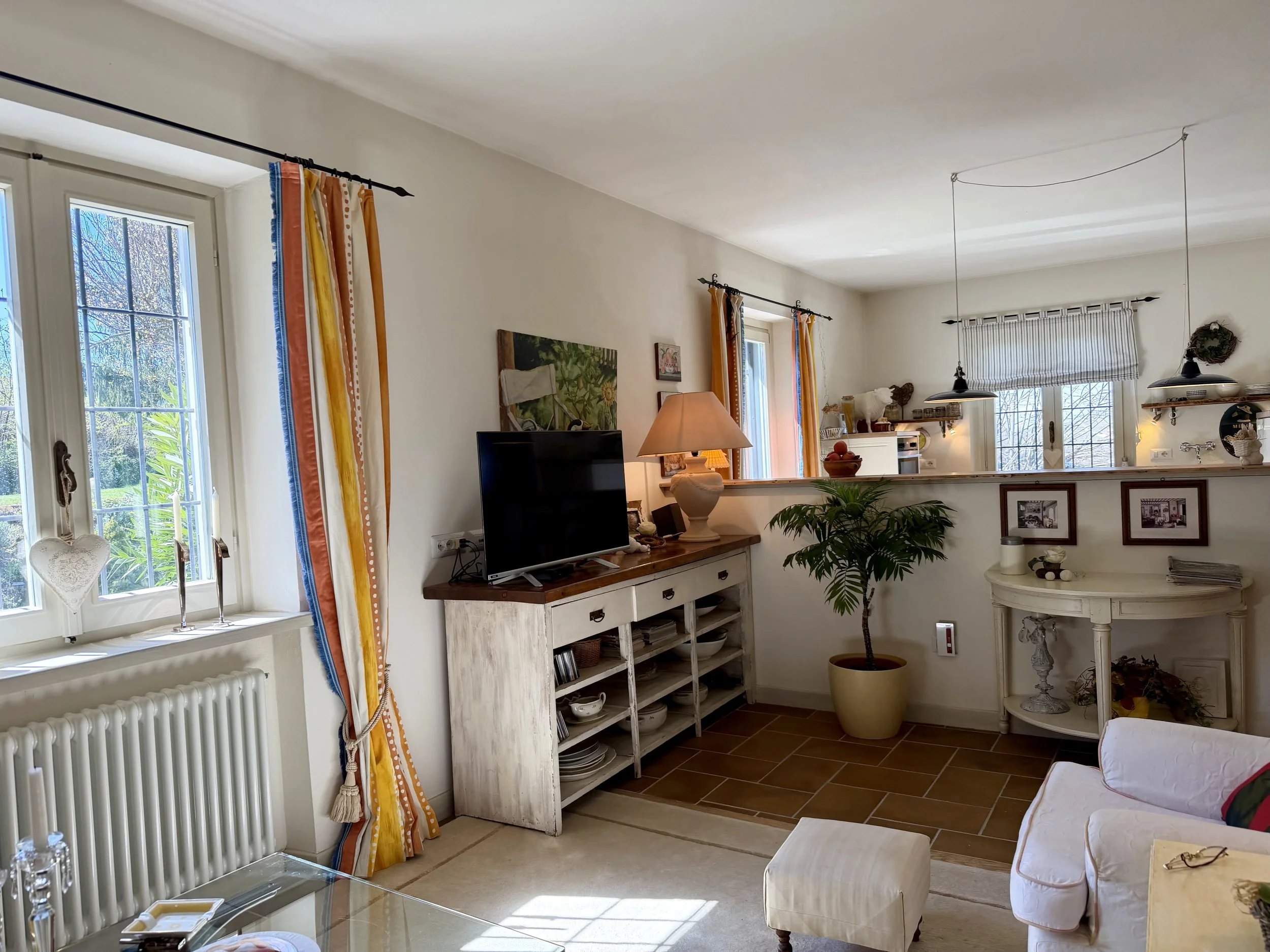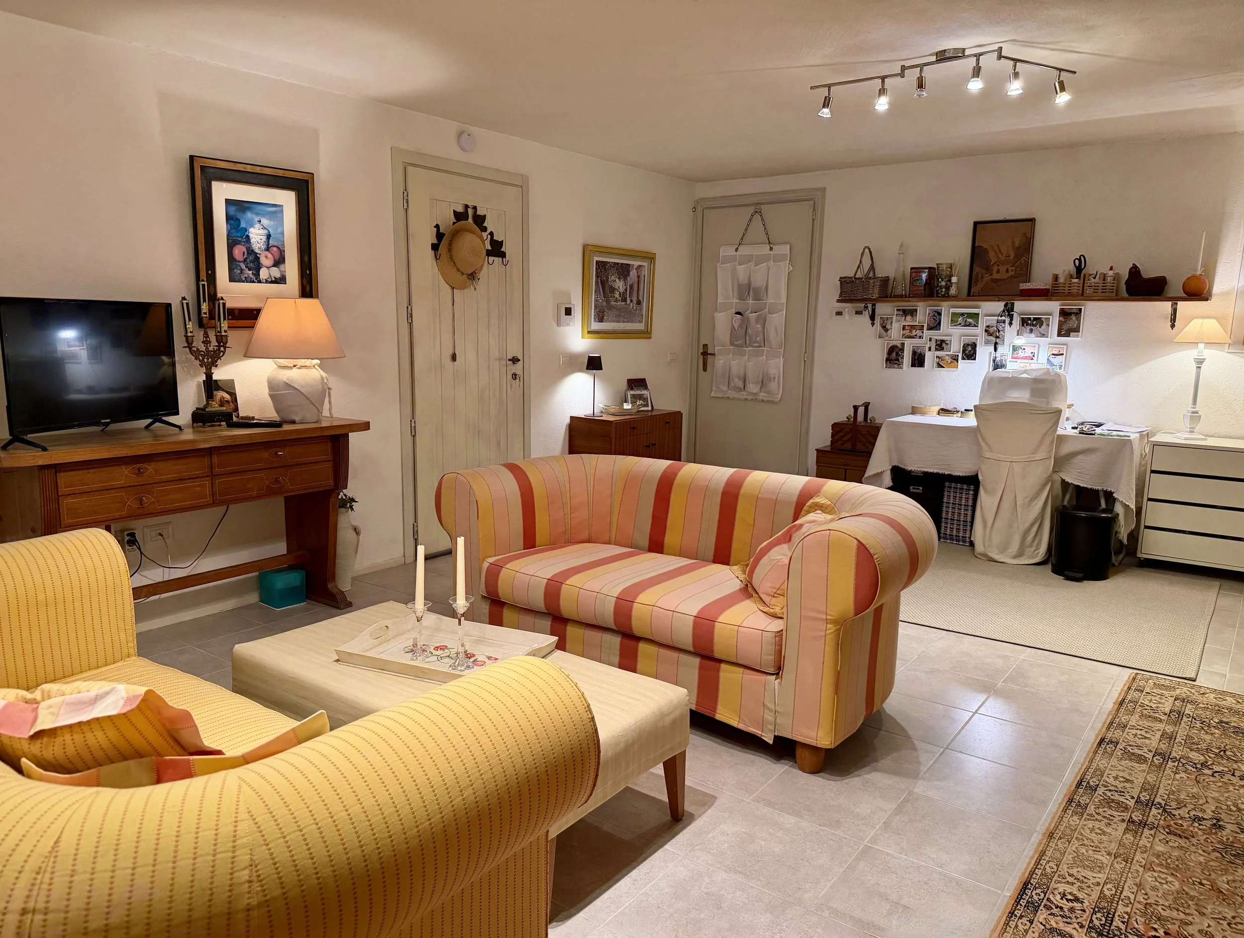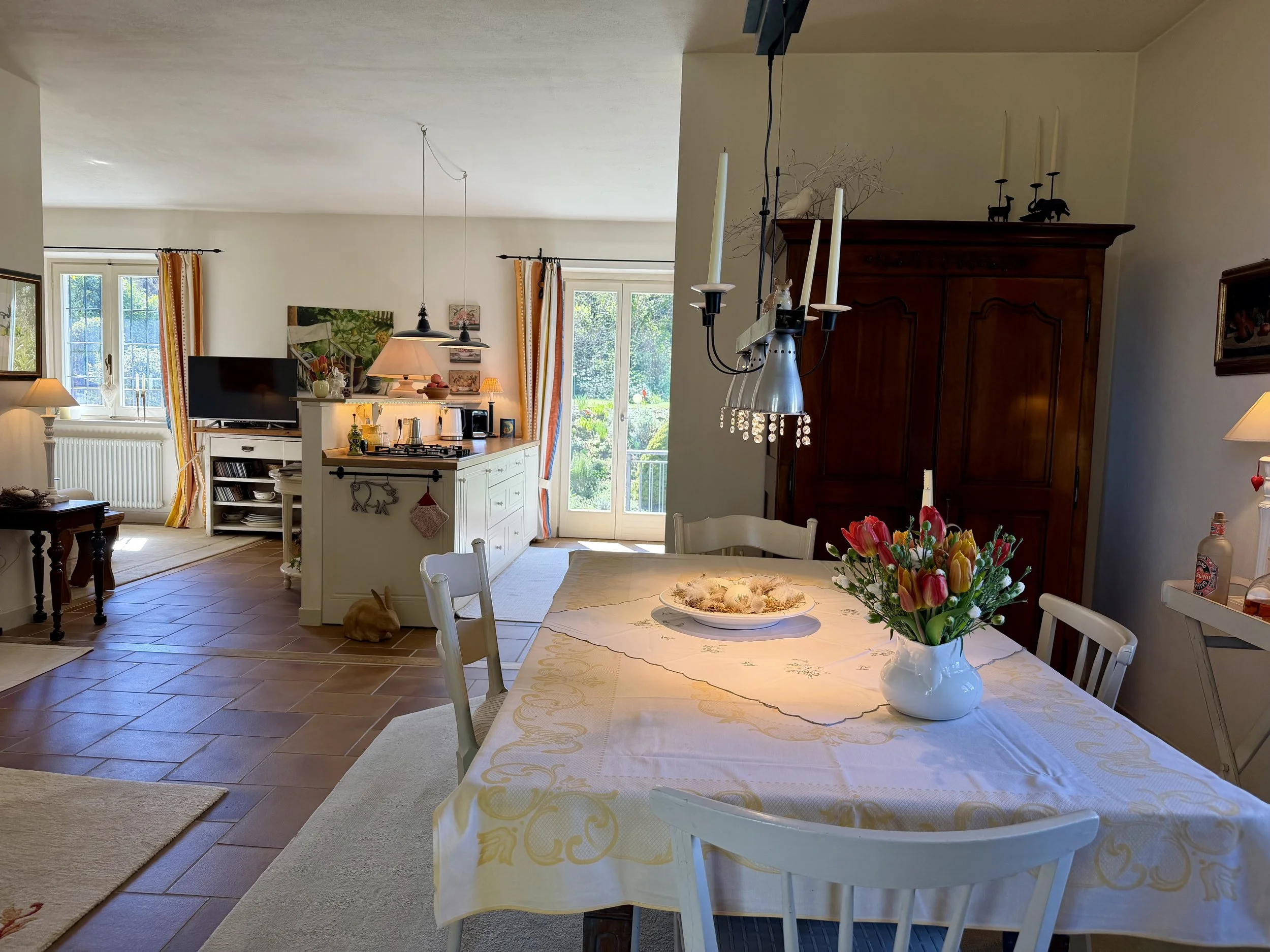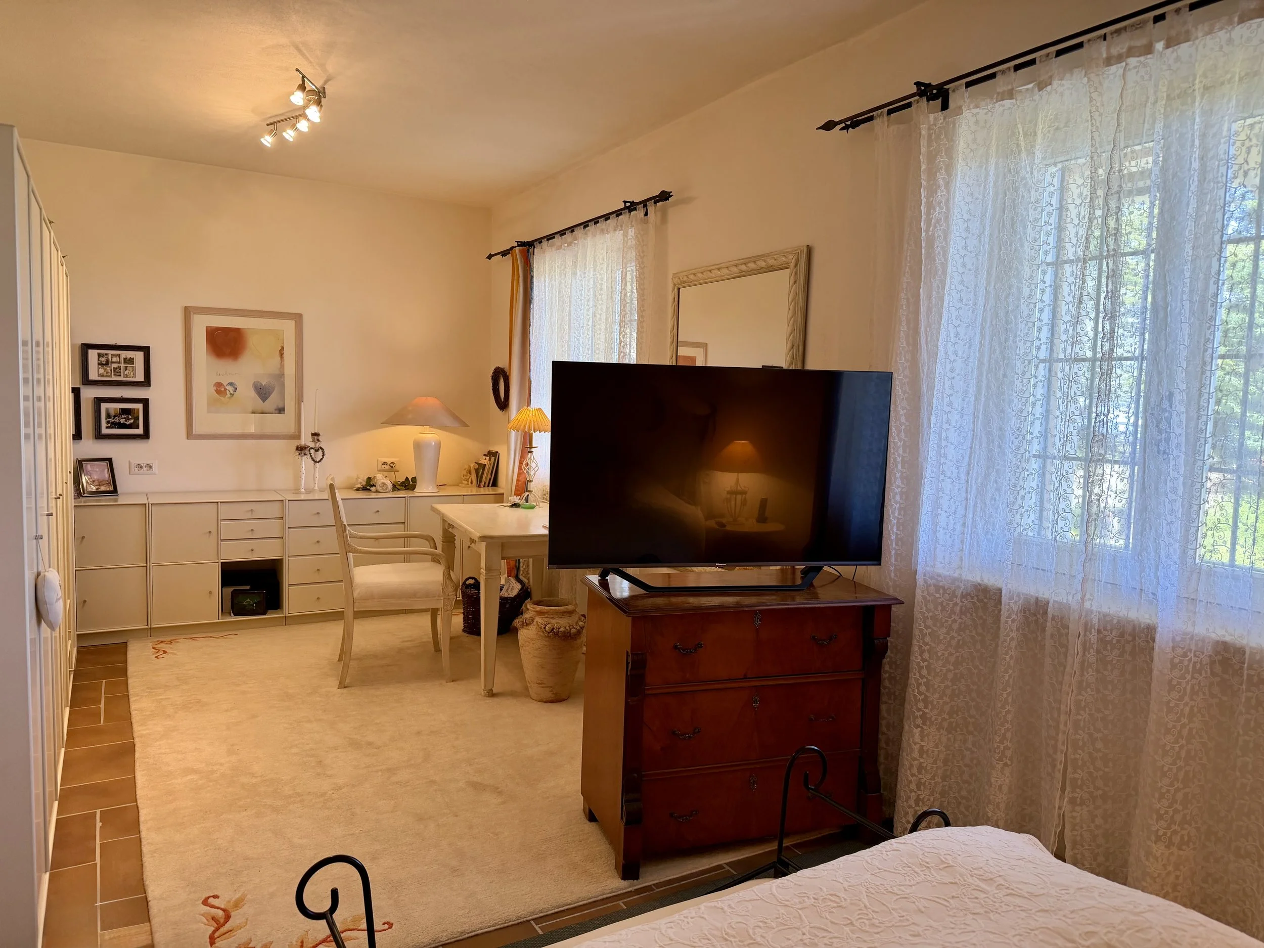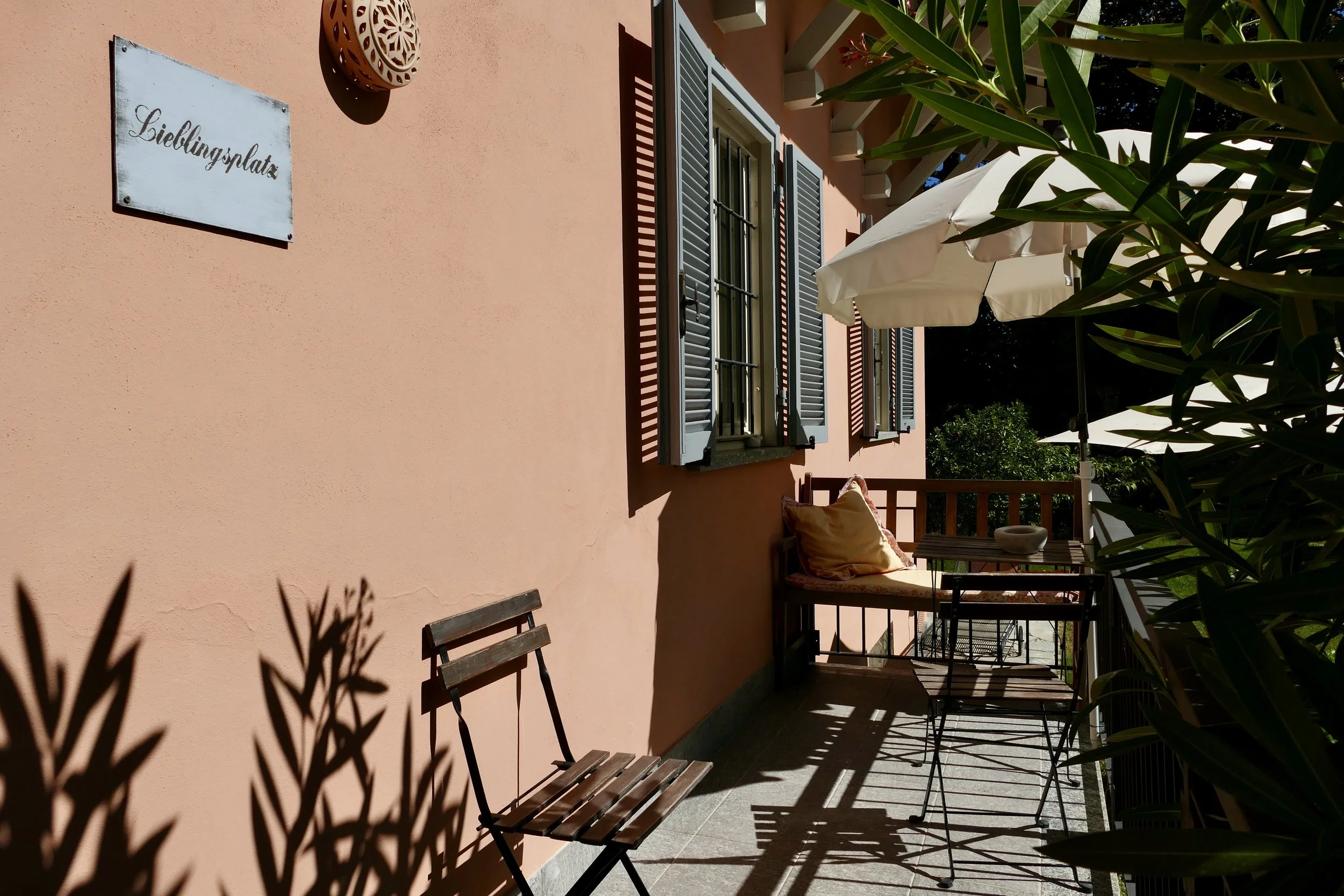 On the lower ground floor is a studio-apartment with kitchenette, seating area and a double bed, followed by an ensuite bathroom with shower cubicle. You can enter the studio-apartment directly from outside or via an internal staircase leading down from the first floor living room. Further on the lower ground floor is a combined sitting room/work space, a laundry room and a garage. The garage and its storage area has an interconnecting door to the downstairs sitting room/work space. Outside the entrance to the studio-apartment is a plant covered seating/dining area with a stone staircase leading from there up to the garden on the ground floor level of the house. Long balcony terraces are wrapped around 3 sides of the house to ensure that you always can decide if you want to sit in the sun or the shade whilst enjoying the beautiful plants and flowers in the garden or the splendid views over the surrounding landscape.