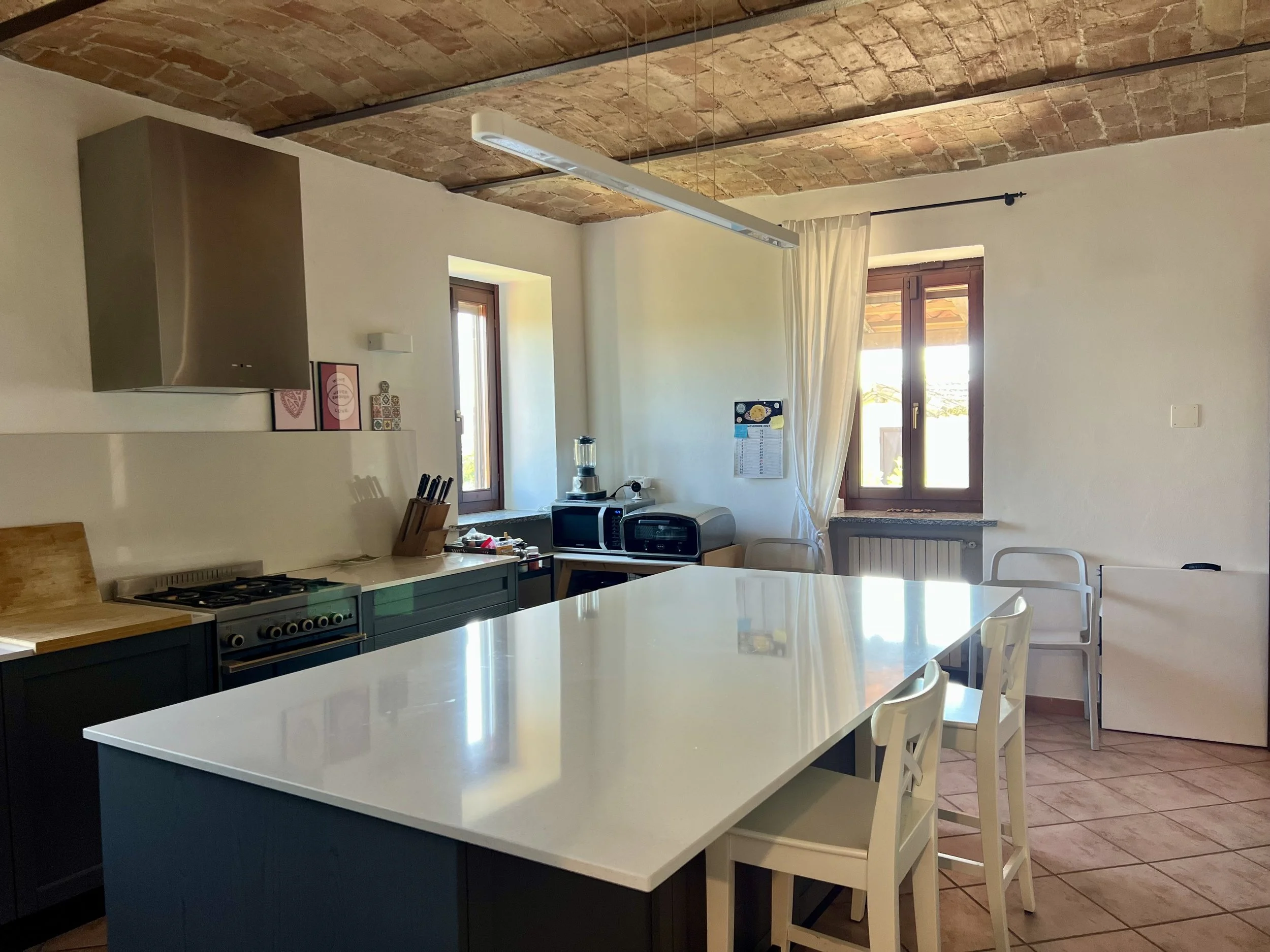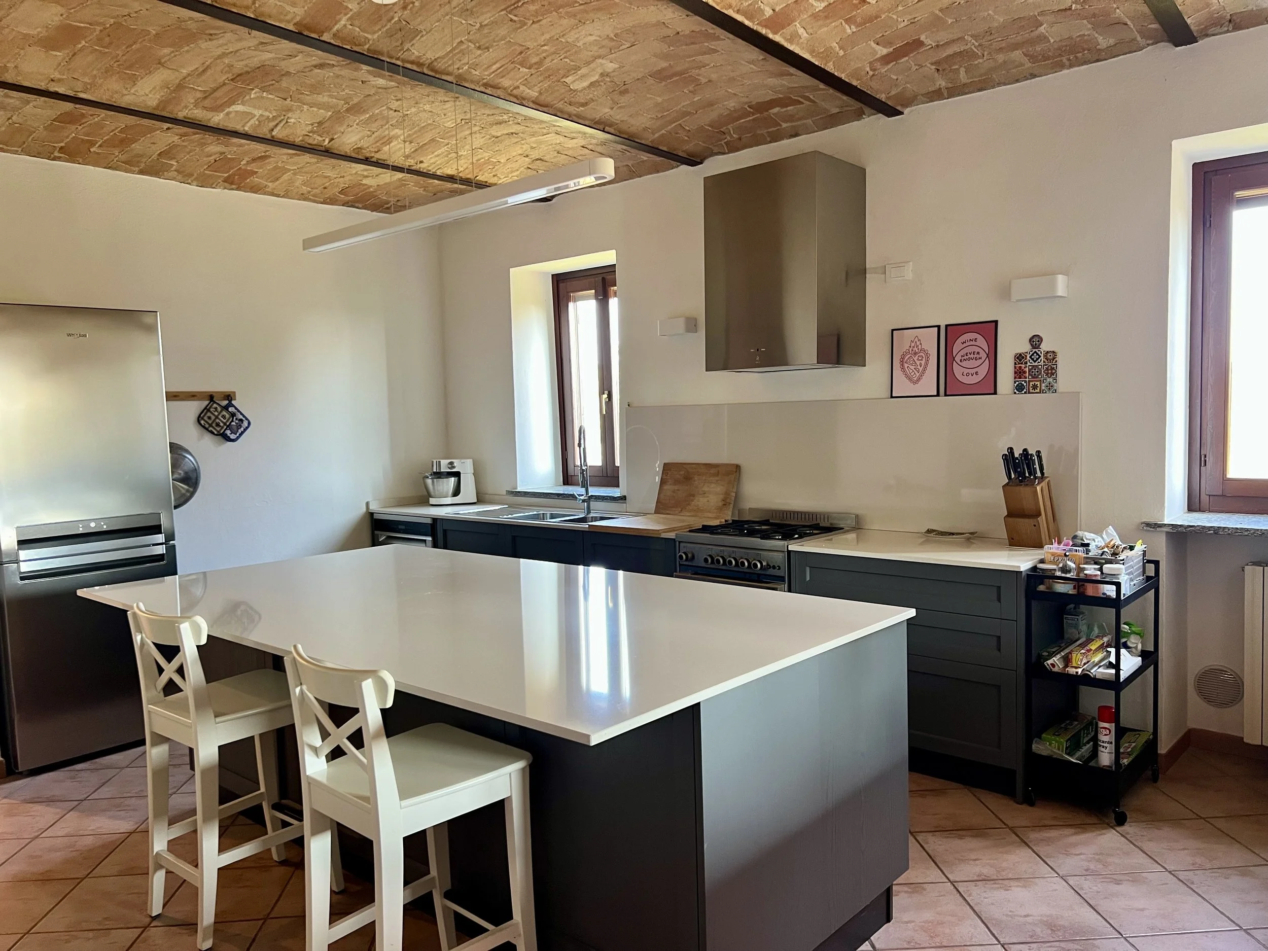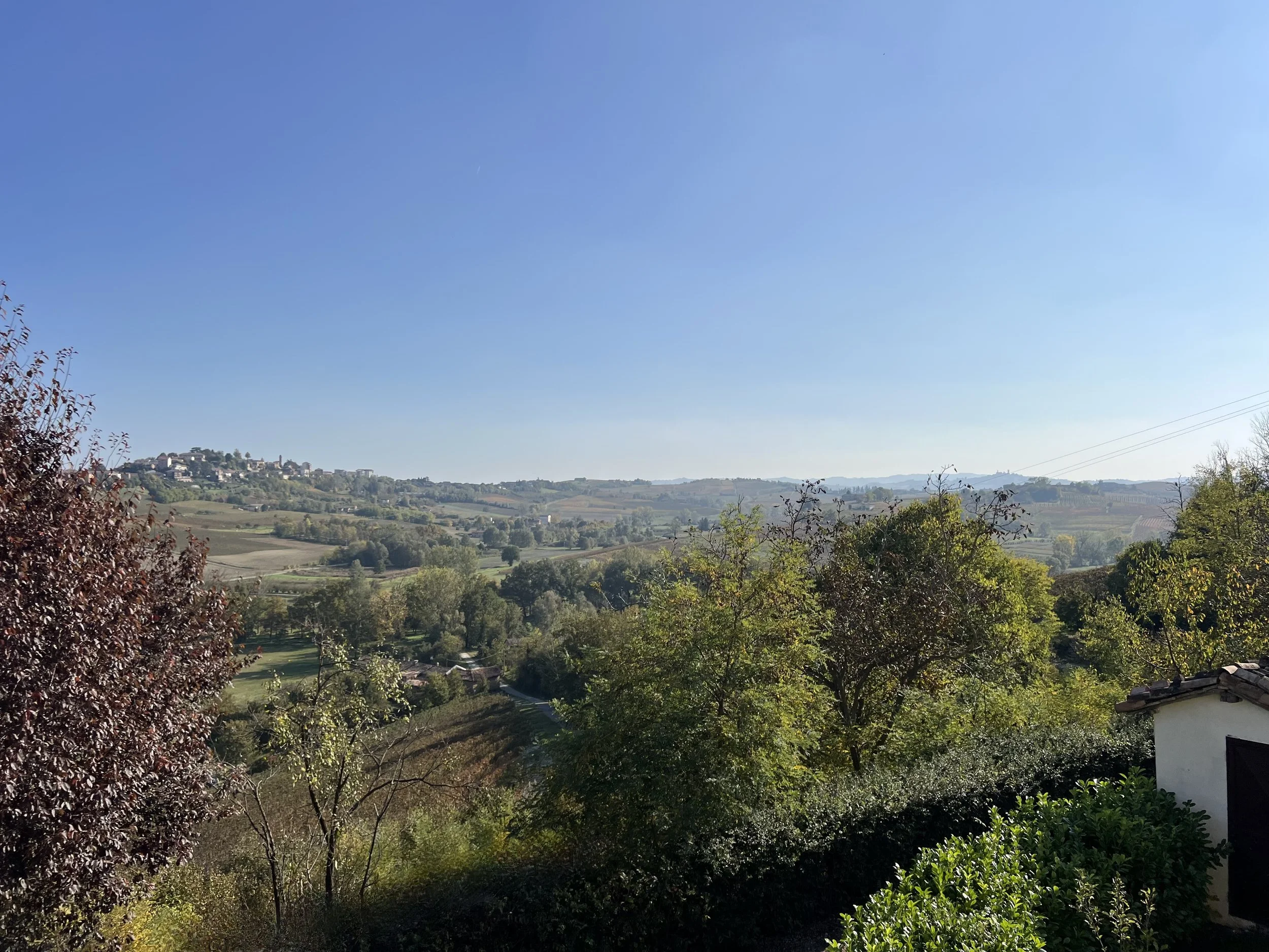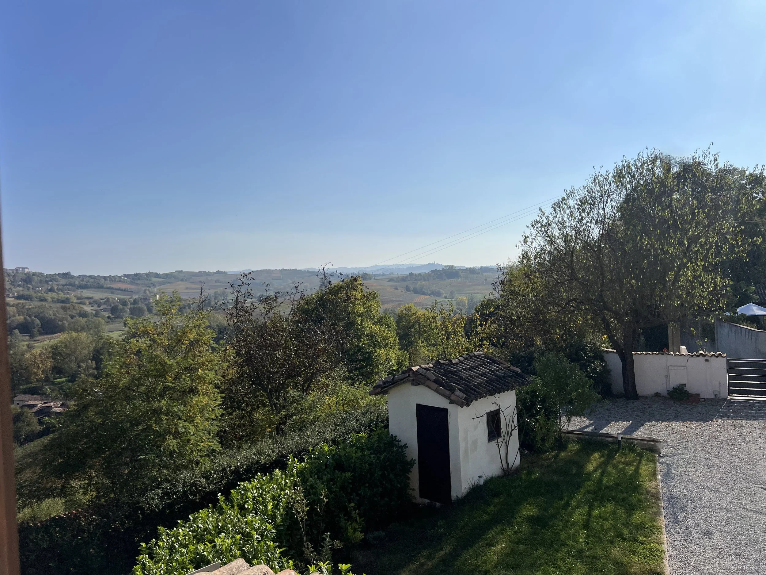 This charming property is situated on the hilltop between the popular villages of Agliano Terme and Montegrosso. Full of character and stylethis house has much to offer; lots of original details in a modern and fresh setting. The kitchen is brand new and the central heating as well as the electric system is very recently changed. On the ground floor is a very cosy living room with a large, open wood burning fire place (in frequent use in the winter months) followed by the stylish new kitchen with its island unit. Then there is a guest bathroom/laundry room and an east facing breakfast terrace next to the kitchen, a great spot to start the day overlooking the beautiful countryside and the hilltop villages. On the first floor are three double bedrooms, all with air-condition units plus a family bathroom with a bath tub and shower cubicle. There are old cotto tiles on the floors and the windows have fly screens and newly painted shutters. On the lower ground floor is a big and beautiful vaulted wine cellar in exposed bricks. There is also a storage room, a technical room and an oversized garage. An internal staircase leads from the ground floor to the garage and cellar. You enter the property through a new and modern electric gate. There is a brick wall dividing the courtyard and front garden from the neighbour. The garden has watering system installed and a nice little storage unit on the lawn in the front of the main facade. A lovely portico is running along the main facade, providing shade for the seating area. The garden has space for a swimming pool and the location is tranquil and in short distance to the centre of the village of Agliano Terme with all its services.