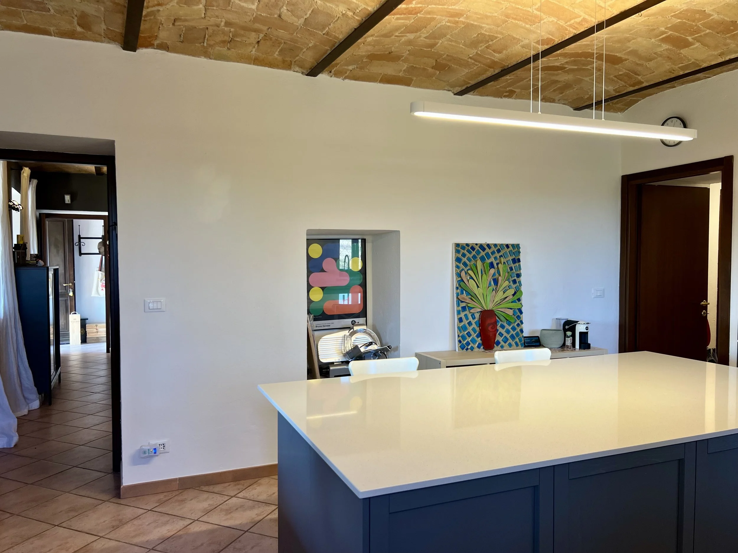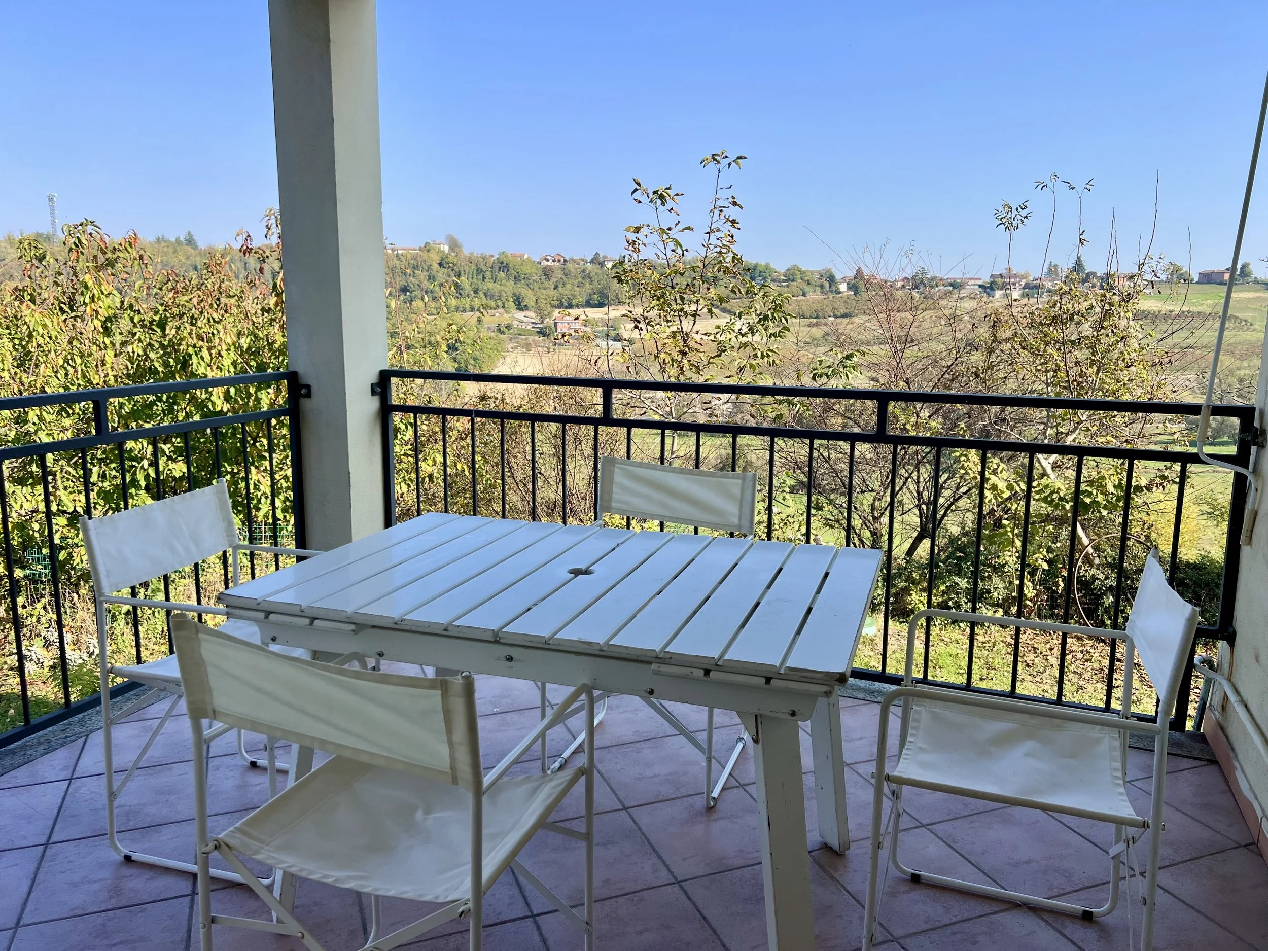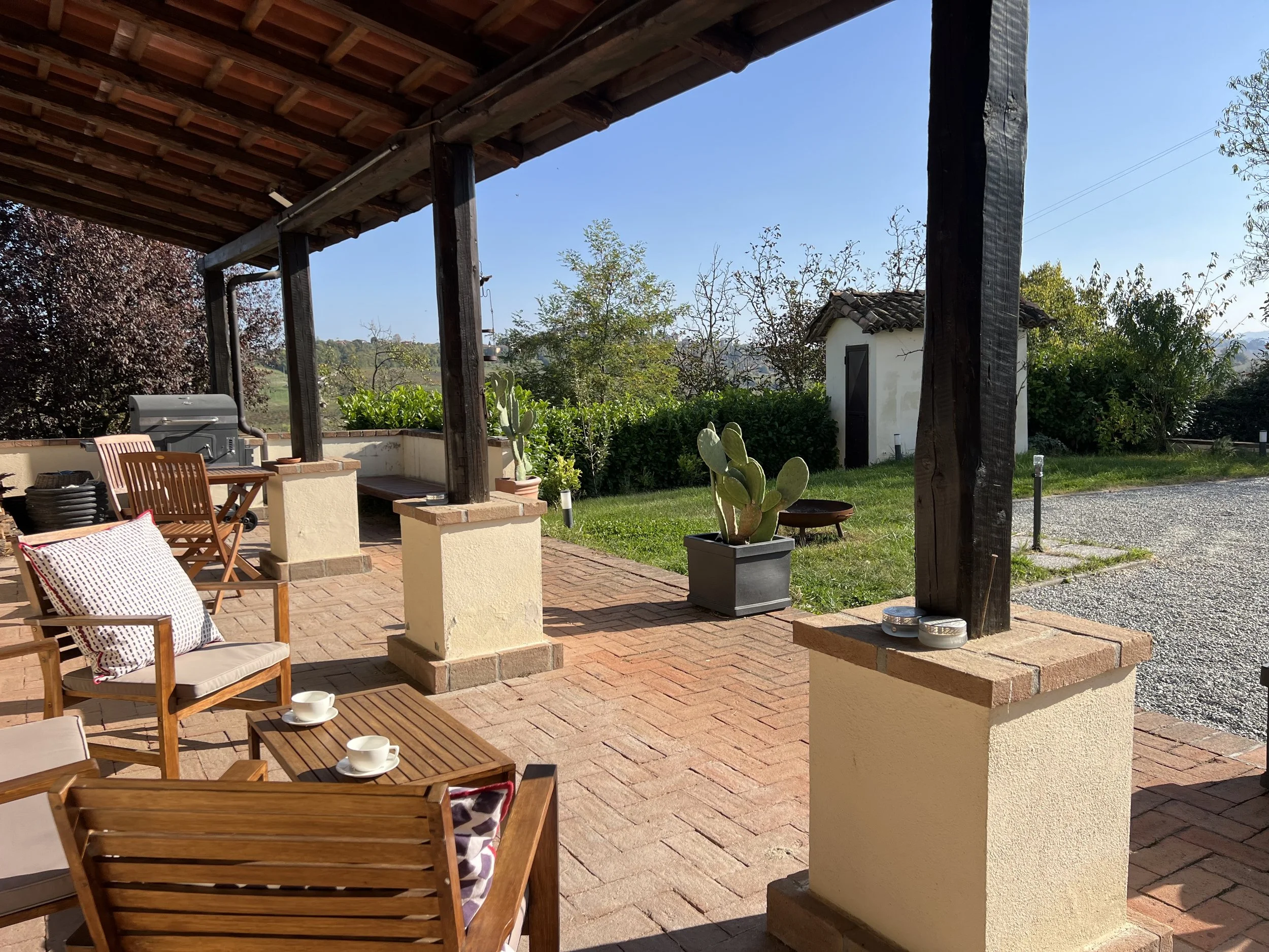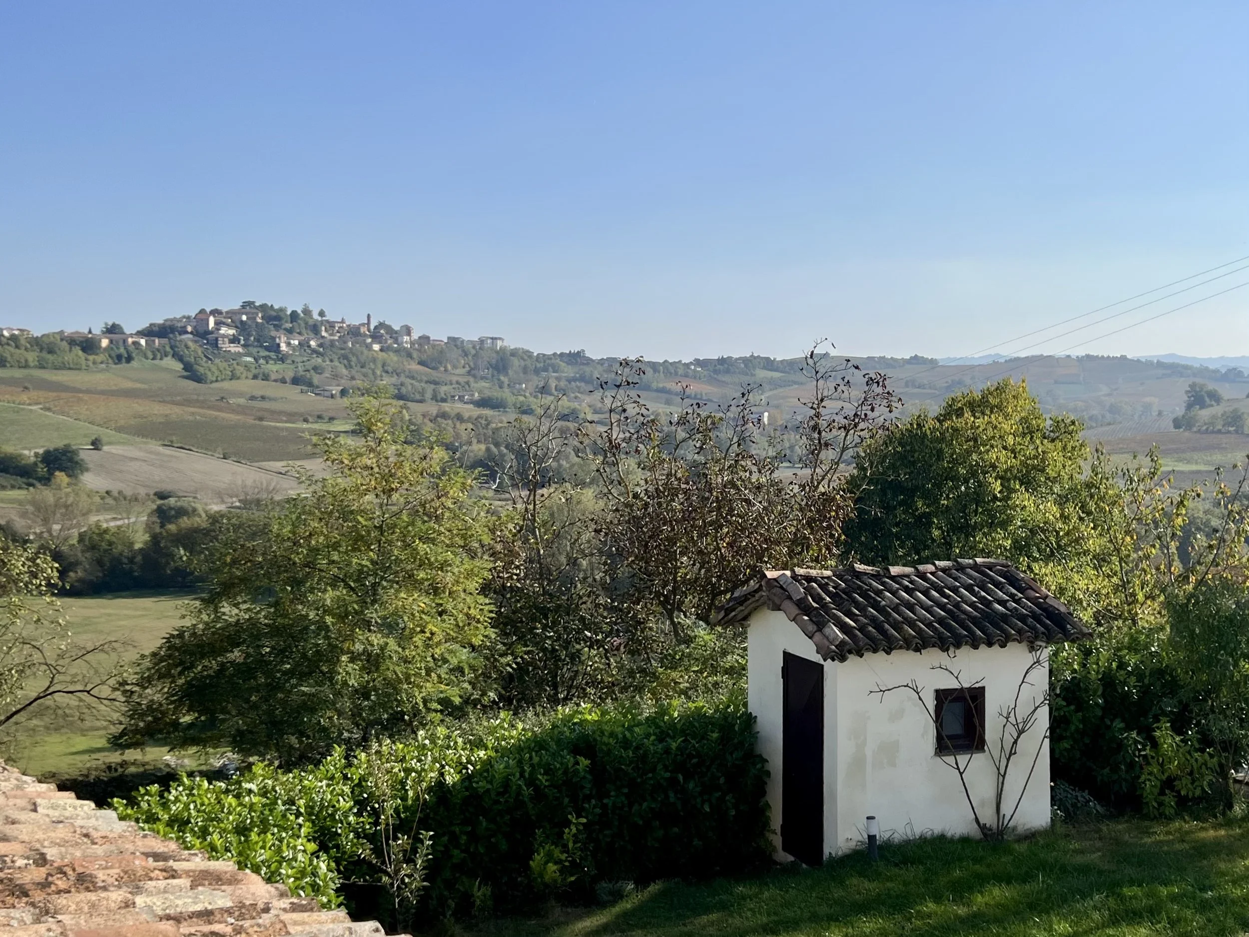 This charming property is situated on the hilltop between the popular villages of Agliano Terme and Montegrosso. Full of character and stylethis house has much to offer; lots of original details in a modern and fresh setting. The kitchen is brand new and the central heating as well as the electric system is very recently changed. On the ground floor is a very cosy living room with a large, open wood burning fire place (in frequent use in the winter months) followed by the stylish new kitchen with its island unit. Then there is a guest bathroom/laundry room and an east facing breakfast terrace next to the kitchen, a great spot to start the day overlooking the beautiful countryside and the hilltop villages. On the first floor are three double bedrooms, all with air-condition units plus a family bathroom with a bath tub and shower cubicle. There are old cotto tiles on the floors and the windows have fly screens and newly painted shutters. On the lower ground floor is a big and beautiful vaulted wine cellar in exposed bricks. There is also a storage room, a technical room and an oversized garage. An internal staircase leads from the ground floor to the garage and cellar. You enter the property through a new and modern electric gate. There is a brick wall dividing the courtyard and front garden from the neighbour. The garden has watering system installed and a nice little storage unit on the lawn in the front of the main facade. A lovely portico is running along the main facade, providing shade for the seating area. The garden has space for a swimming pool and the location is tranquil and in short distance to the centre of the village of Agliano Terme with all its services.