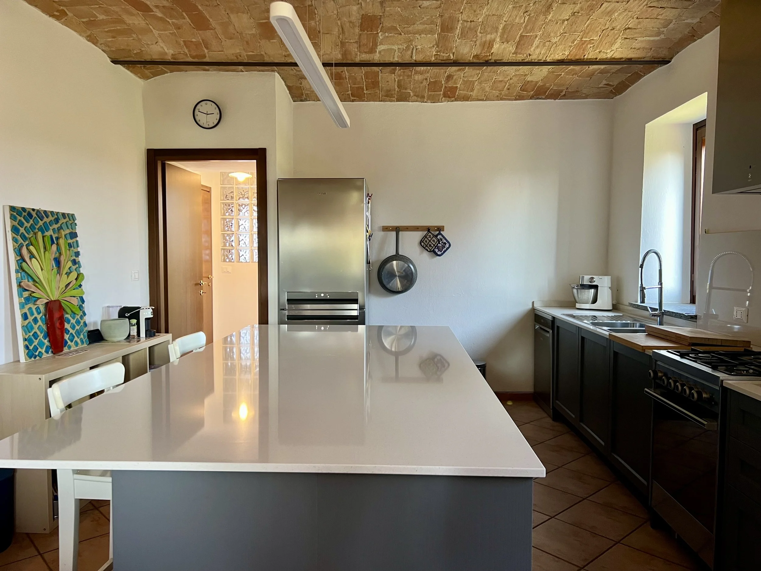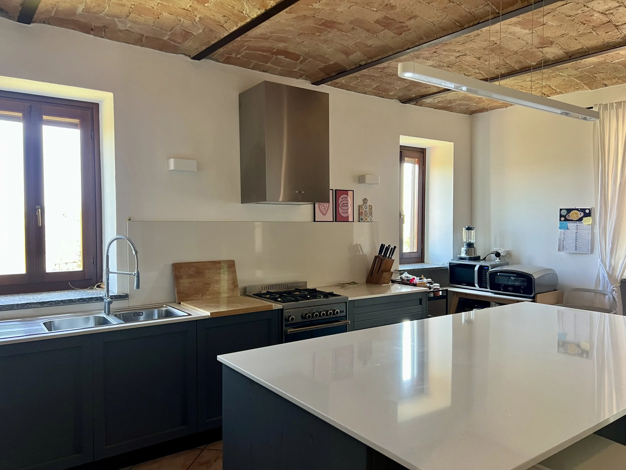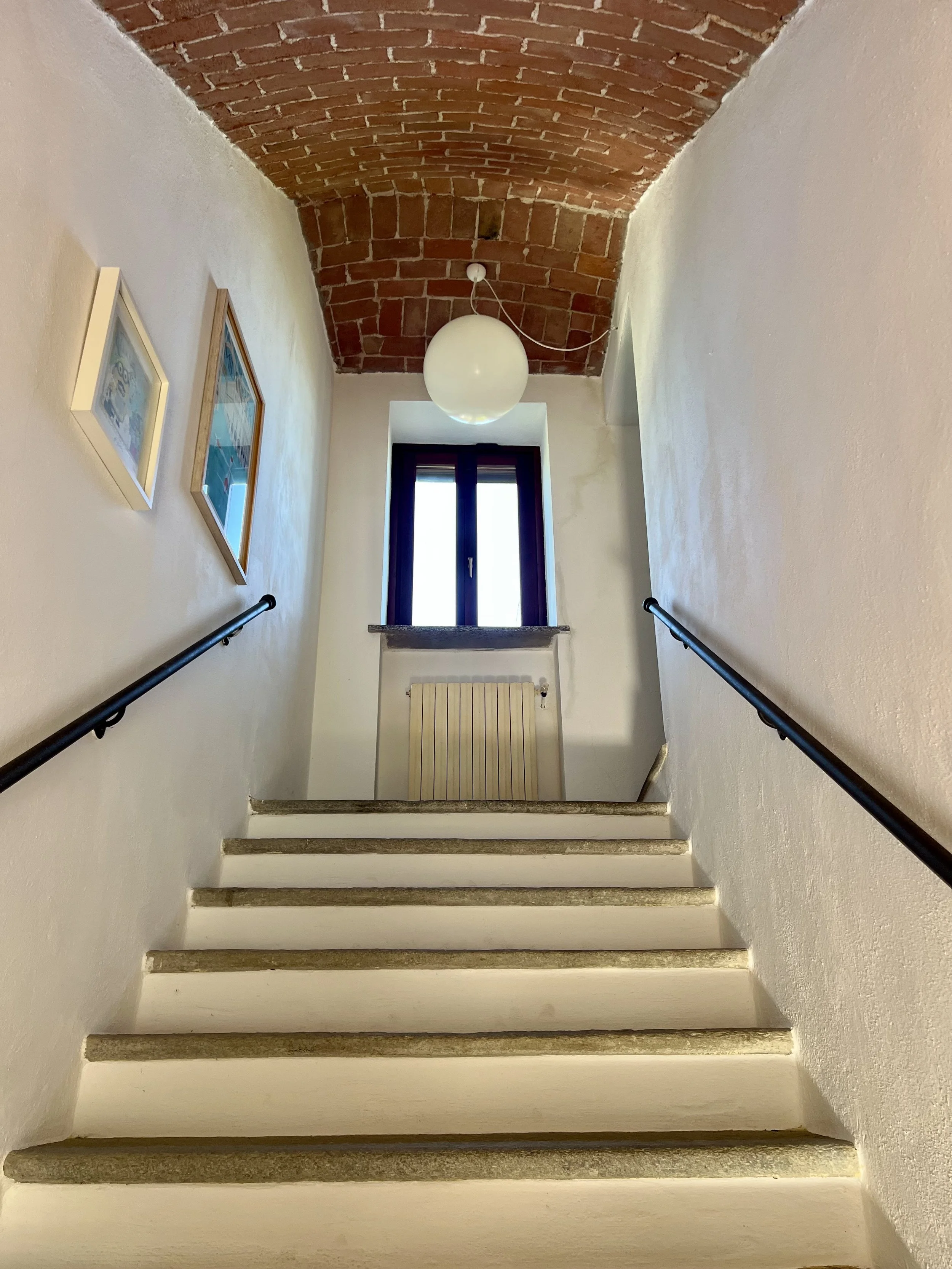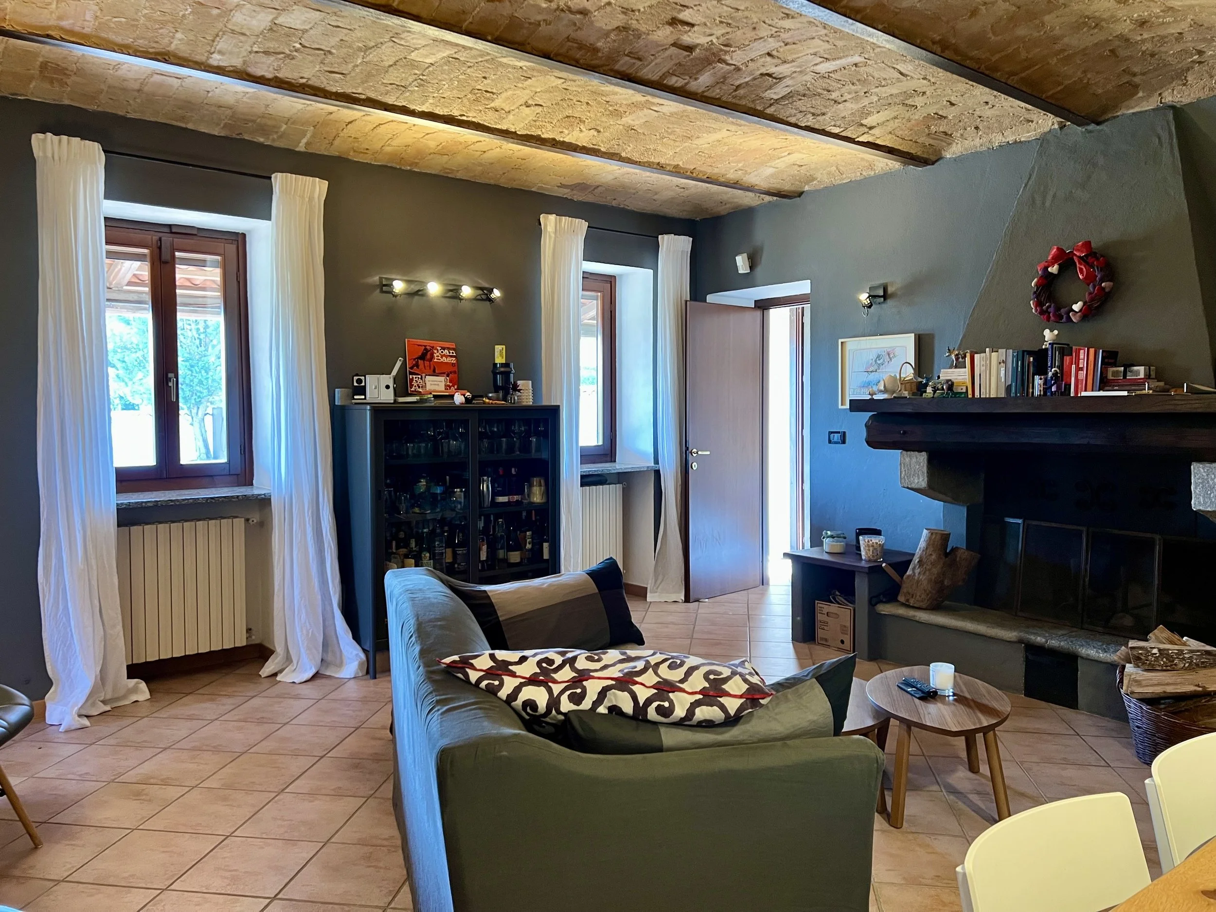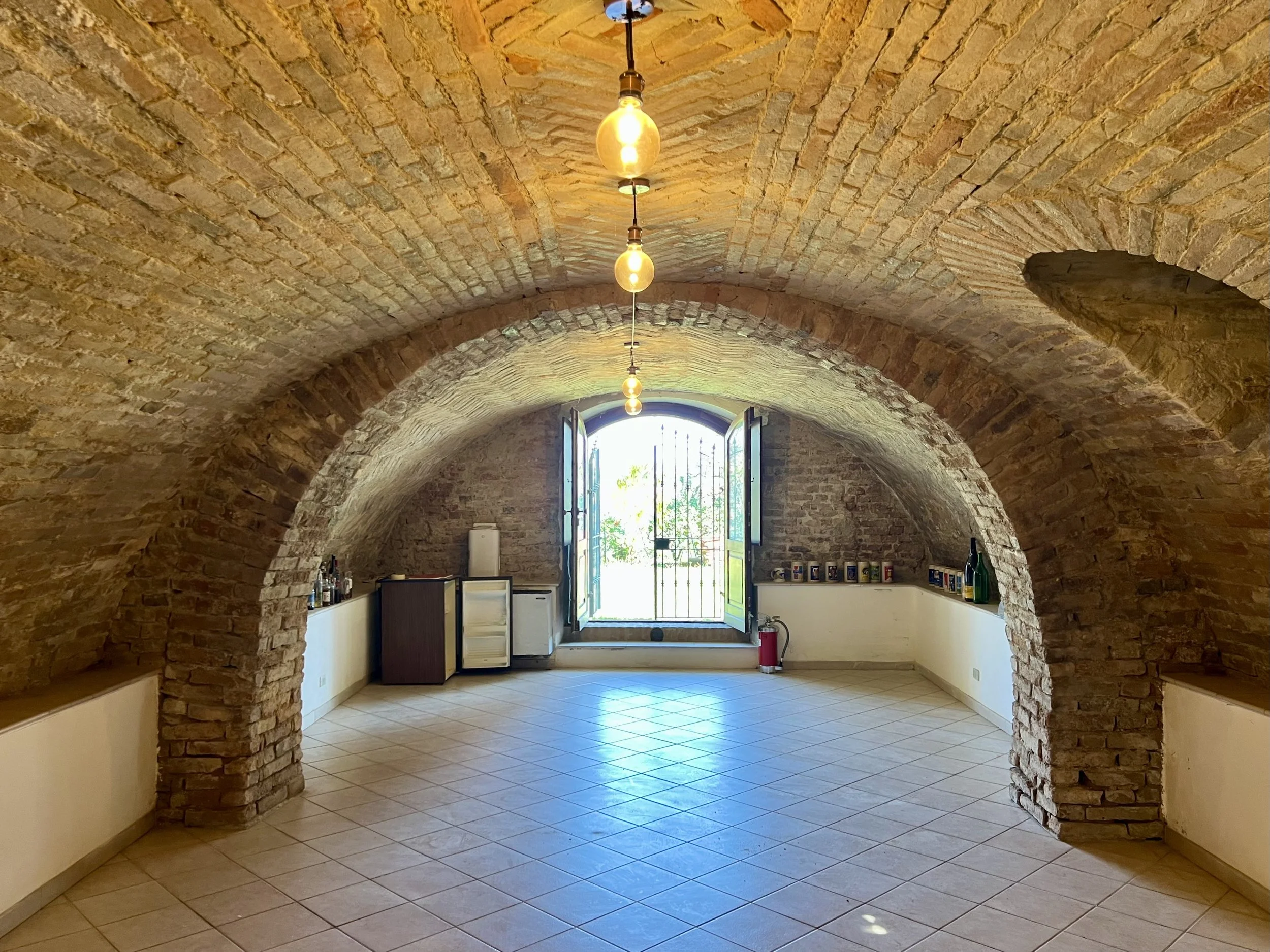 This charming property is situated on the hilltop between the popular villages of Agliano Terme and Montegrosso. Full of character and stylethis house has much to offer; lots of original details in a modern and fresh setting. The kitchen is brand new and the central heating as well as the electric system is very recently changed. On the ground floor is a very cosy living room with a large, open wood burning fire place (in frequent use in the winter months) followed by the stylish new kitchen with its island unit. Then there is a guest bathroom/laundry room and an east facing breakfast terrace next to the kitchen, a great spot to start the day overlooking the beautiful countryside and the hilltop villages. On the first floor are three double bedrooms, all with air-condition units plus a family bathroom with a bath tub and shower cubicle. There are old cotto tiles on the floors and the windows have fly screens and newly painted shutters. On the lower ground floor is a big and beautiful vaulted wine cellar in exposed bricks. There is also a storage room, a technical room and an oversized garage. An internal staircase leads from the ground floor to the garage and cellar. You enter the property through a new and modern electric gate. There is a brick wall dividing the courtyard and front garden from the neighbour. The garden has watering system installed and a nice little storage unit on the lawn in the front of the main facade. A lovely portico is running along the main facade, providing shade for the seating area. The garden has space for a swimming pool and the location is tranquil and in short distance to the centre of the village of Agliano Terme with all its services.