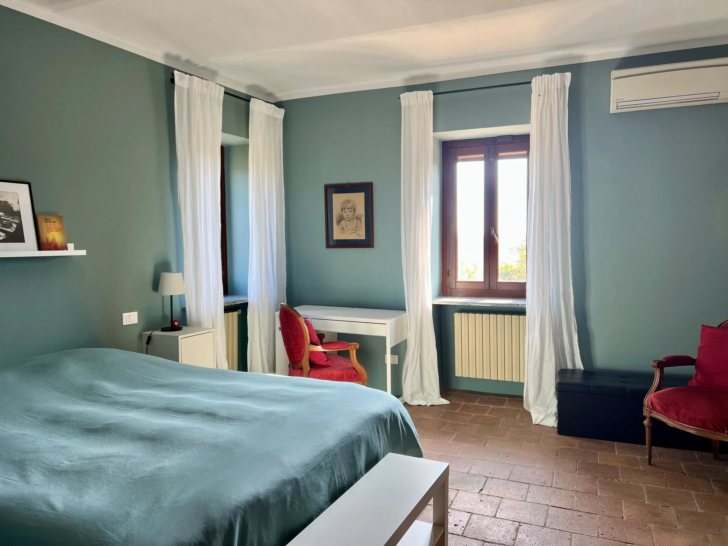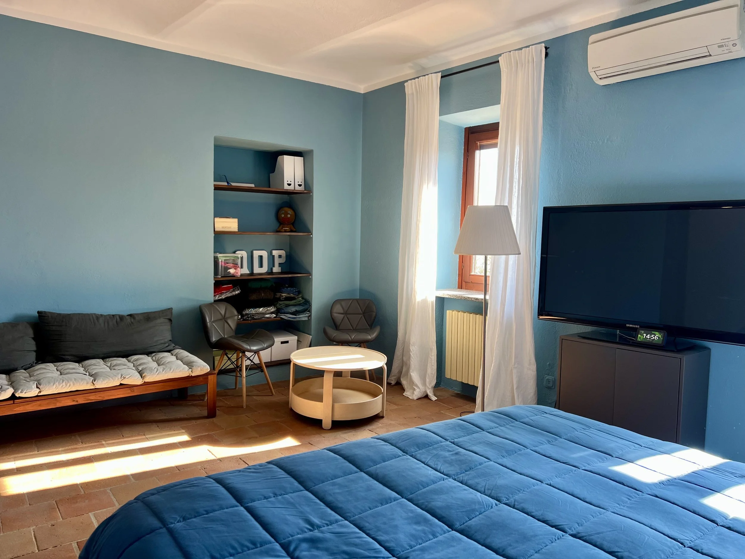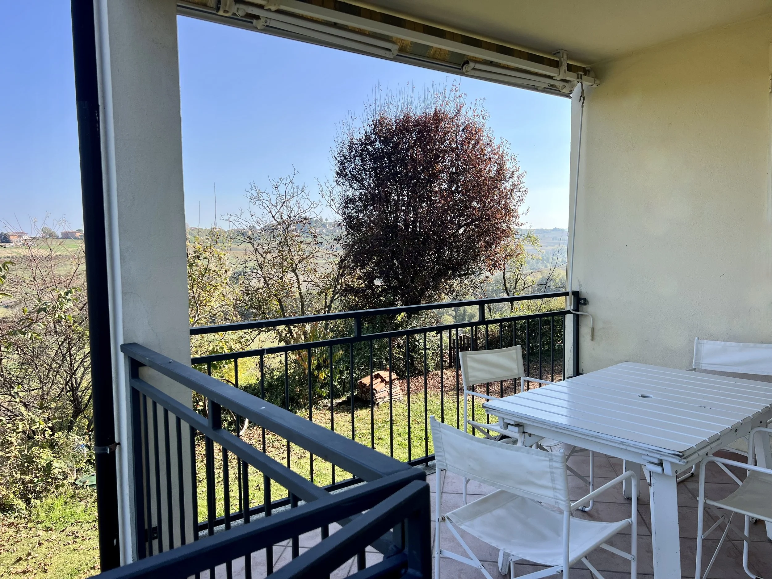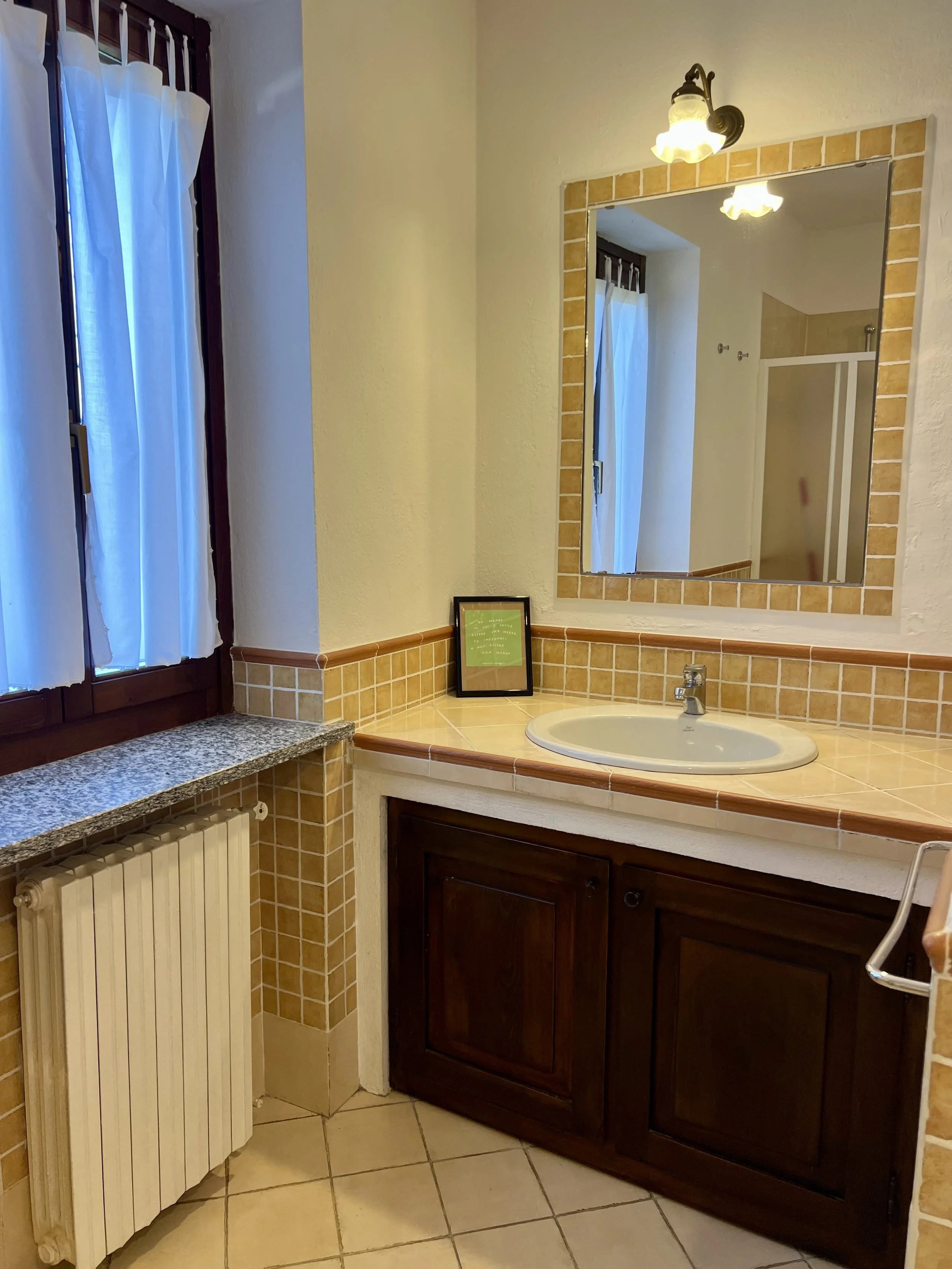 This charming property is situated on the hilltop between the popular villages of Agliano Terme and Montegrosso. Full of character and stylethis house has much to offer; lots of original details in a modern and fresh setting. The kitchen is brand new and the central heating as well as the electric system is very recently changed. On the ground floor is a very cosy living room with a large, open wood burning fire place (in frequent use in the winter months) followed by the stylish new kitchen with its island unit. Then there is a guest bathroom/laundry room and an east facing breakfast terrace next to the kitchen, a great spot to start the day overlooking the beautiful countryside and the hilltop villages. On the first floor are three double bedrooms, all with air-condition units plus a family bathroom with a bath tub and shower cubicle. There are old cotto tiles on the floors and the windows have fly screens and newly painted shutters. On the lower ground floor is a big and beautiful vaulted wine cellar in exposed bricks. There is also a storage room, a technical room and an oversized garage. An internal staircase leads from the ground floor to the garage and cellar. You enter the property through a new and modern electric gate. There is a brick wall dividing the courtyard and front garden from the neighbour. The garden has watering system installed and a nice little storage unit on the lawn in the front of the main facade. A lovely portico is running along the main facade, providing shade for the seating area. The garden has space for a swimming pool and the location is tranquil and in short distance to the centre of the village of Agliano Terme with all its services.