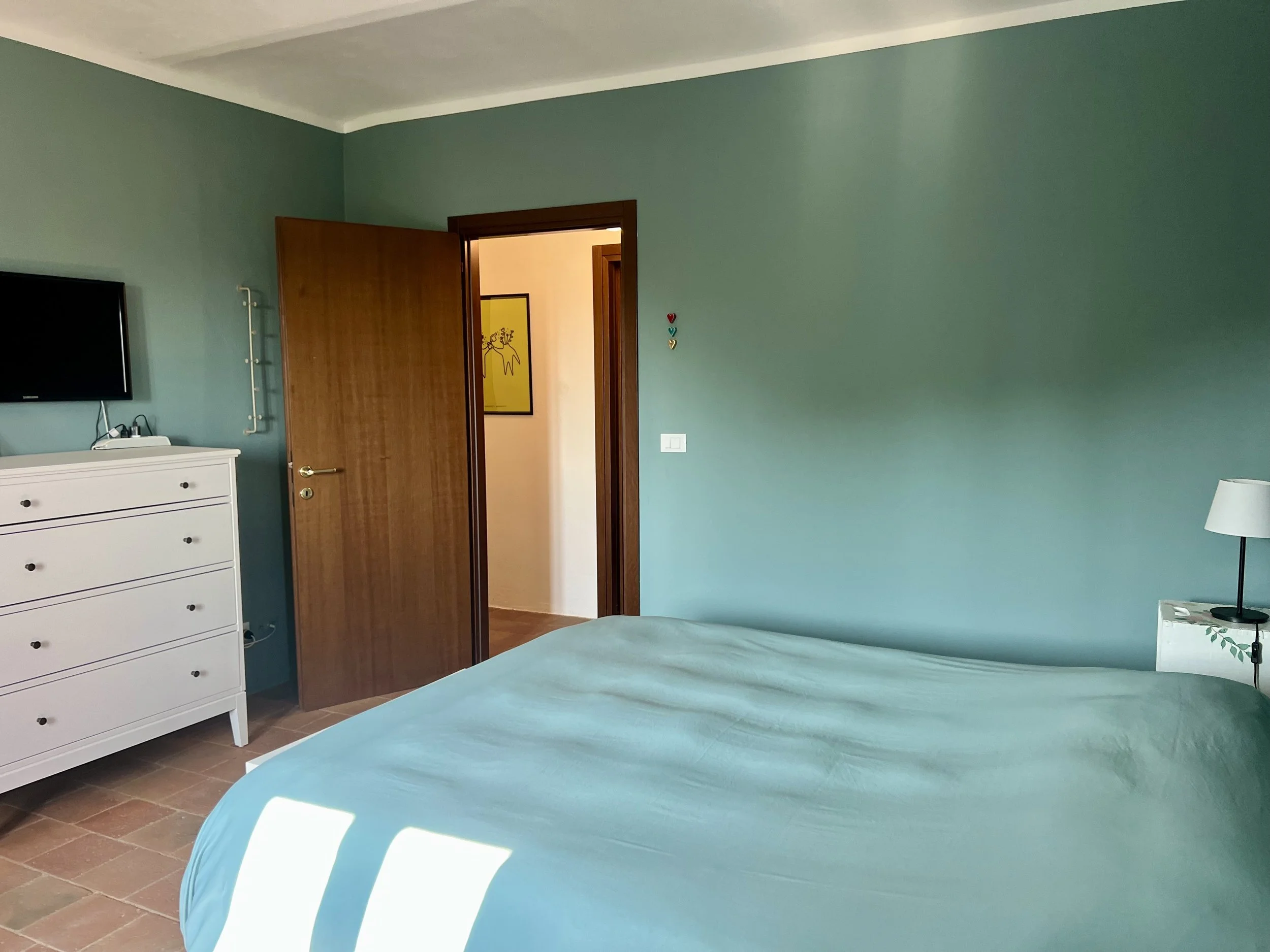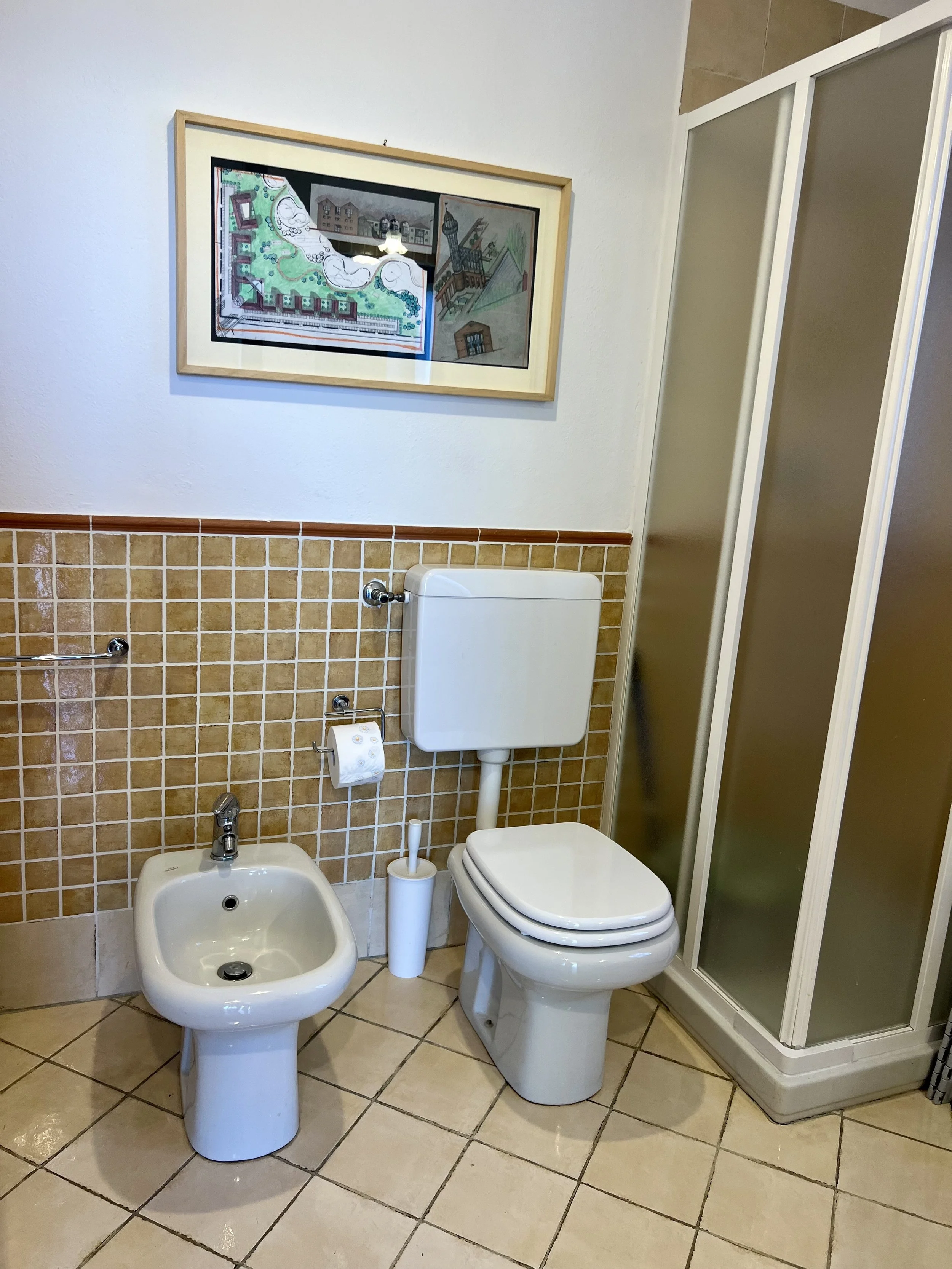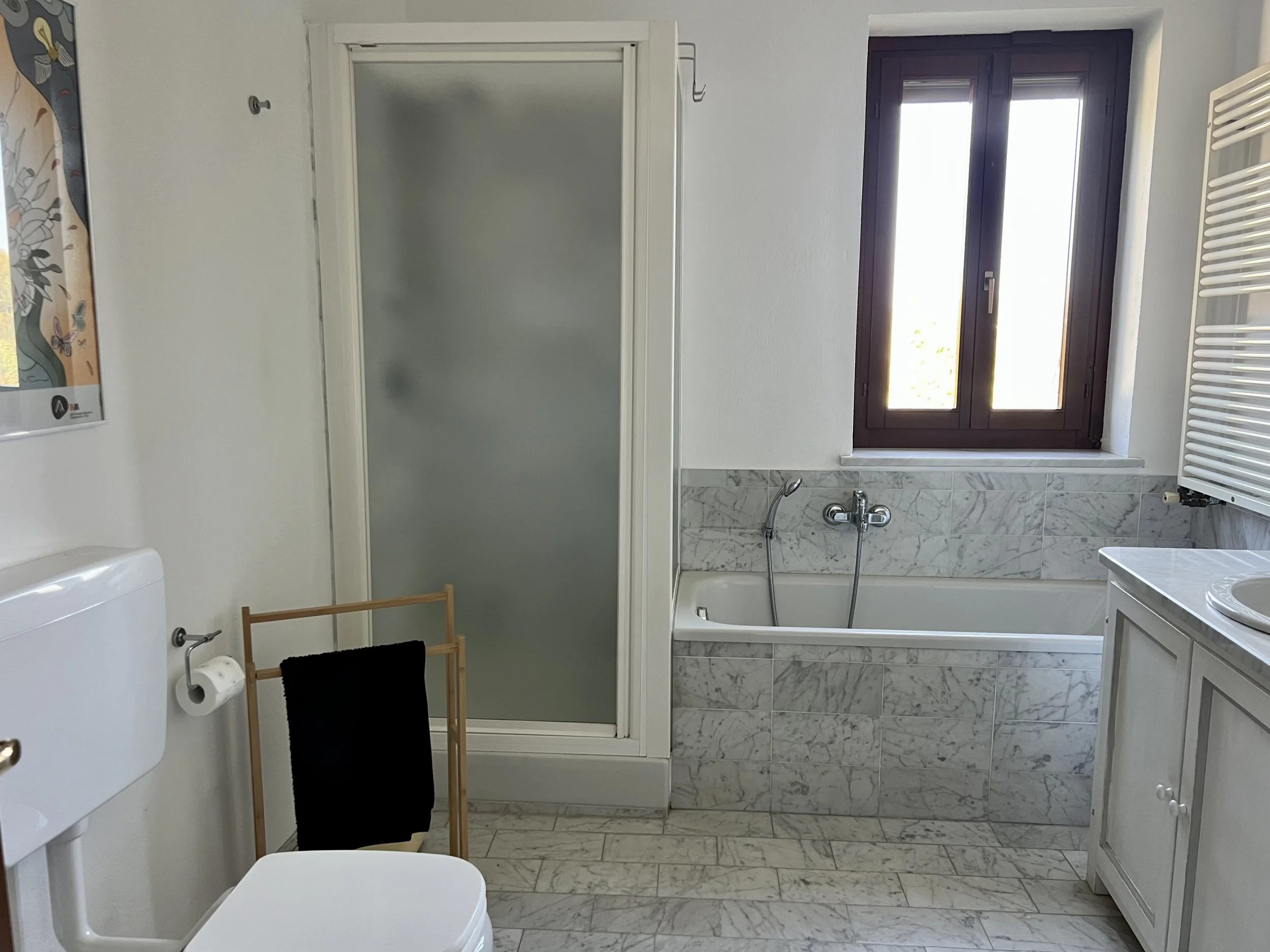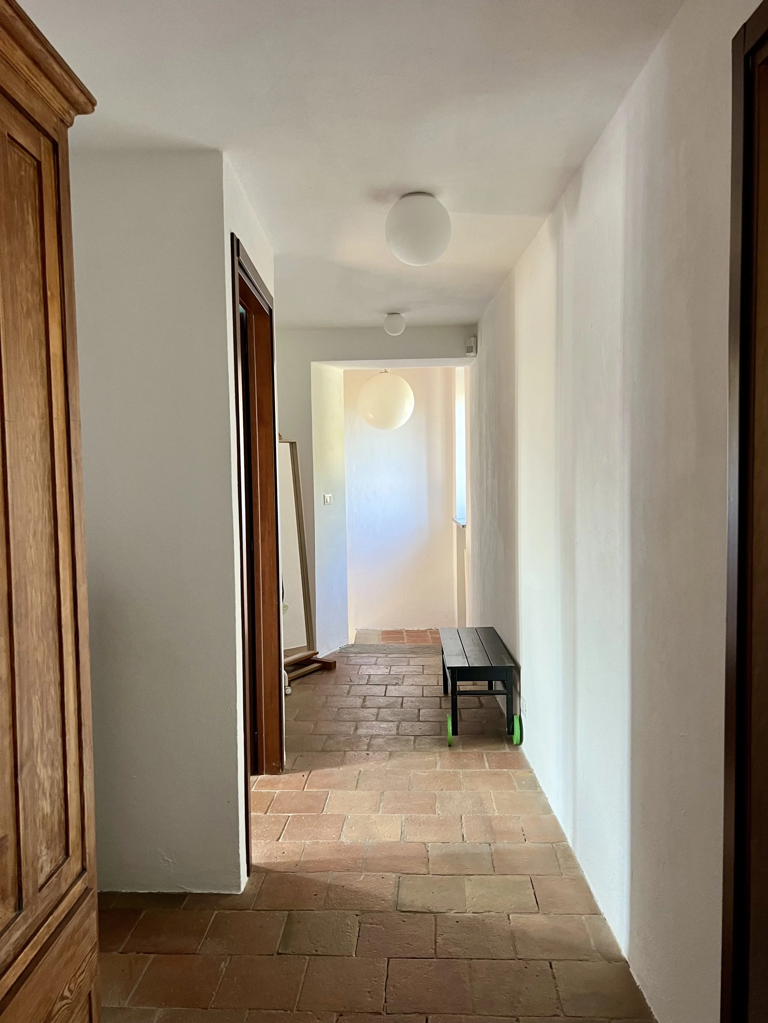 This charming property is situated on the hilltop between the popular villages of Agliano Terme and Montegrosso. Full of character and stylethis house has much to offer; lots of original details in a modern and fresh setting. The kitchen is brand new and the central heating as well as the electric system is very recently changed. On the ground floor is a very cosy living room with a large, open wood burning fire place (in frequent use in the winter months) followed by the stylish new kitchen with its island unit. Then there is a guest bathroom/laundry room and an east facing breakfast terrace next to the kitchen, a great spot to start the day overlooking the beautiful countryside and the hilltop villages. On the first floor are three double bedrooms, all with air-condition units plus a family bathroom with a bath tub and shower cubicle. There are old cotto tiles on the floors and the windows have fly screens and newly painted shutters. On the lower ground floor is a big and beautiful vaulted wine cellar in exposed bricks. There is also a storage room, a technical room and an oversized garage. An internal staircase leads from the ground floor to the garage and cellar. You enter the property through a new and modern electric gate. There is a brick wall dividing the courtyard and front garden from the neighbour. The garden has watering system installed and a nice little storage unit on the lawn in the front of the main facade. A lovely portico is running along the main facade, providing shade for the seating area. The garden has space for a swimming pool and the location is tranquil and in short distance to the centre of the village of Agliano Terme with all its services.