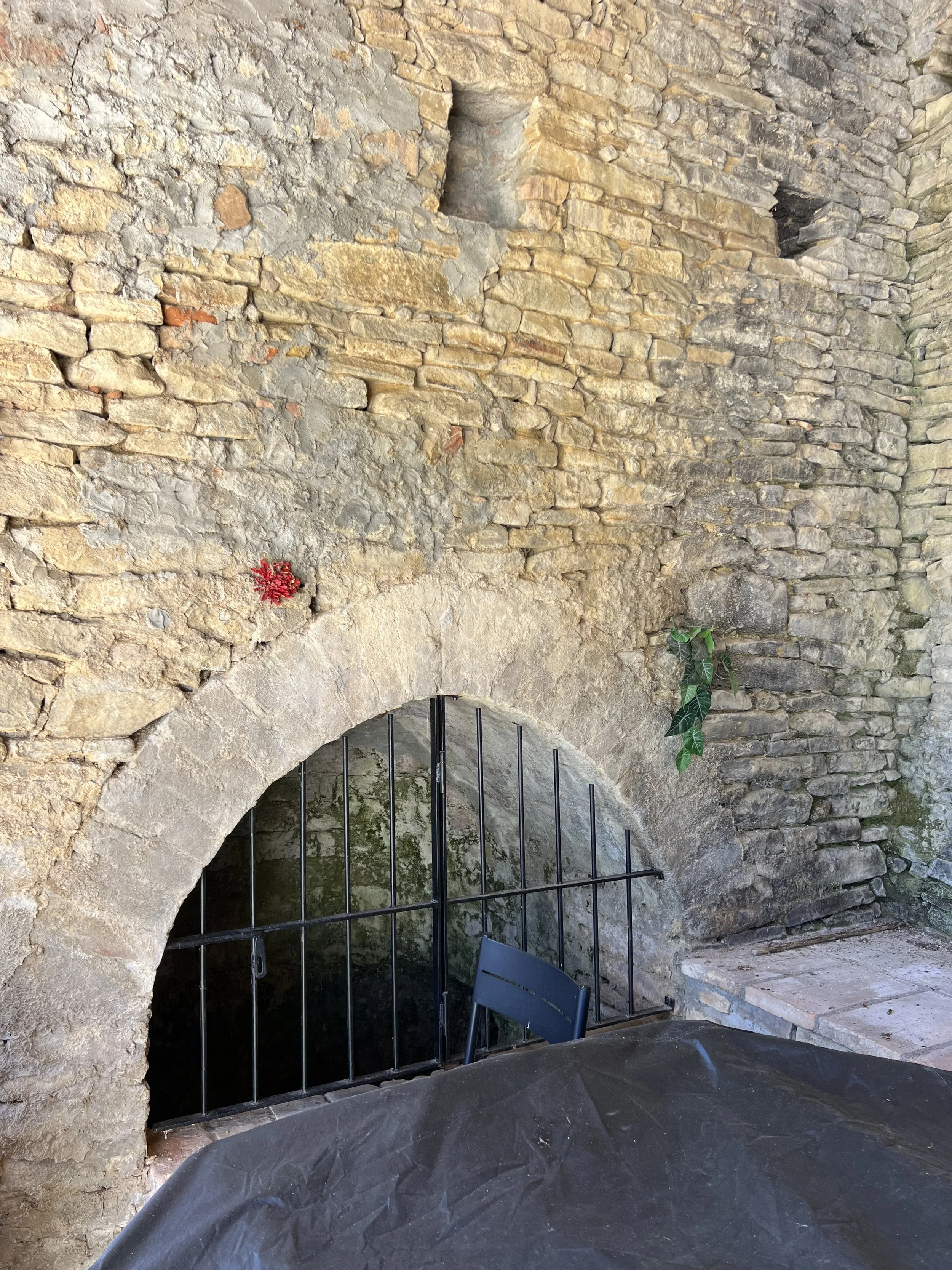 The front of the house and the garden is south west facing and a wooden pergola provide shade to the dining and BBQ area outside the kitchen. A great spot for alfresco dining, to enjoy the views and the sunset! There is an over-ground pool in the garden if you want a dip on hot days. A pathway from the garden is leading down to the underground wine cellar, located in the hillside underneath the upper garden area. A portico with roof tiles covers the entrance to the cellar and creates an outdoor seating/bar area on the lower ground area. A great place to arrange wine tastings or enjoy an aperitivo in good company.