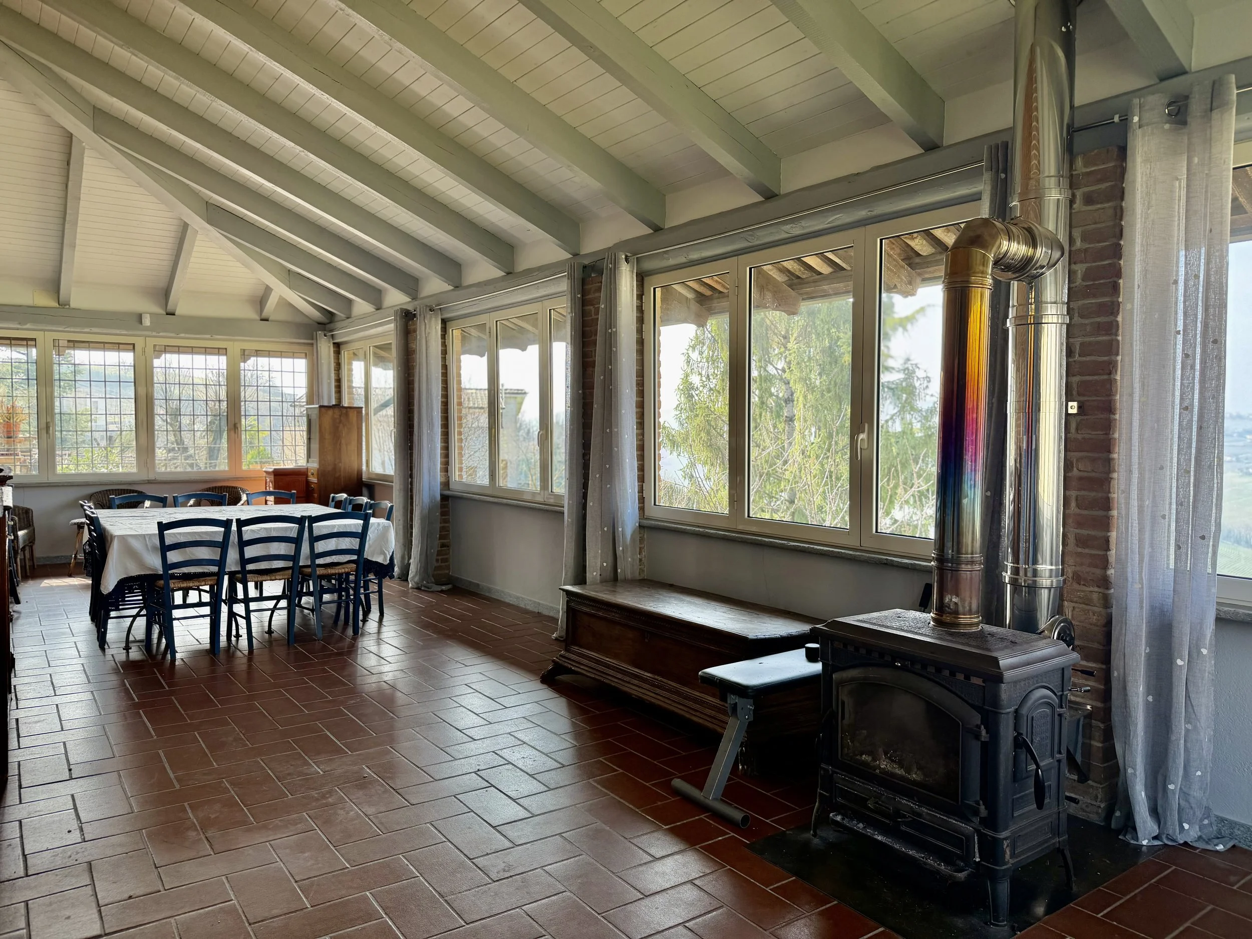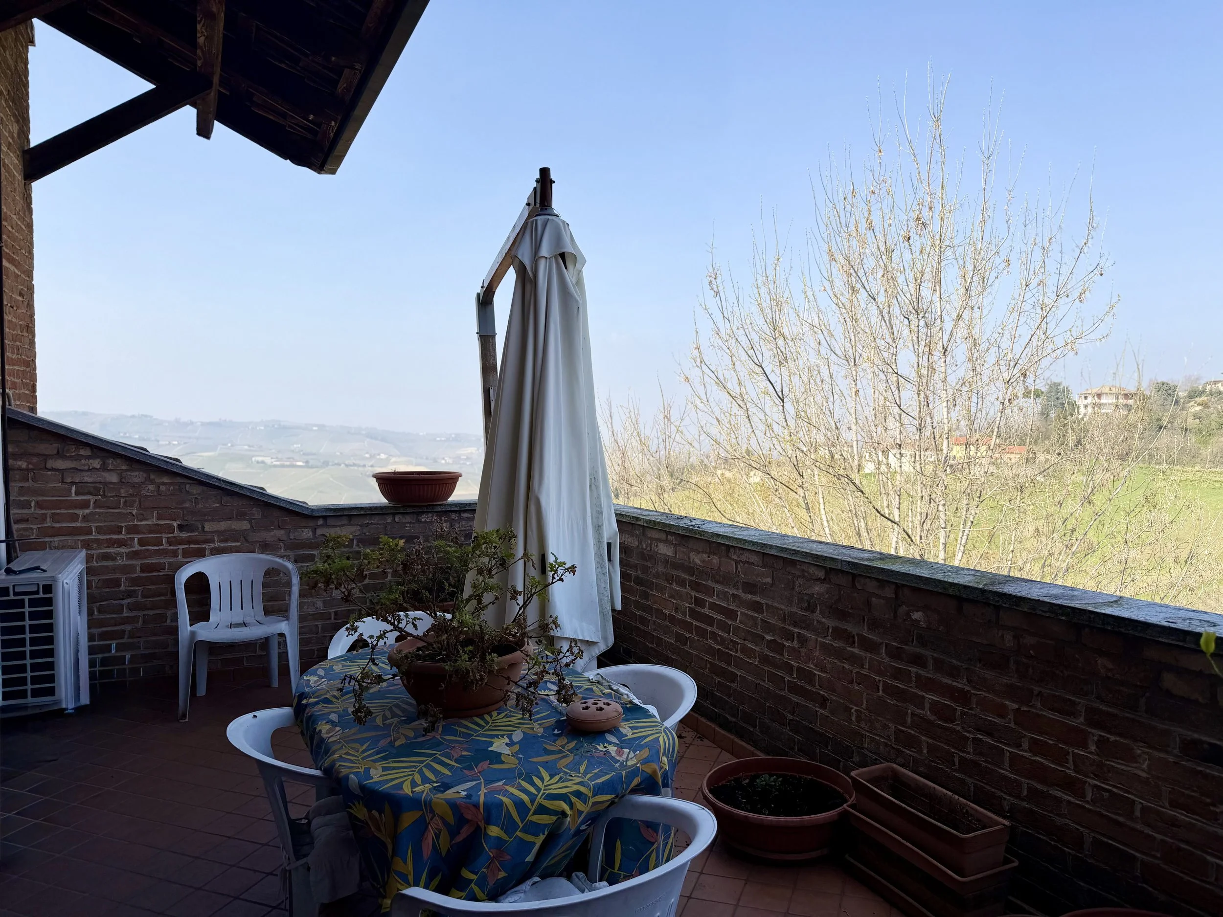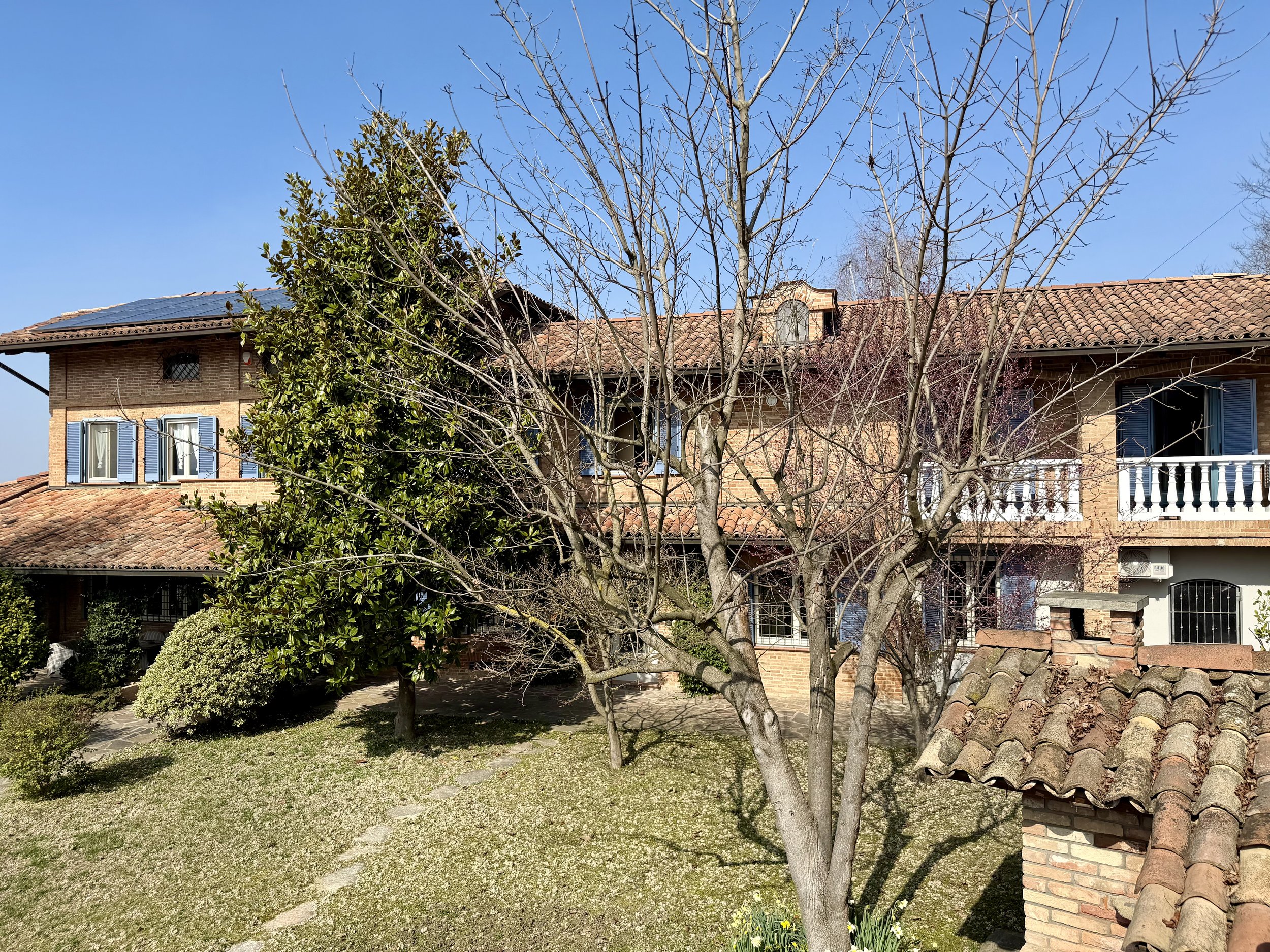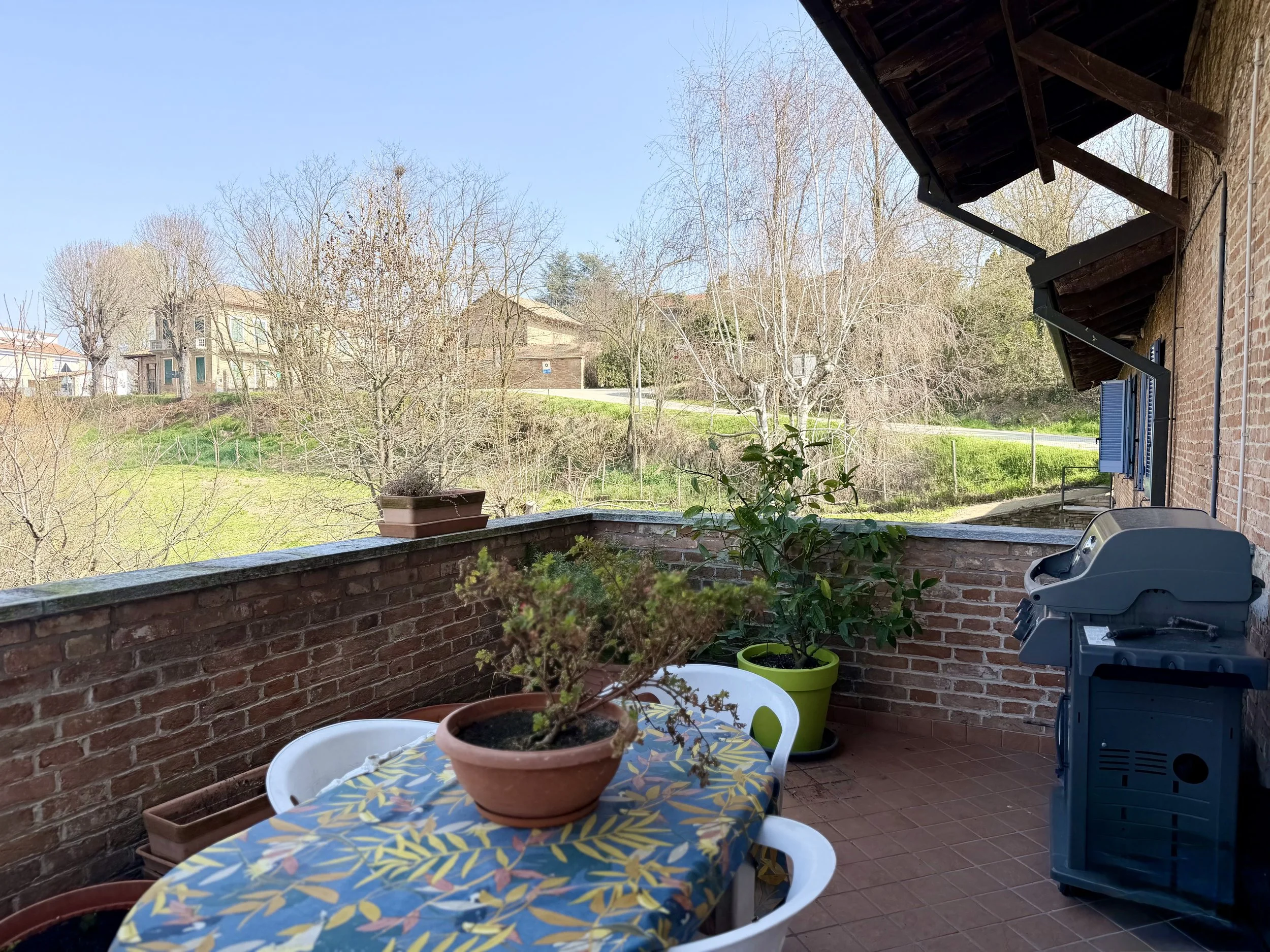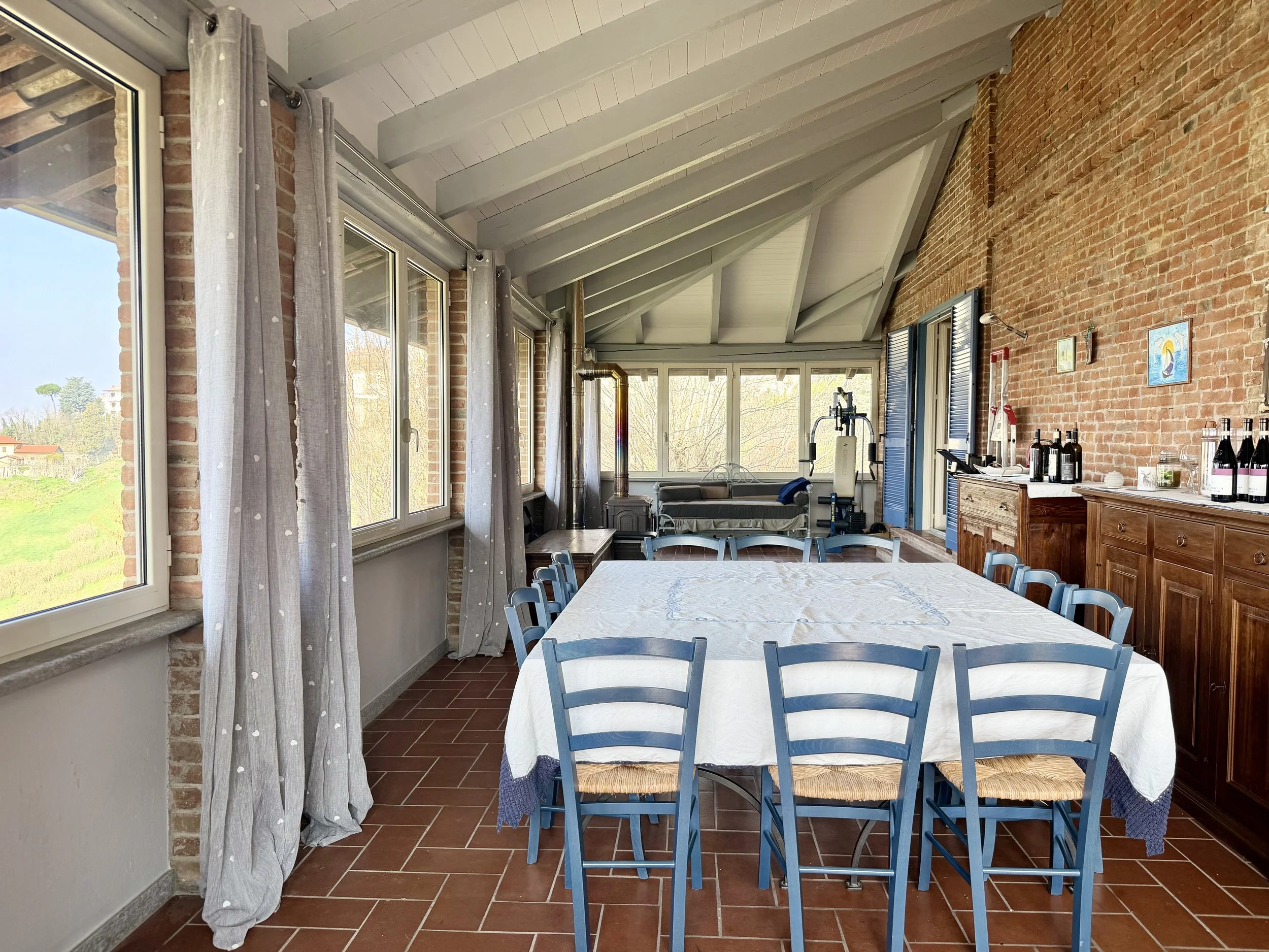 This amazingly situated old farmhouse has over the years been transformed into a modern and comfortable home with electricity producing solar panels (10 kw) installed in 2023, air condition units in 3 of the bedrooms, new doors and windows as well as upgraded bathrooms. A built in, west facing covered terrace offers fantastic views of Monviso and the Alps, and serves a a home gym and/or party room for big dinners and gatherings. A multifunctional space with the most breathtaking backdrop!