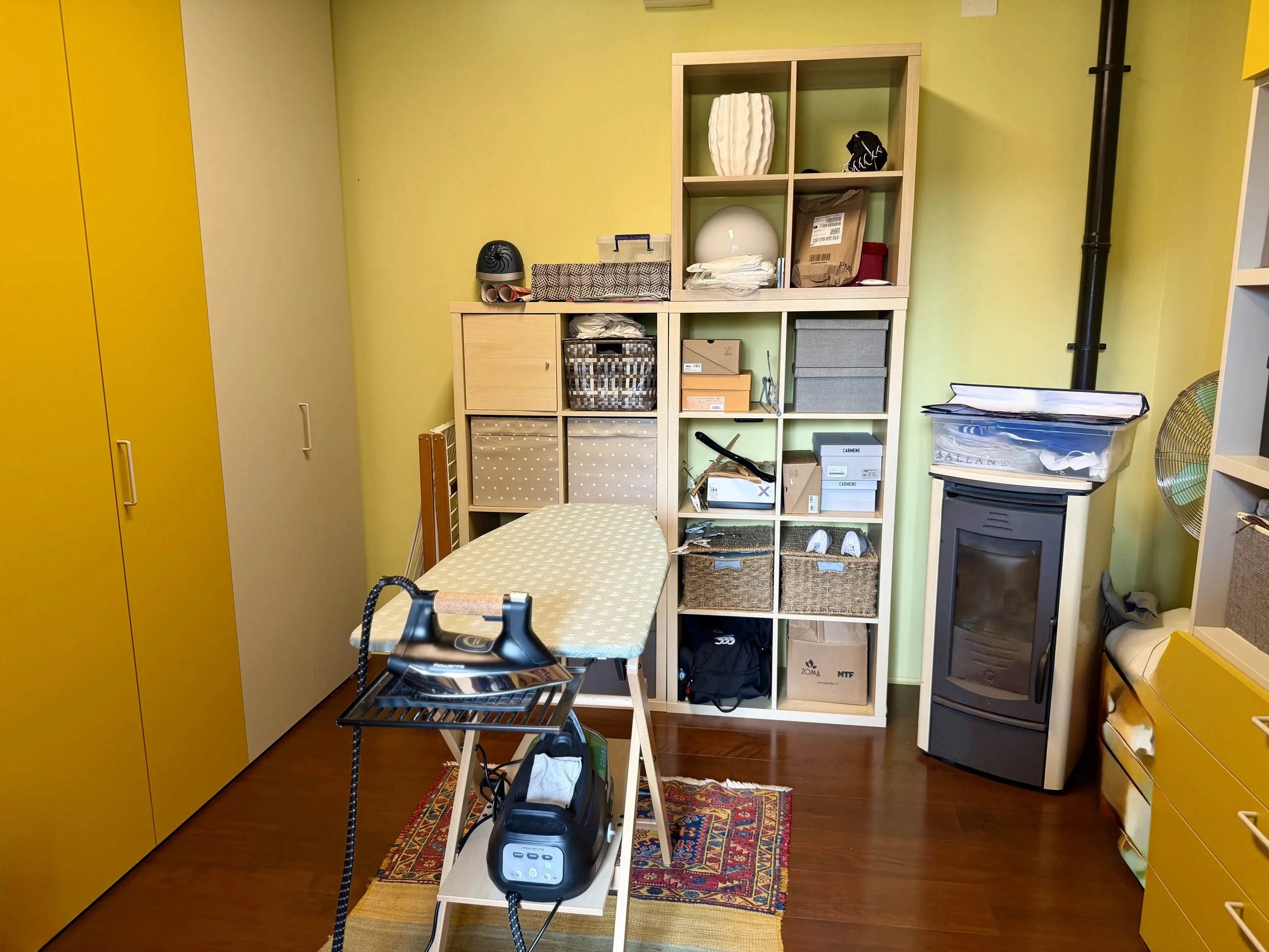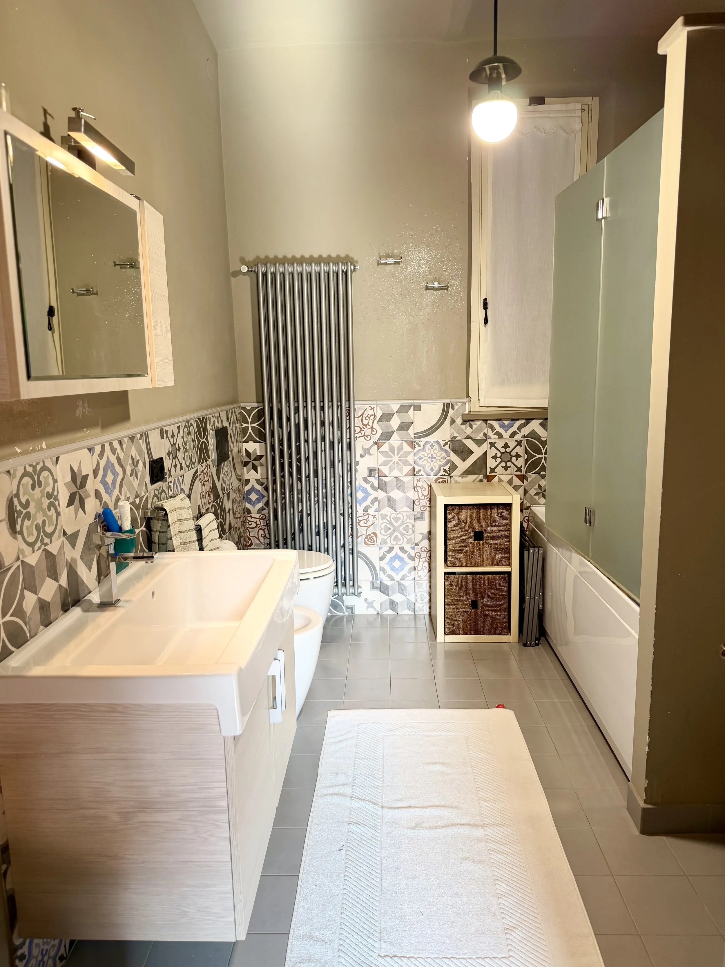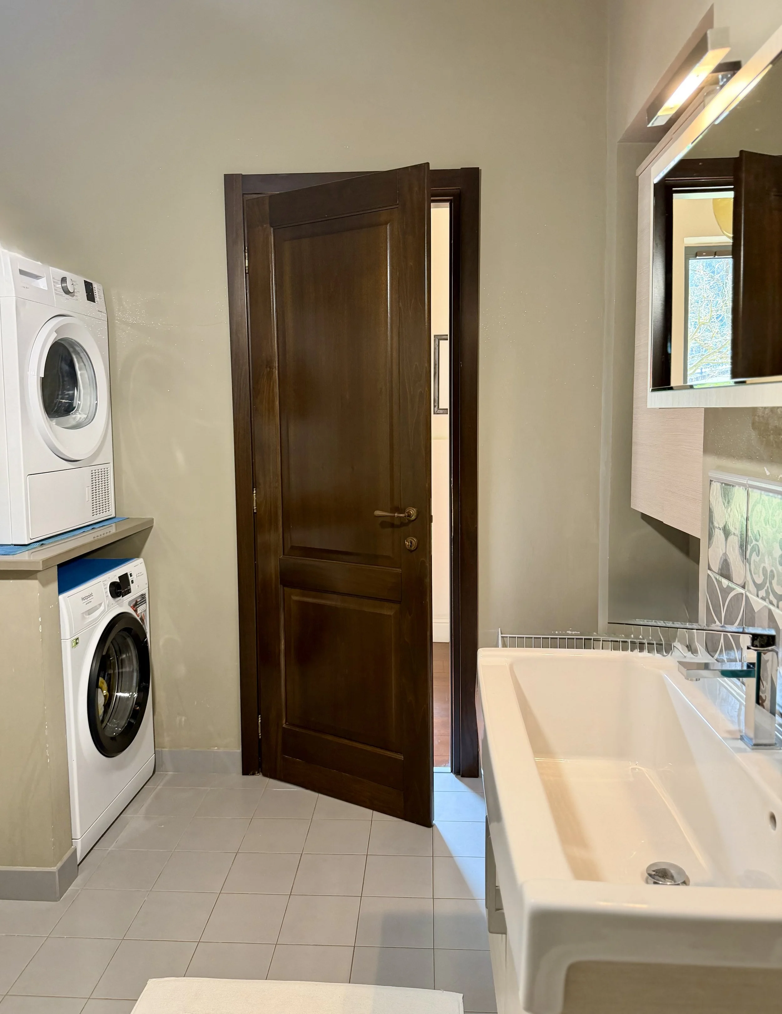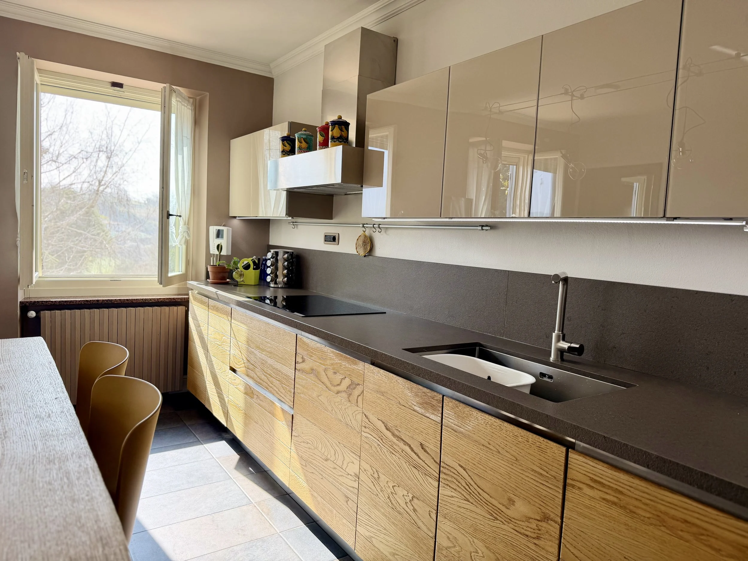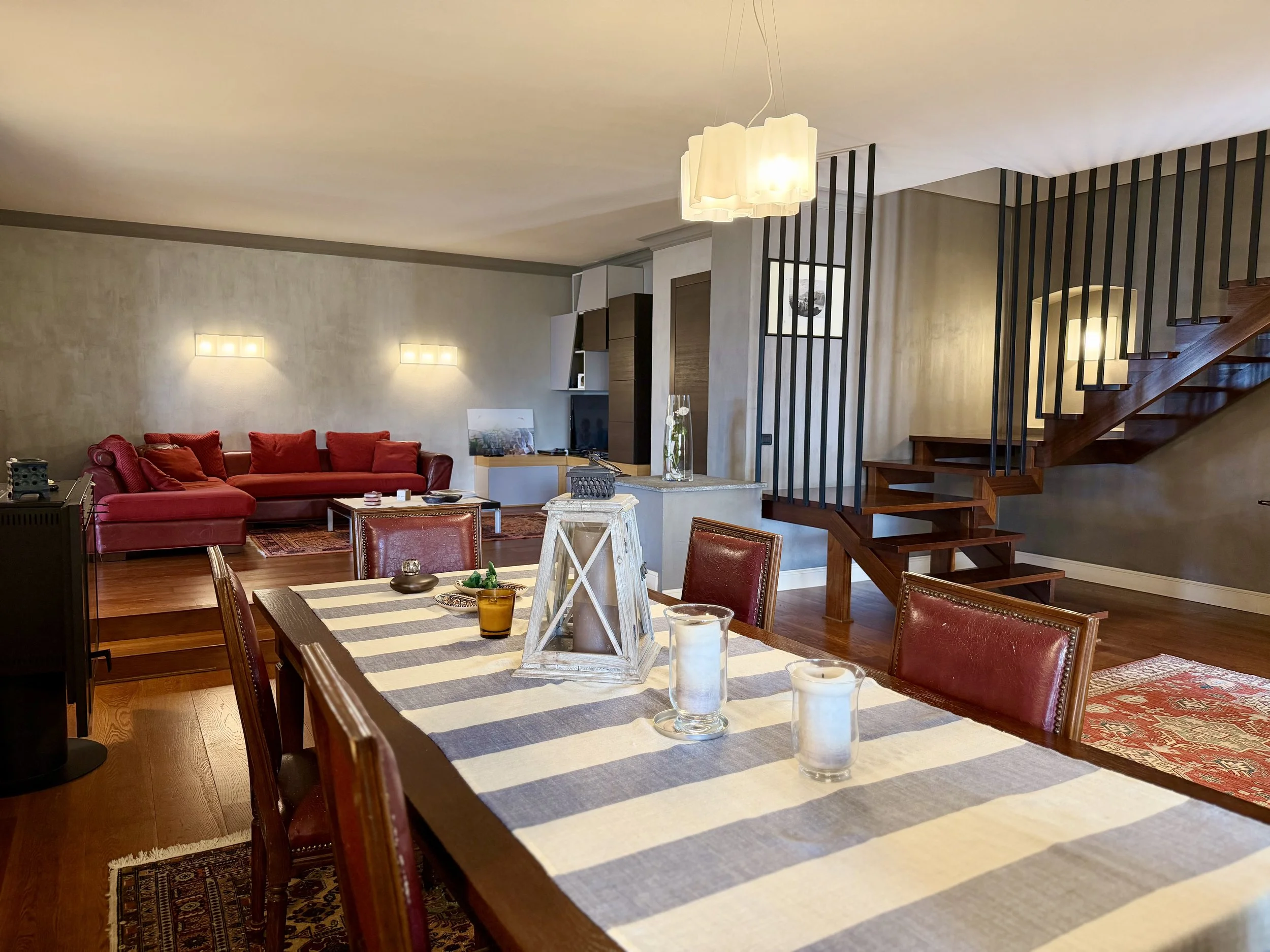 On the ground floor, next to the built in terrace is a big living/dining room with a modern pellet stove. Then there is a library room, a bath/laundry room with a bath tub and washer/dryer, a double bedroom, a room with a pellets stove used as storage and ironing room as well as a small service bathroom. On the first floor is a modern, linear kitchen unit with a dining table seating 6 persons and terrace door leading out to a terrace overlooking the characteristic outline of the village centre. Here you have a dining table and a BBQ, a lovely place to sit all through the day. The terrace is north facing which in the hot summer months is a big plus.