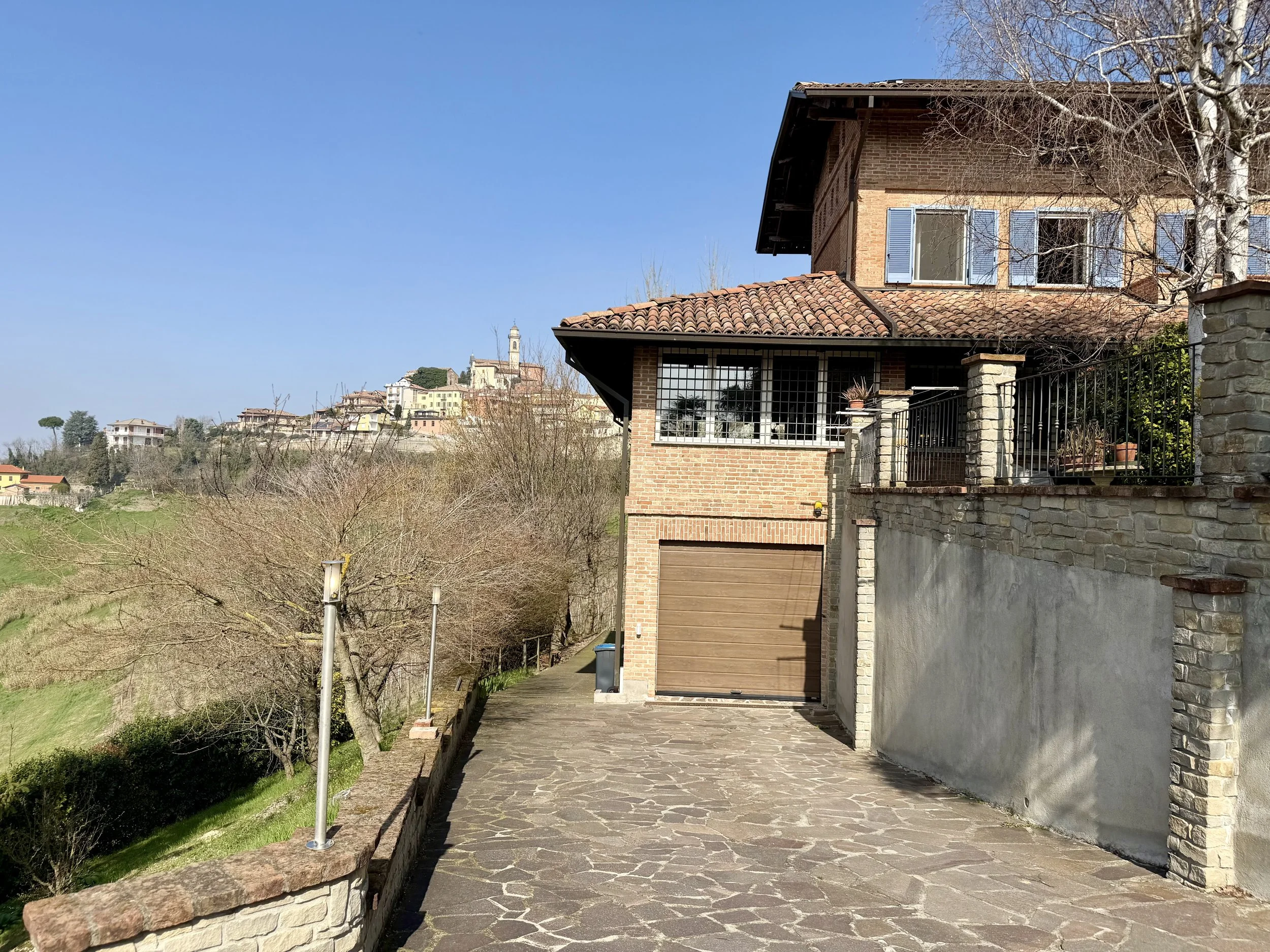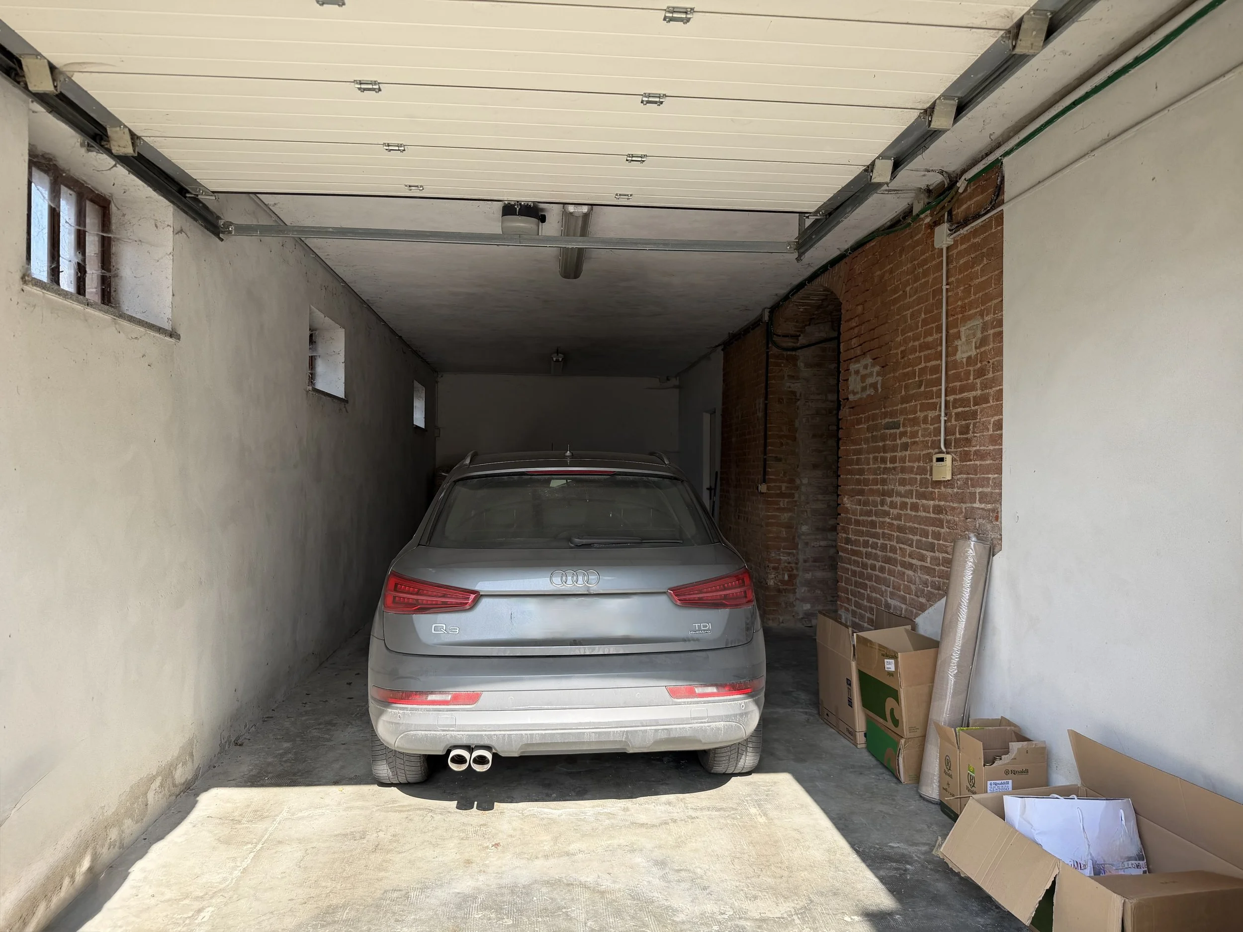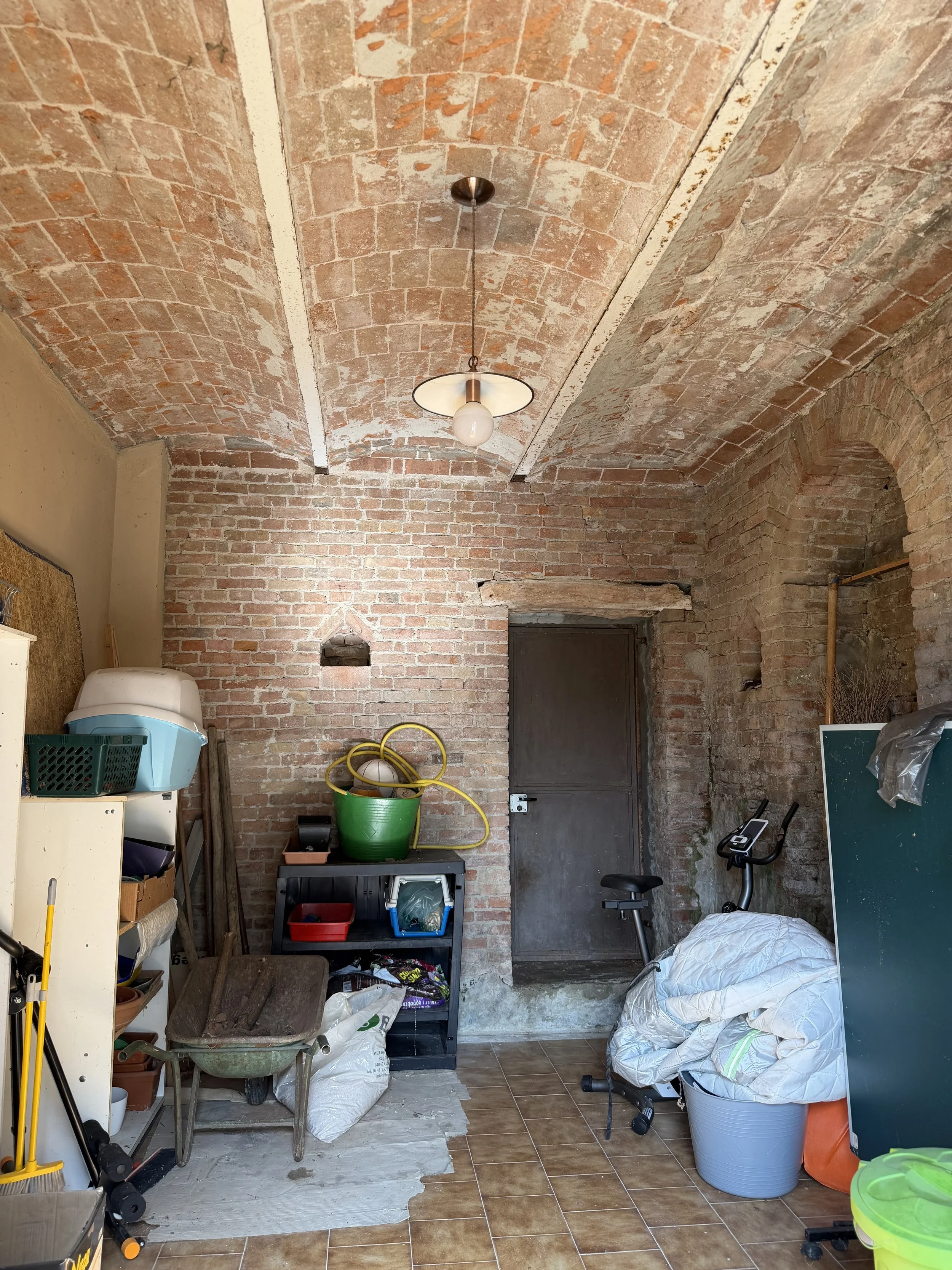 A separate, stone clad drive is leading down from the courtyard to the double garage situated under the covered terrace. From the garage you go into a good size storage room with an internal staircase leading up to the living room. Next to it, also with access from the garage, is an old wine cellar with vaulted brick ceilings. Now used as general storage room.