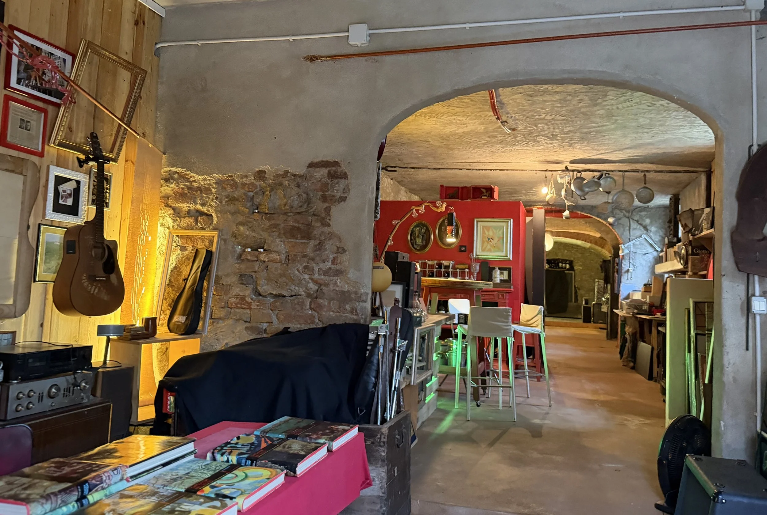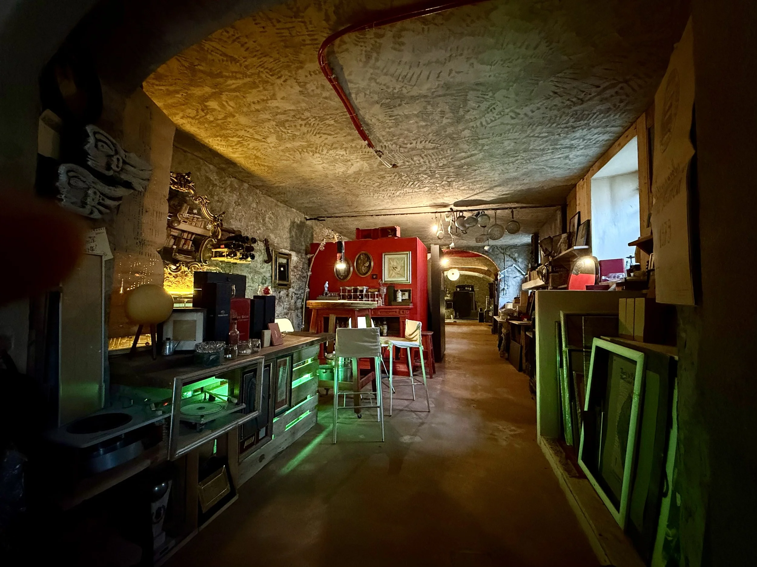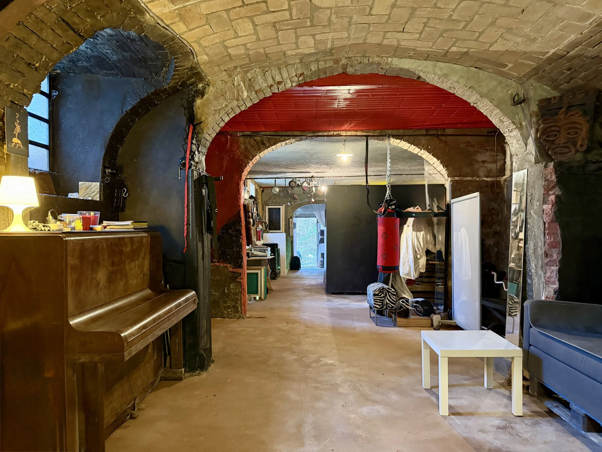 There is a huge cellar underneath the house with an internal staircase behind the wood covered end wall in the dining/living room. The cellar is covering the area under both the owners and the neighbours house. It is truly amazing and is today used as a multi-functional space with storage, a bar, gym and entertainment area. A big wooden door opens from the cellar to the lane leading down to the park behind the house making it very easy to transport bigger items directly into the cellar.