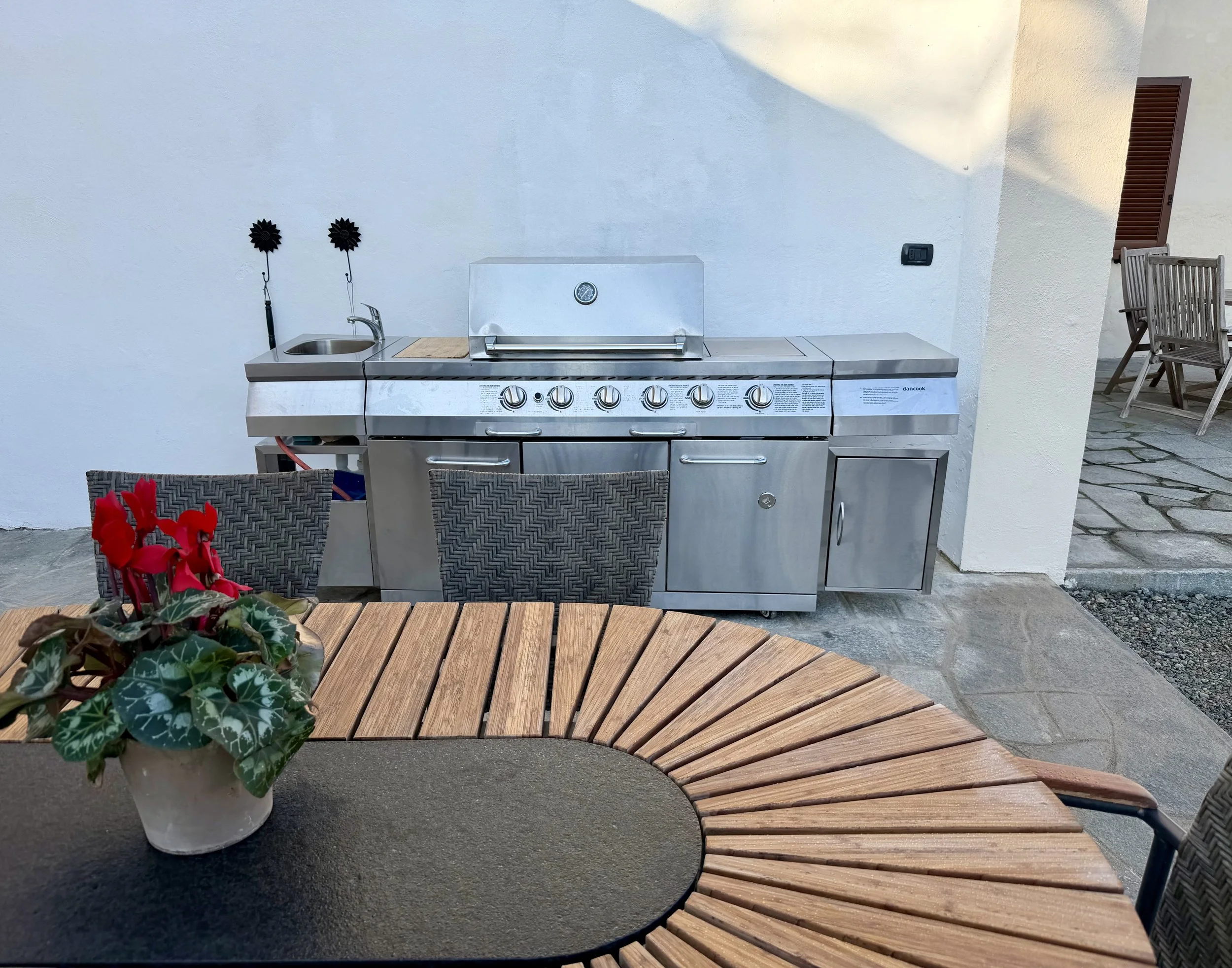 The outdoor area consists of an enclosed courtyard with several different seating areas. The impressive stainless steel BBQ has a fixed sink and a plumbed in gas grill, directly connected to the main system of the house. Next to the BBQ unit is a dining table seating 8 persons for al fresco eating. On the lucerna stone terrace directly outside the kitchen is another seating area and under the freestanding gazebo across the courtyard is yet another table with chairs. There are solar panels on the roof for heating of the sanitary water and the house is heated by radiators. The boiler was changed in 2022 and the septik system was updated in February 2025. There is a well with water for use in the garden.
