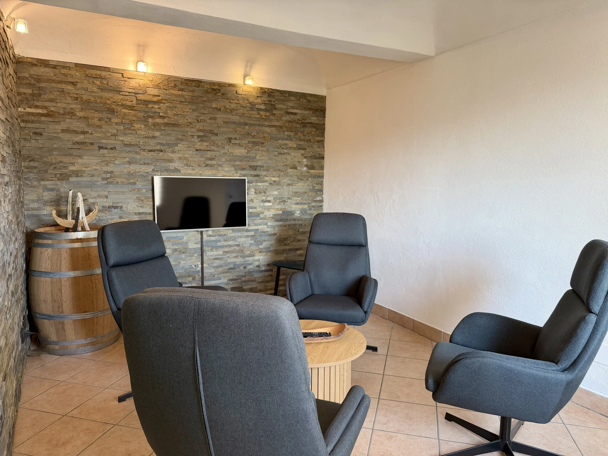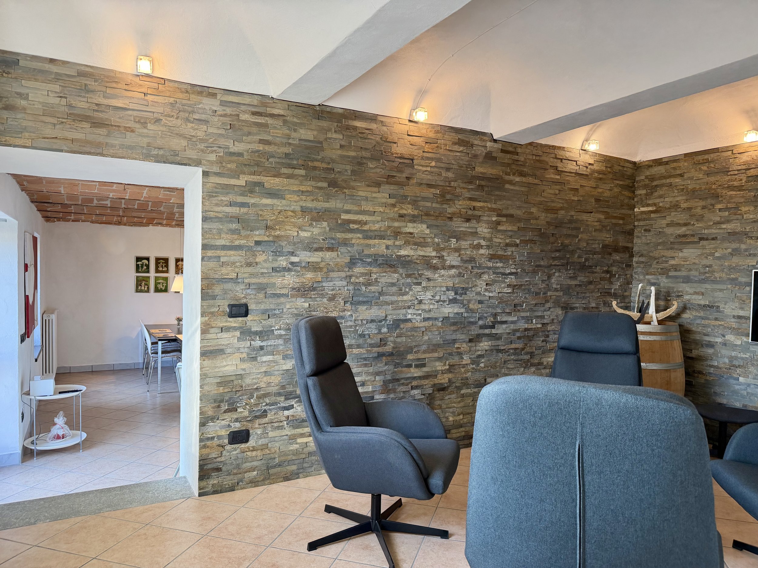 The house was totally refurbished in 2010 and fitted with new roof, doors and windows, electrical and plumbing systems and central heating. On the ground floor is a cosy living room with wood burning fireplace and beautiful old ceilings. The kitchen has characteristic vaulted brick ceilings and a terrace door leading out to the dining area in the enclosed courtyard. The sleek Italian design kitchen is tailor made for the space; an island solution with a modern gas hob and extractor fan, free standing stainless steel fridge/freezer, built in dishwasher, oven, microwave oven, coffee maker and a hot drawer. A well functioning and beautifully designed space where the owners have spent many happy hours. There is a dining table for 6 persons and views to the lovely outdoor space. There is a TV-room with stone tiled walls next to the kitchen. A practical solution if someone wants to watch TV or play video-games whilst others prefer to sit quietly in front of the fire place in the living room with a book. Also on the ground floor is a good size bathroom with shower cubicle and space for a washing machine. On the first floor are 3 double bedrooms, a studio/guest bedroom and a bright and spacious family bathroom with a bath tub. By the main entrance door is a external staircase leading down to a stunning wine cellar. If you are a wine lover, this is the perfect space for your wine collection and to arrange wine tastings with friends and family.