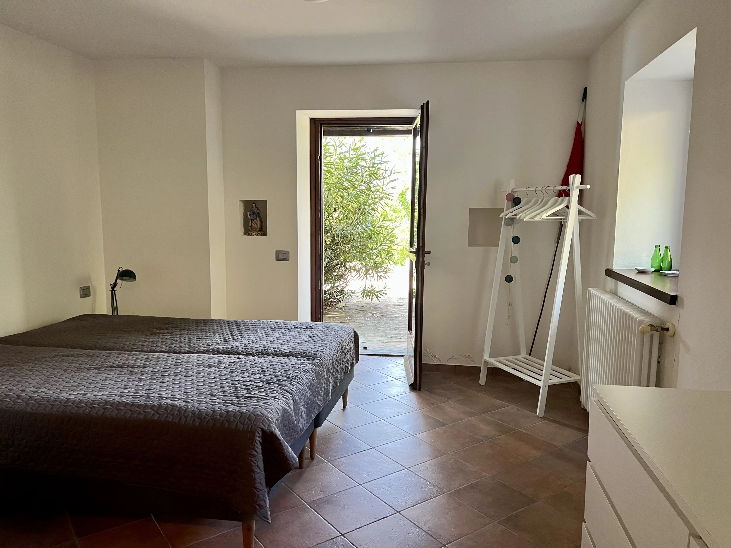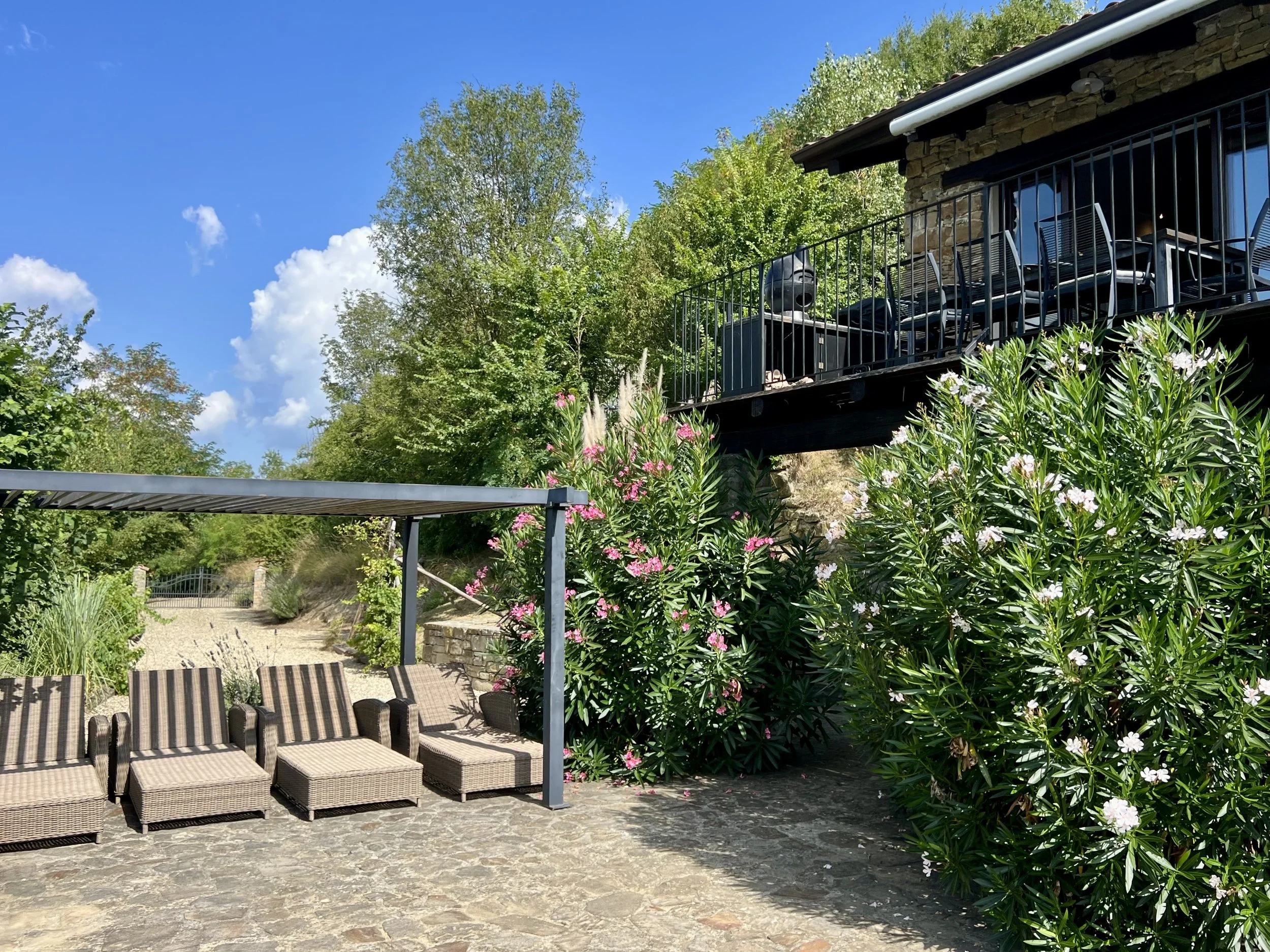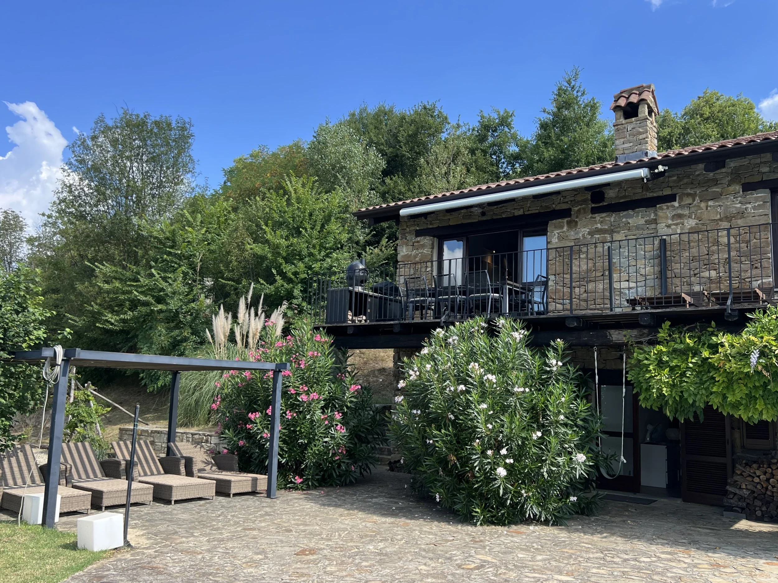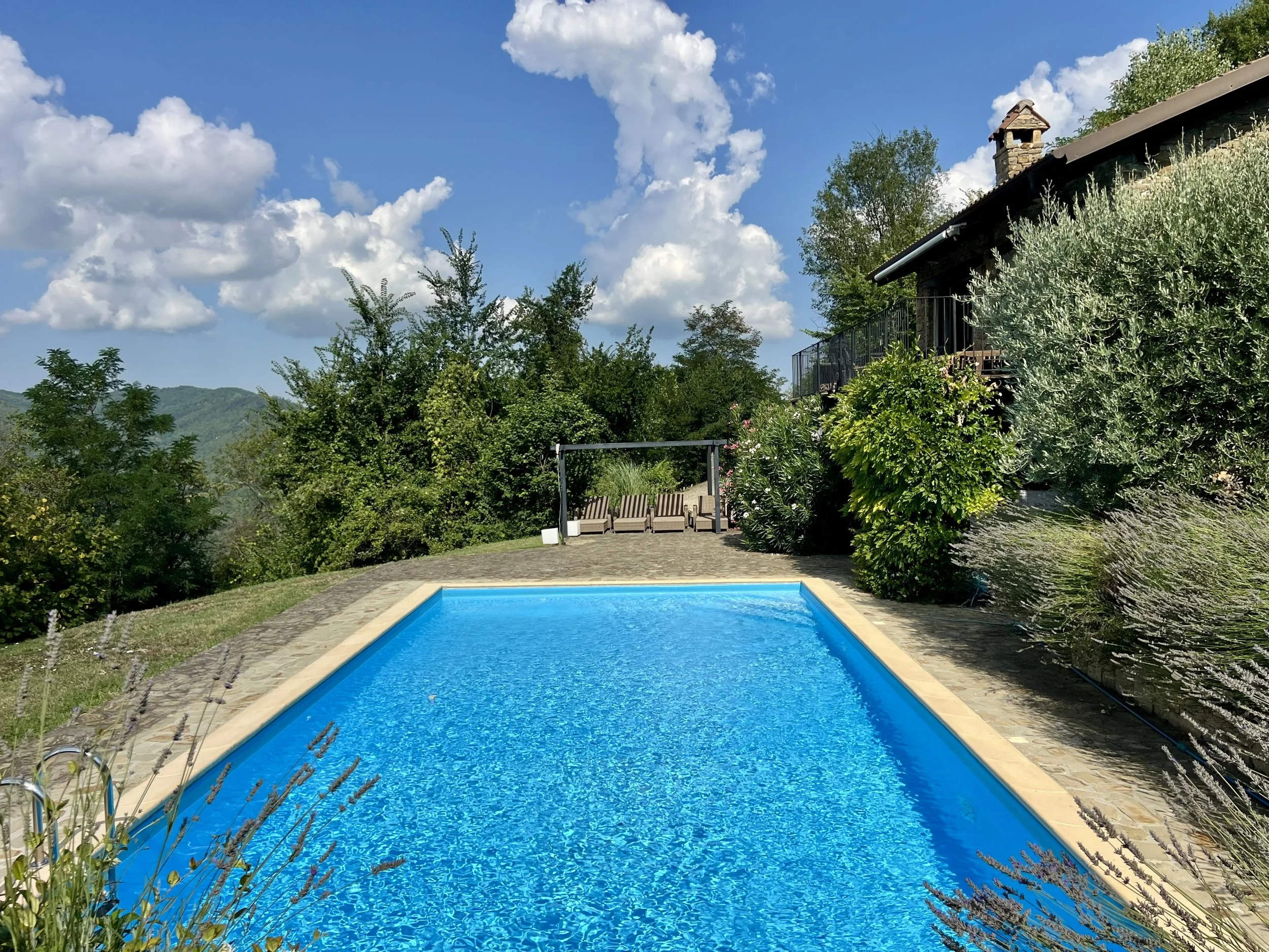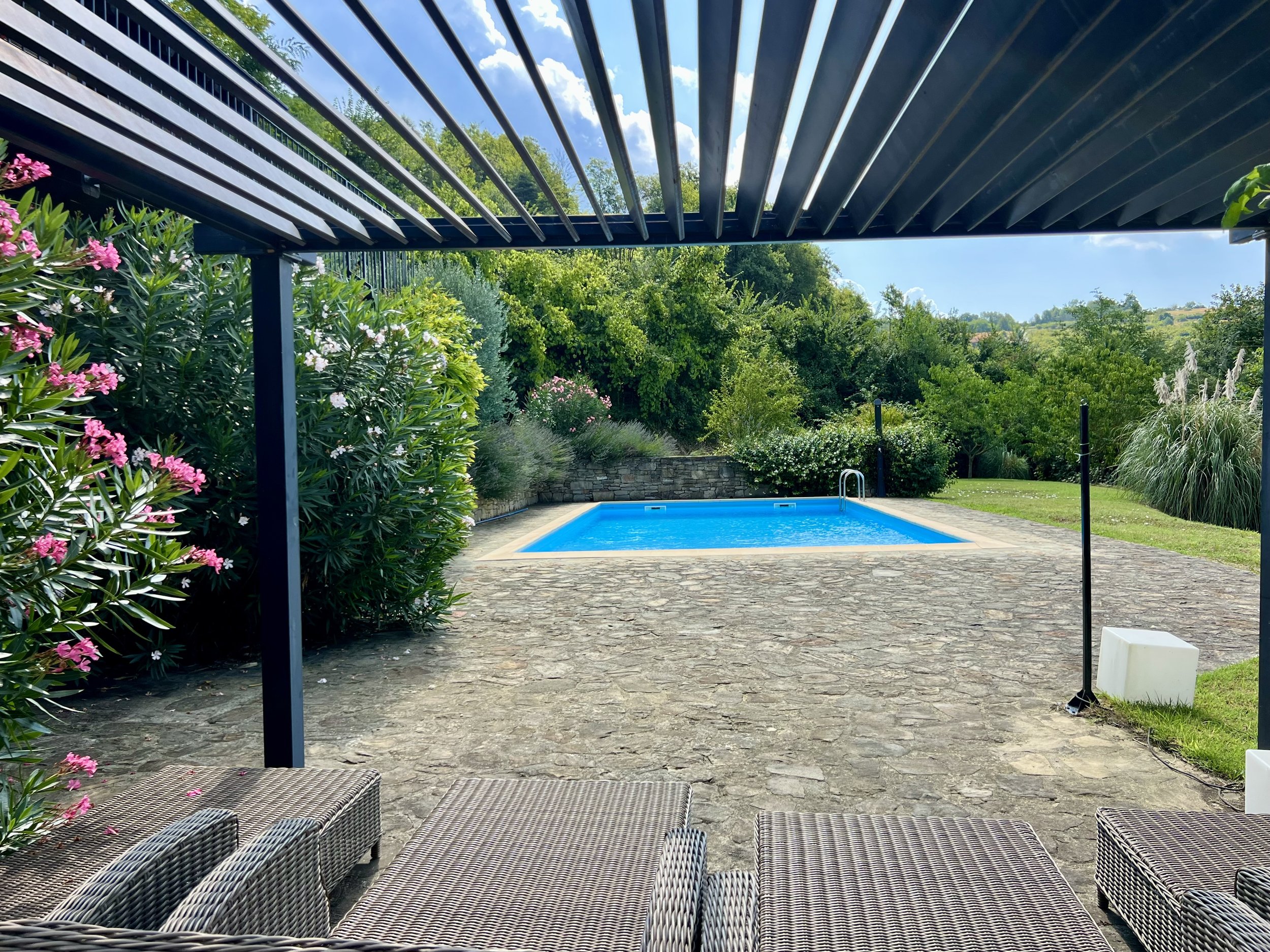 Downstairs you find two double bedrooms, each with its own ensuite bathroom with shower cubicle. There are veranda doors leading directly from the bedrooms onto the pool terrace and the sun lounge area with its modern pergola. The pool area is covered with langhe stone and an outdoor shower is placed by the pool ladder. The garden is mature and planted with lavender, olive trees, jasmine and oleander bushes. It is inviting and well tended and creates a beautiful frame around the house and its terraces.
