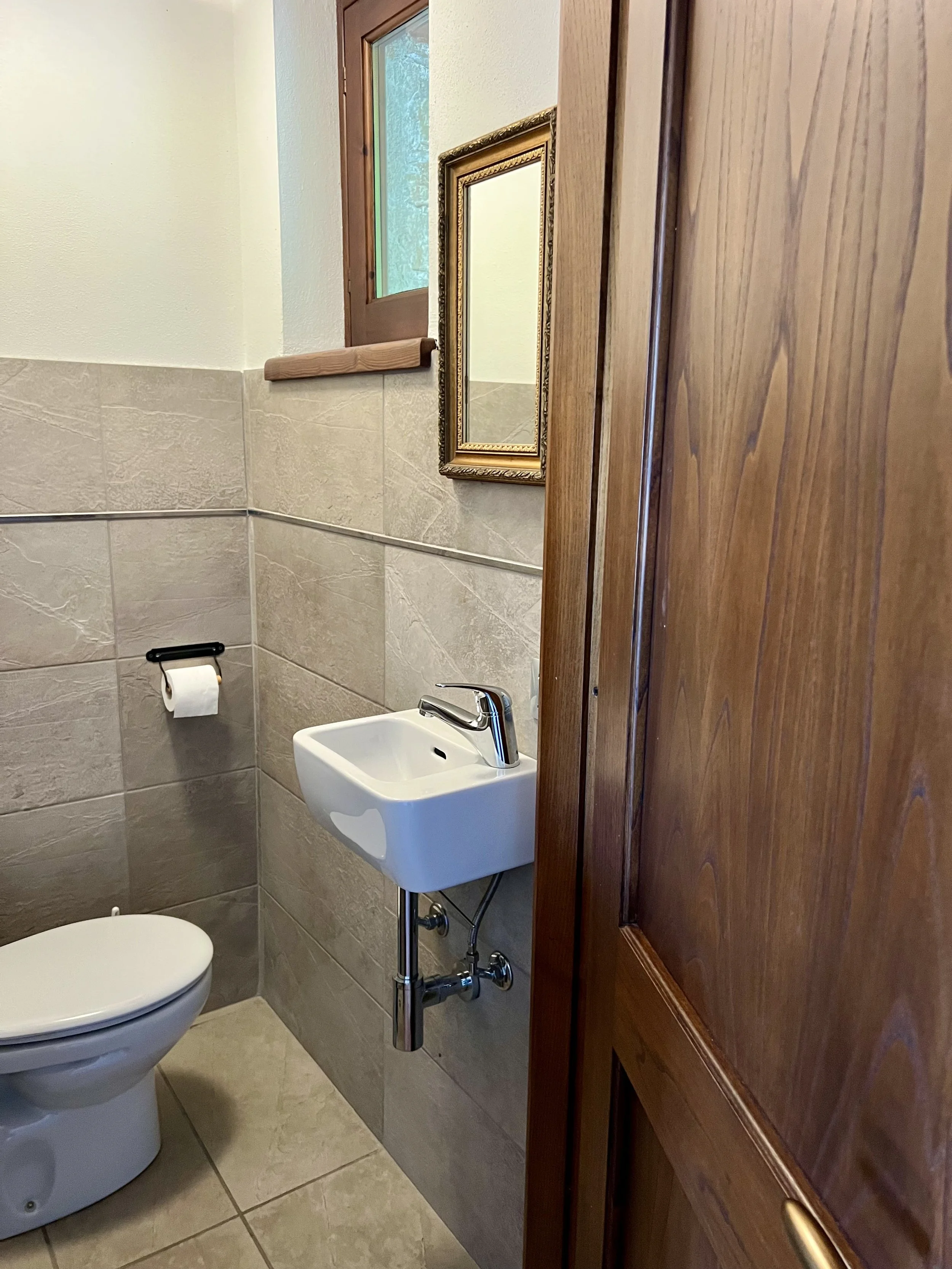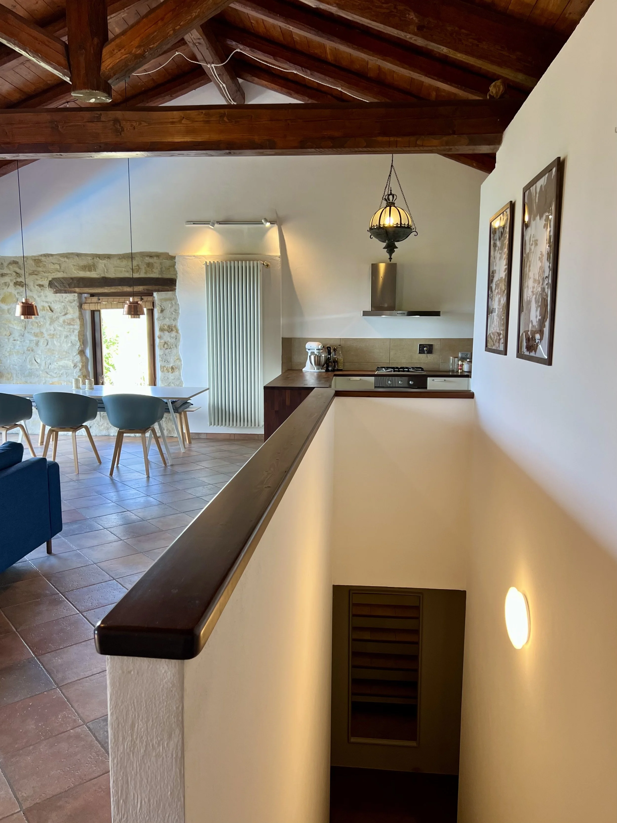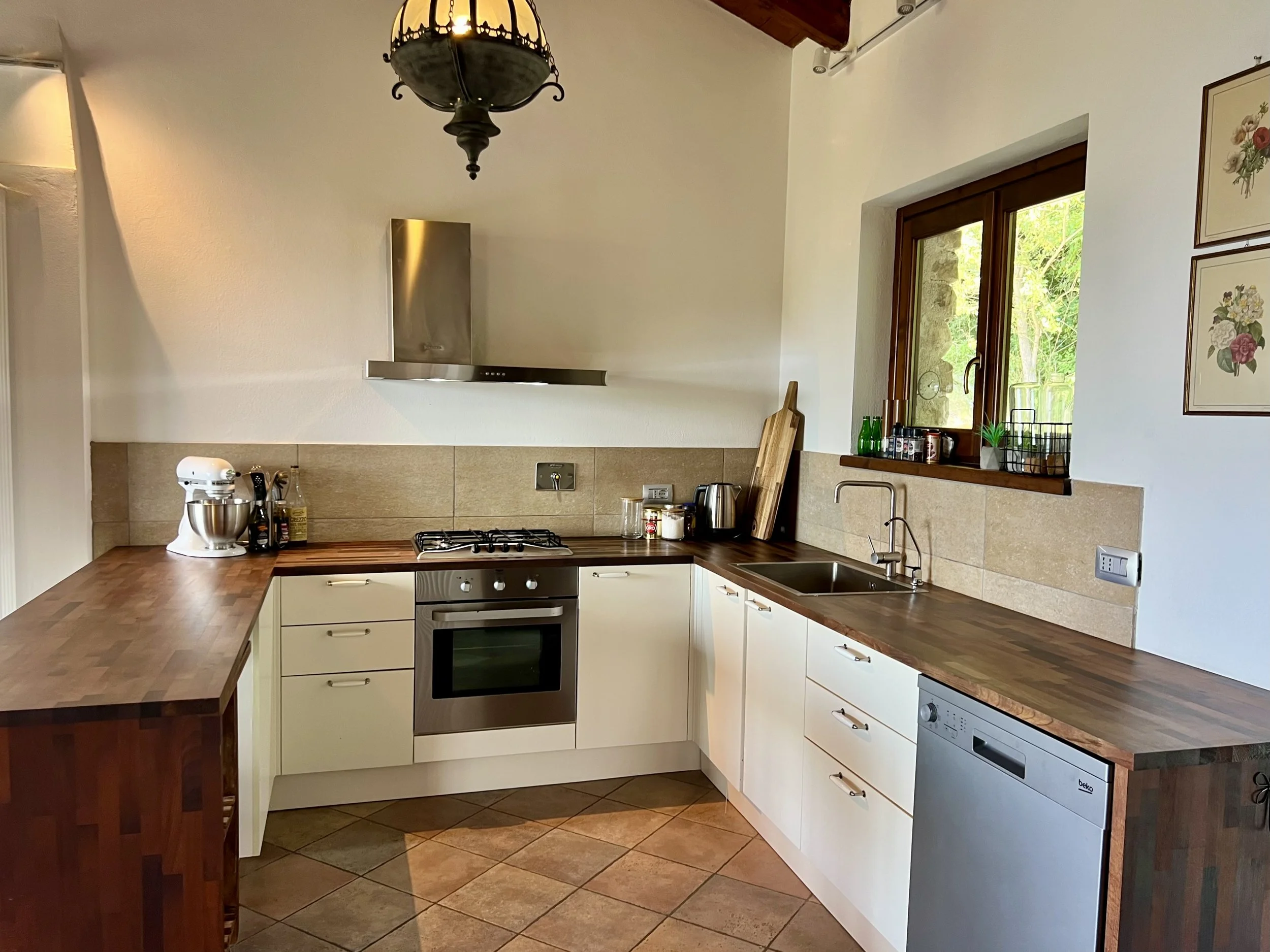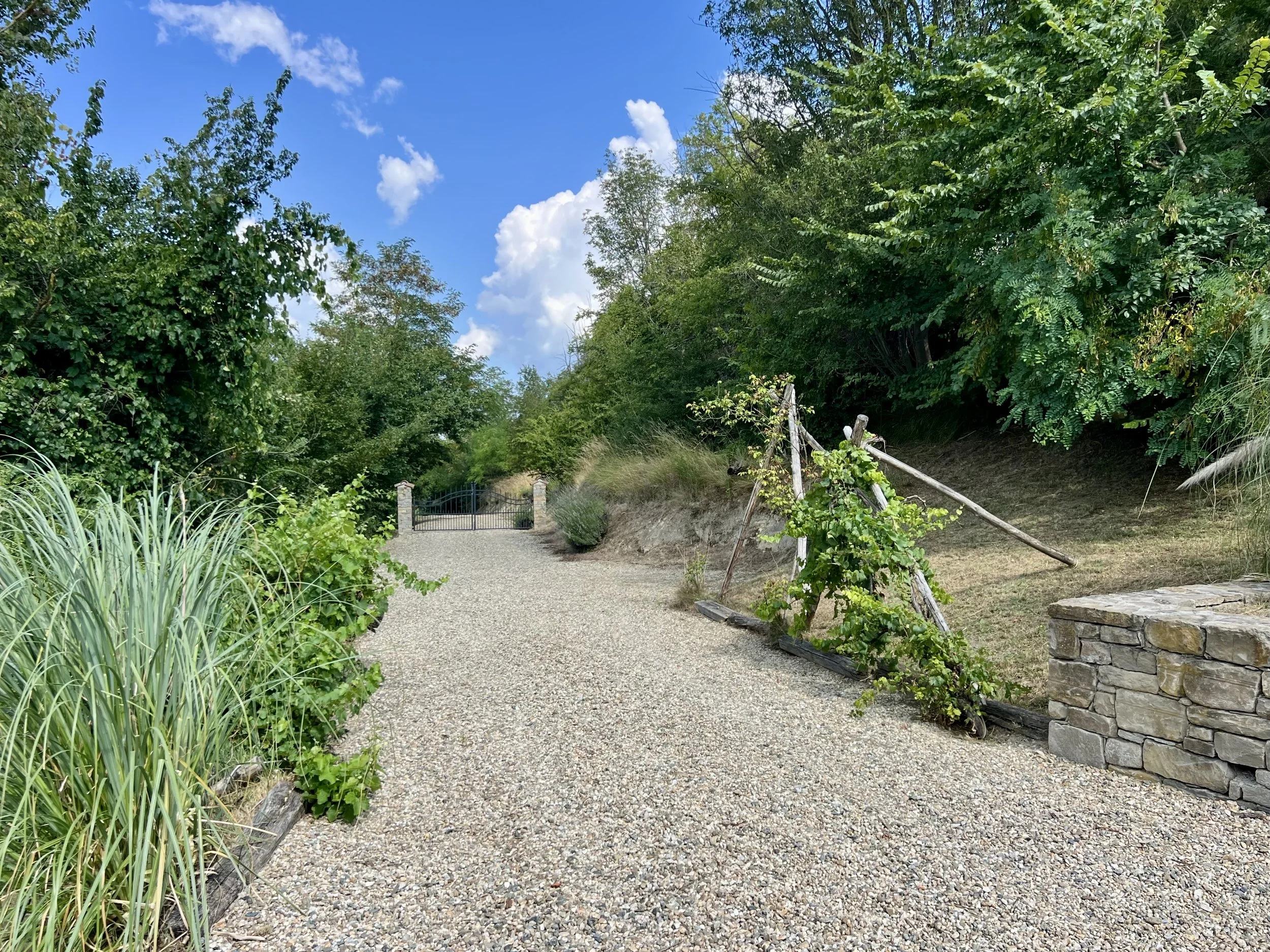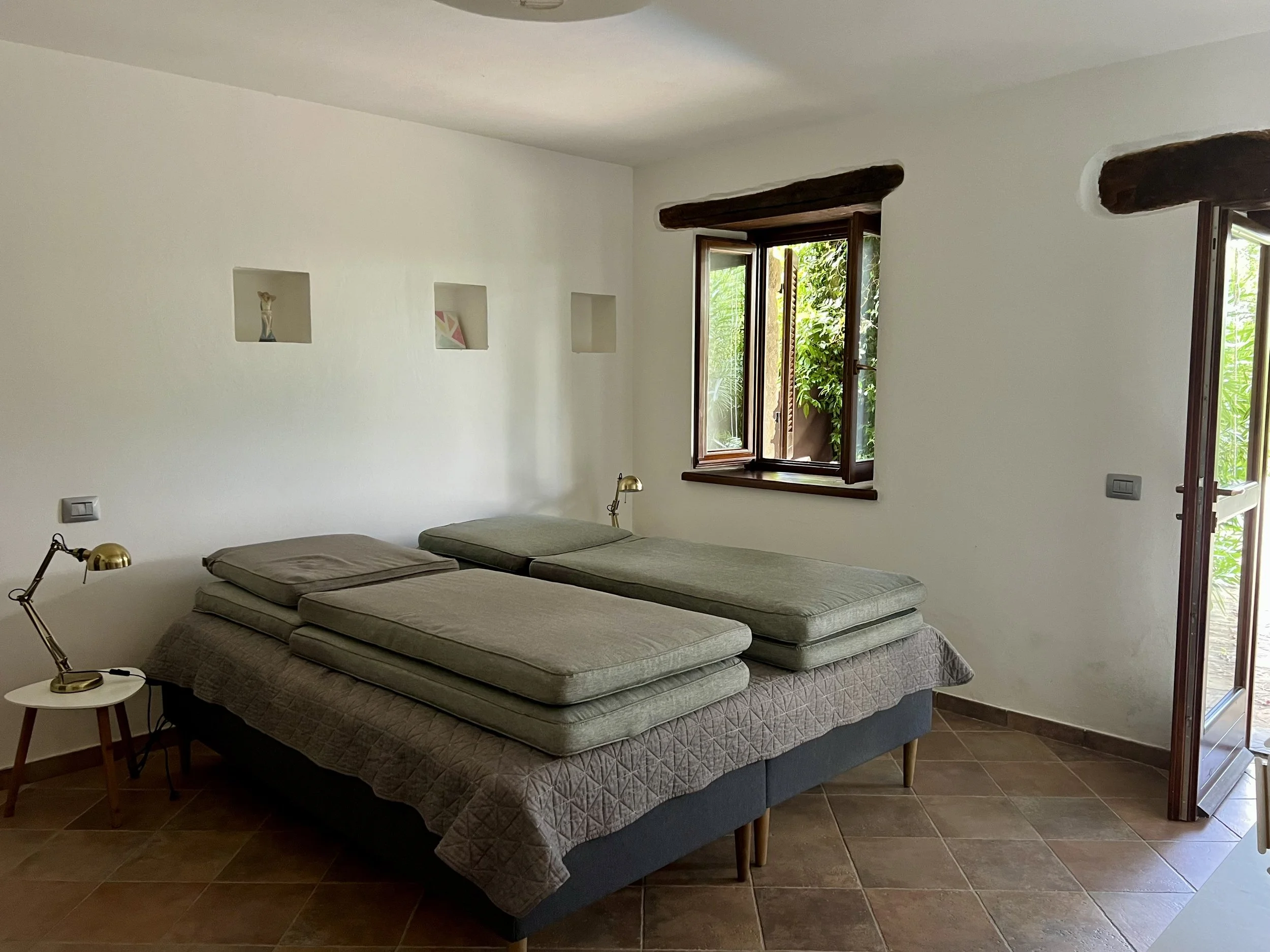 Downstairs you find two double bedrooms, each with its own ensuite bathroom with shower cubicle. There are veranda doors leading directly from the bedrooms onto the pool terrace and the sun lounge area with its modern pergola. The pool area is covered with langhe stone and an outdoor shower is placed by the pool ladder. The garden is mature and planted with lavender, olive trees, jasmine and oleander bushes. It is inviting and well tended and creates a beautiful frame around the house and its terraces.