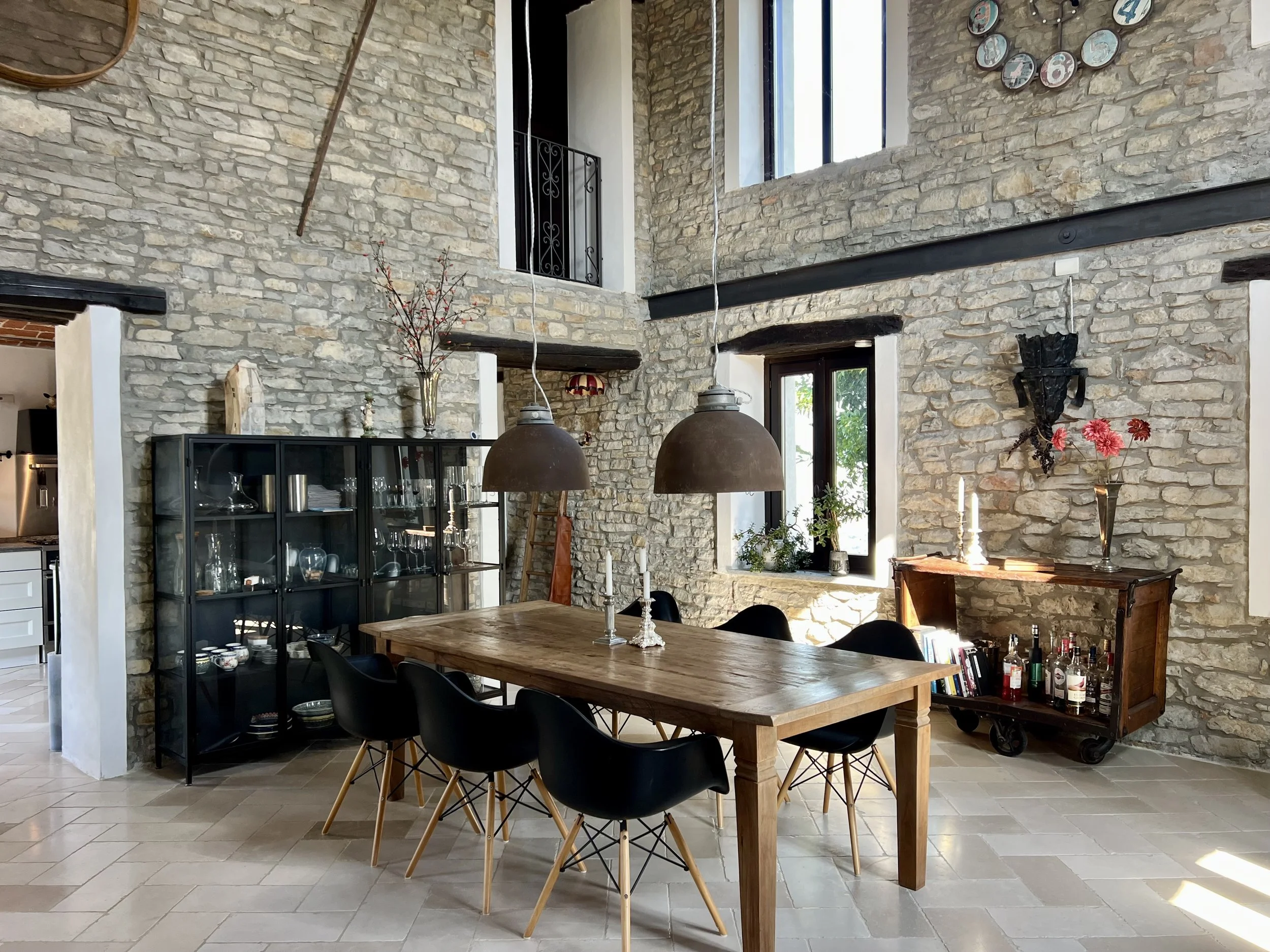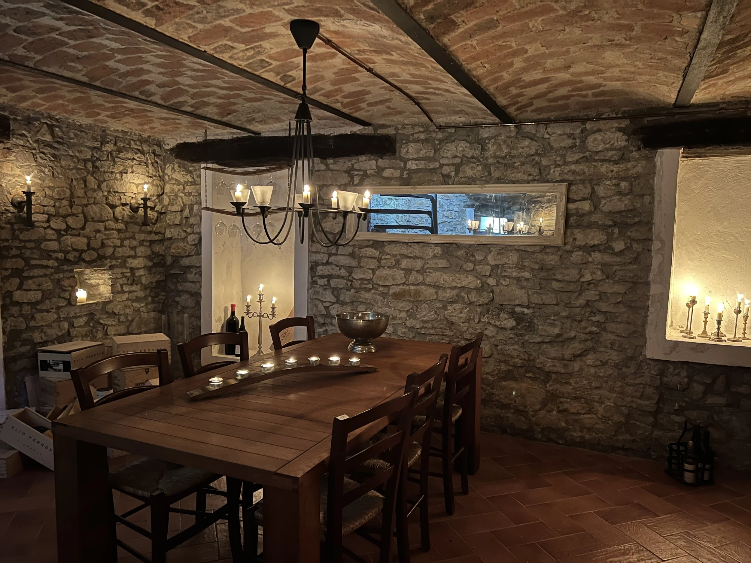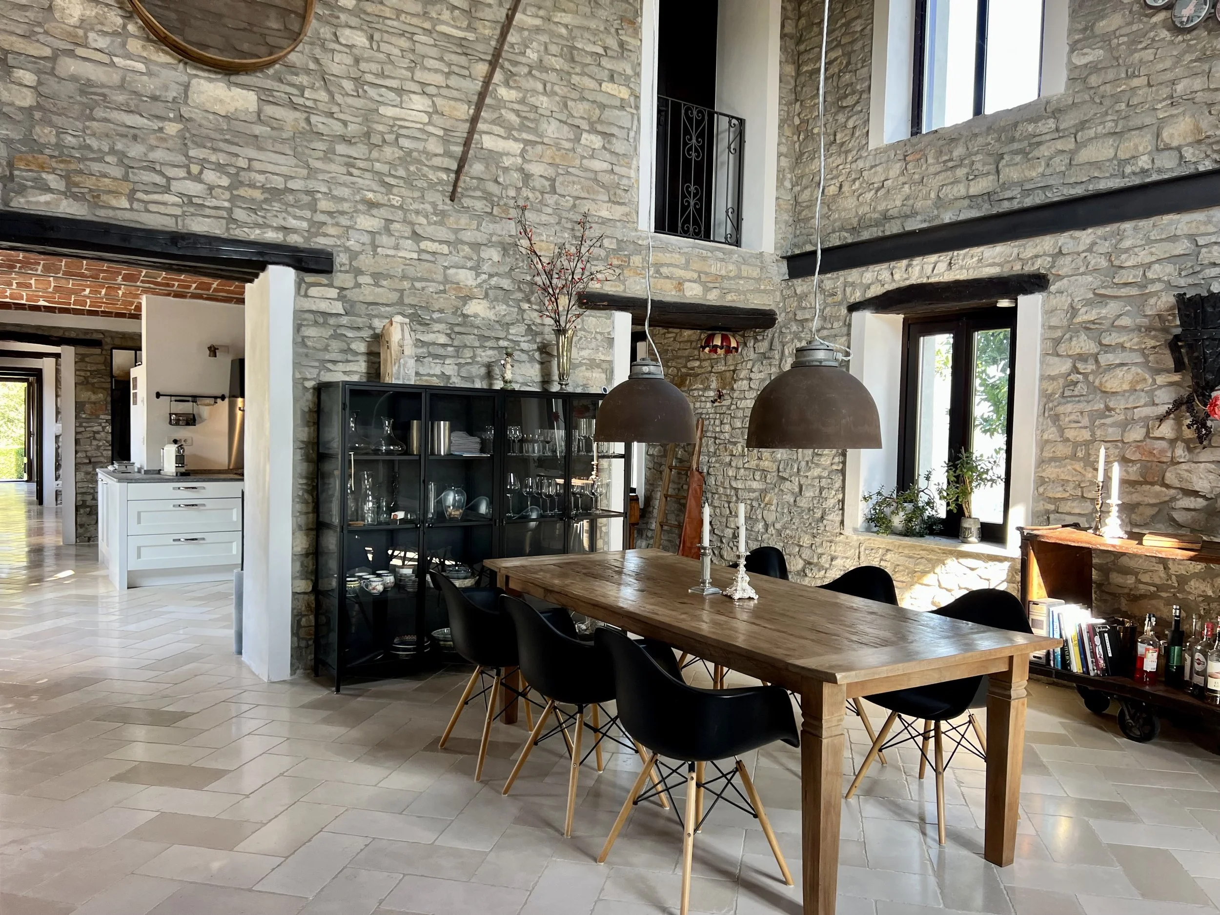 On the ground floor is a fabulous living/dining room with double height ceilings. The light is filtered through the old brick lacework openings on the first floor level whilst terrace doors are leading out to a covered terrace. The amazing ceiling height and the many windows give this room a very special and unique feel. A stunning antique wood burning stove adds to the charm together with old industrial lamps over the dining table. Two openings are leading from the main living room into the kitchen which is modern and practical. Terrace doors lead out from the kitchen to the courtyard. Further on the ground floor is a cosy sitting room with a wood burning fireplace. A lovely room to enjoy music or watch a movie. This is followed by a double bedroom with terrace door directly to the terrace at the far end of the house, a bathroom with shower cubicle and a technical room. There is a very special wine cellar under the main living/dining room with a staircase concealed by two trap doors in the far end corner of the room.