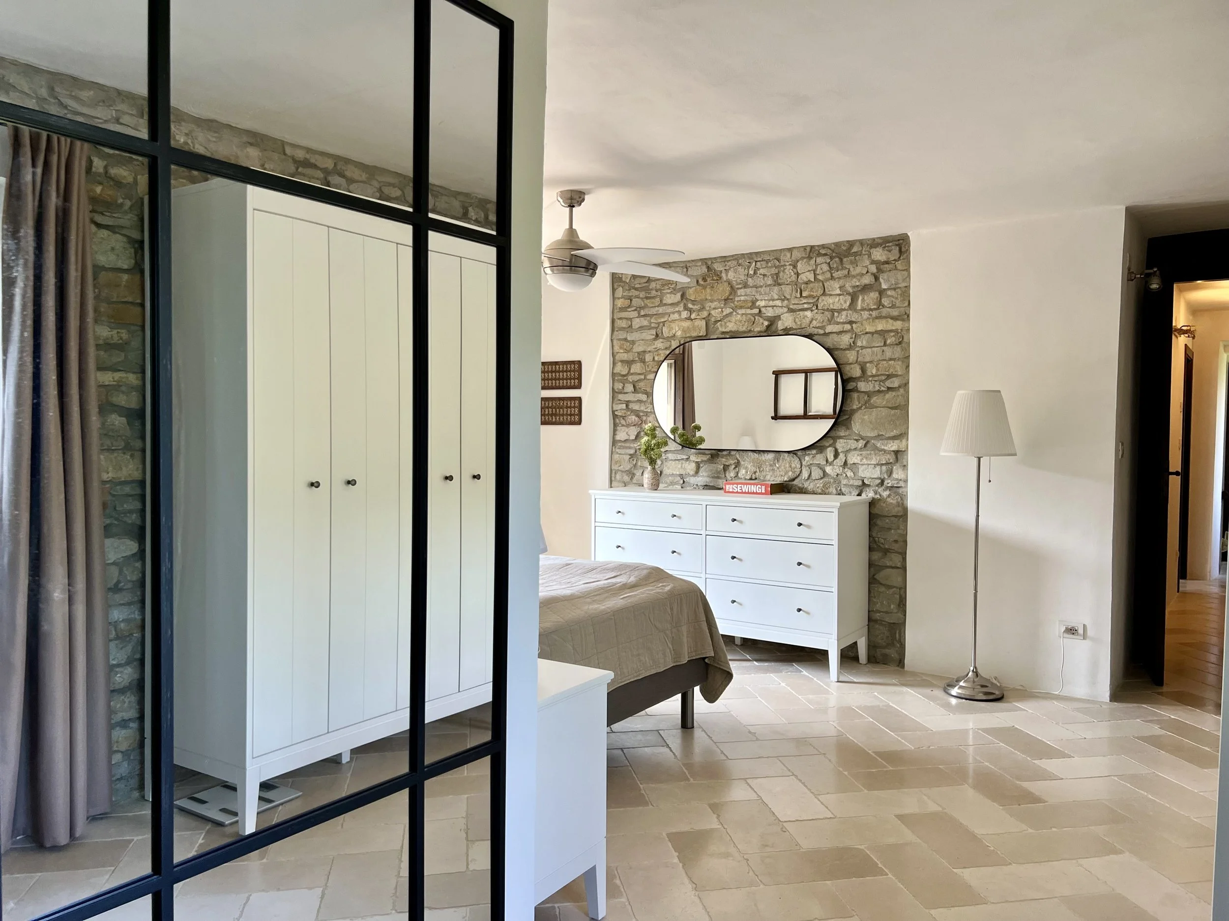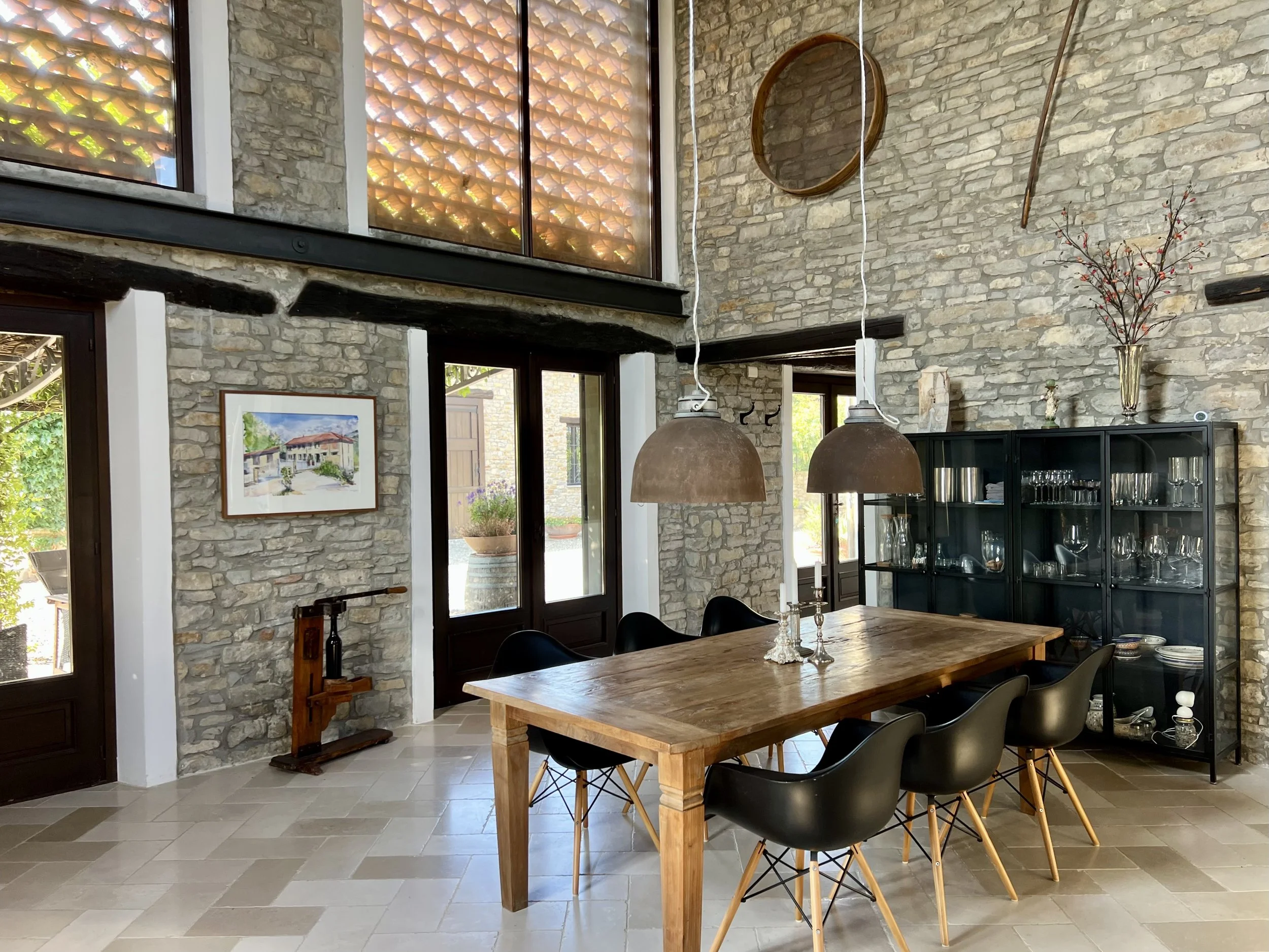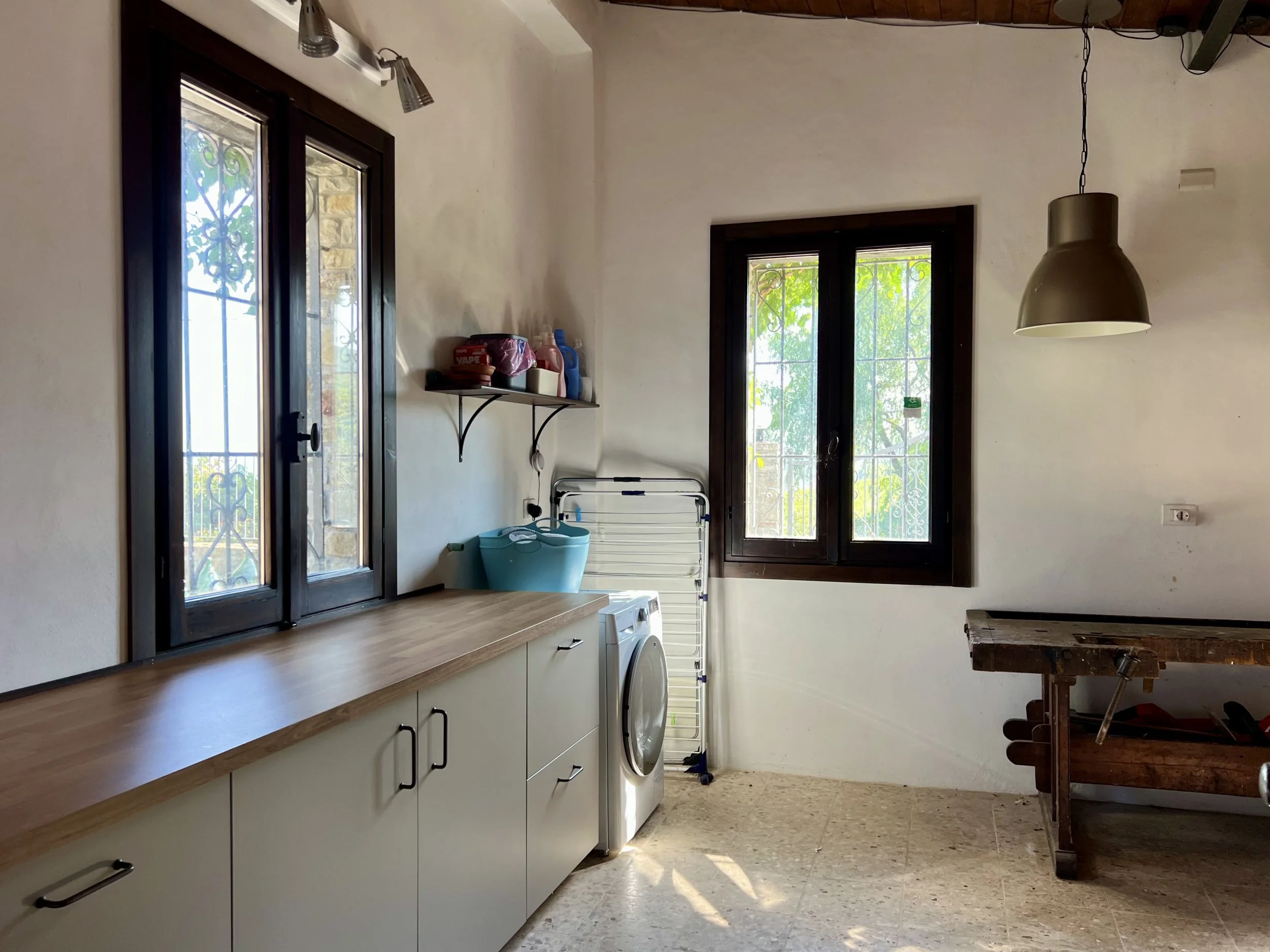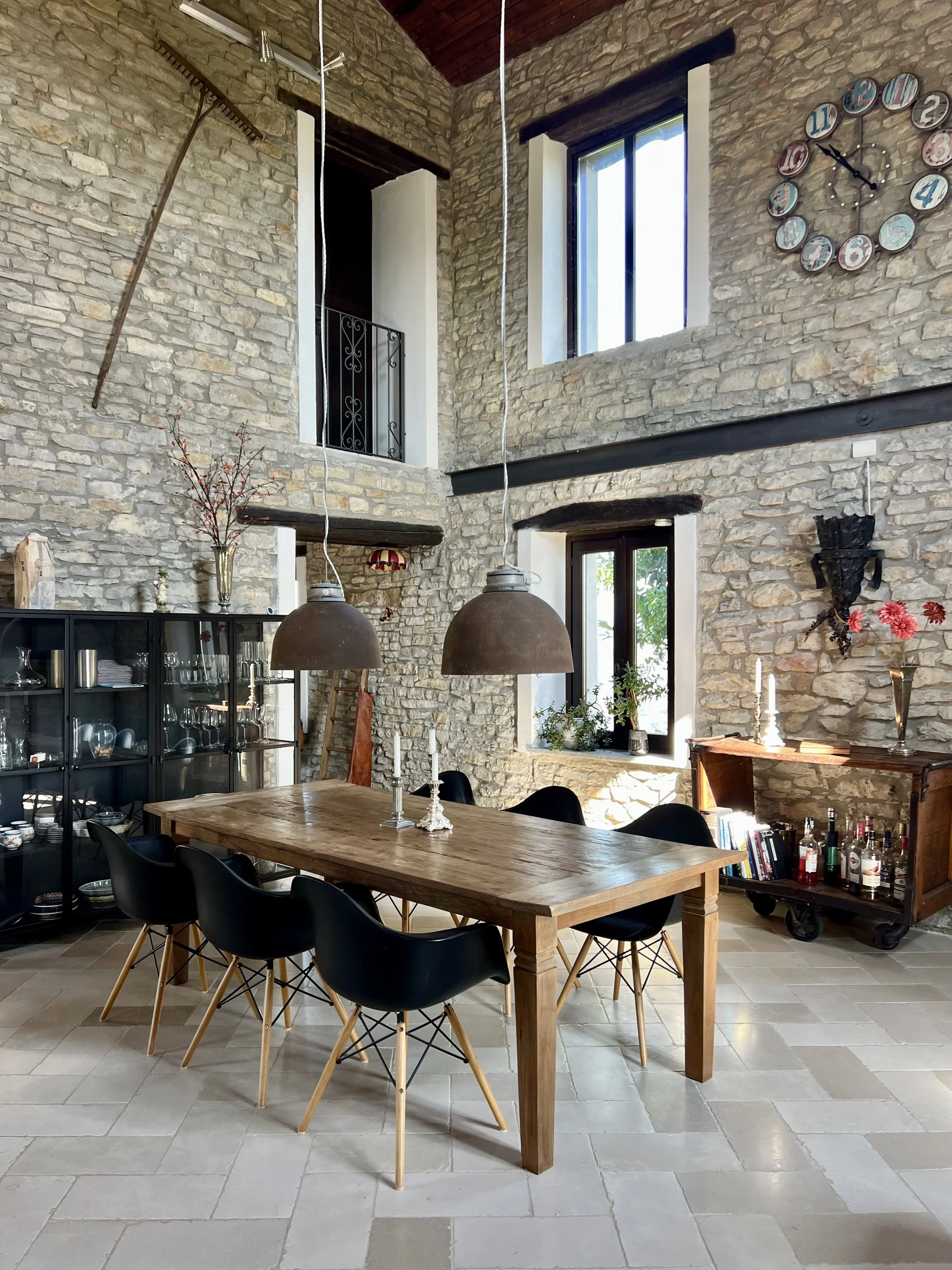 On the ground floor is a fabulous living/dining room with double height ceilings. The light is filtered through the old brick lacework openings on the first floor level whilst terrace doors are leading out to a covered terrace. The amazing ceiling height and the many windows give this room a very special and unique feel. A stunning antique wood burning stove adds to the charm together with old industrial lamps over the dining table. Two openings are leading from the main living room into the kitchen which is modern and practical. Terrace doors lead out from the kitchen to the courtyard. Further on the ground floor is a cosy sitting room with a wood burning fireplace. A lovely room to enjoy music or watch a movie. This is followed by a double bedroom with terrace door directly to the terrace at the far end of the house, a bathroom with shower cubicle and a technical room. There is a very special wine cellar under the main living/dining room with a staircase concealed by two trap doors in the far end corner of the room.