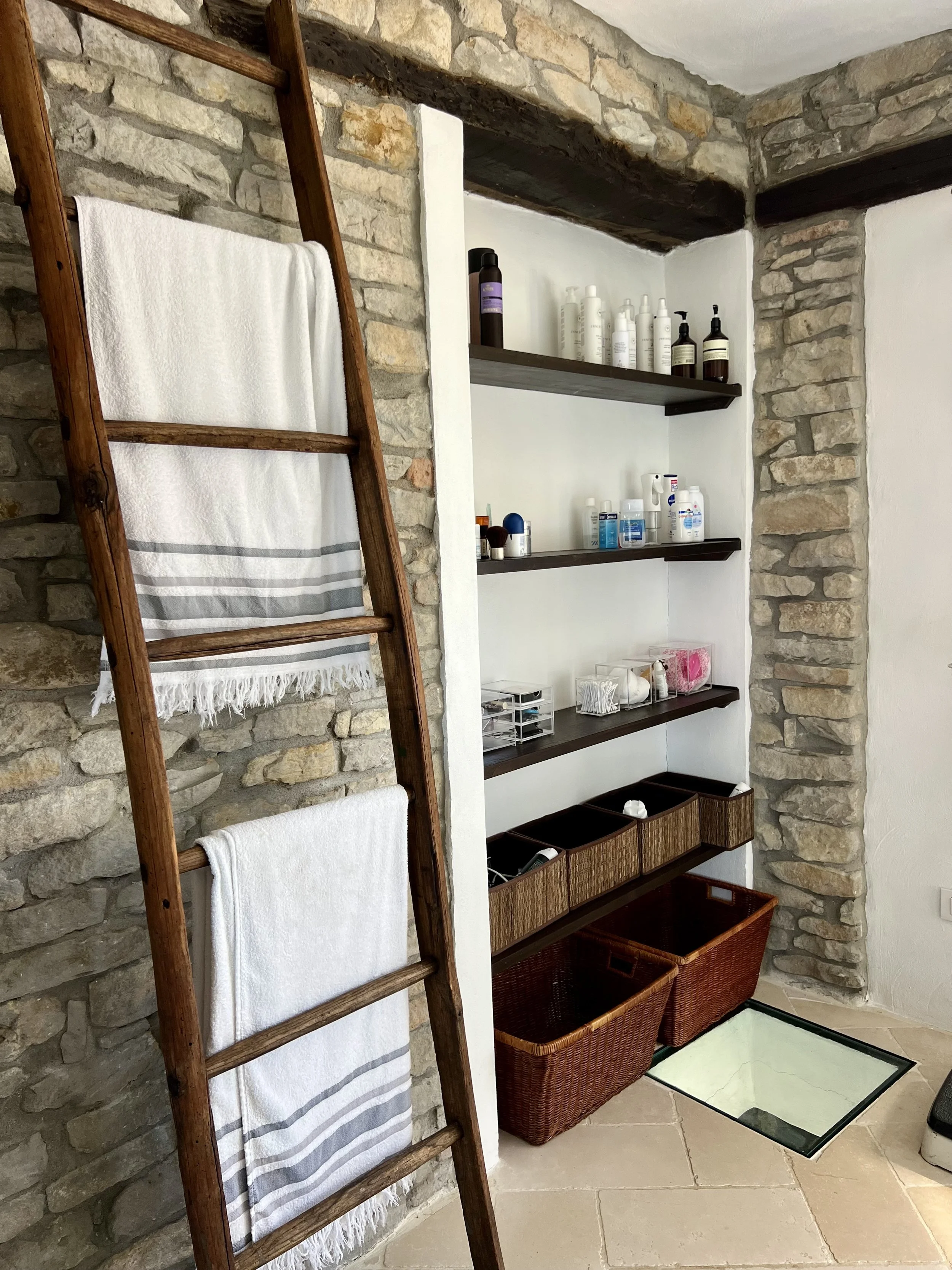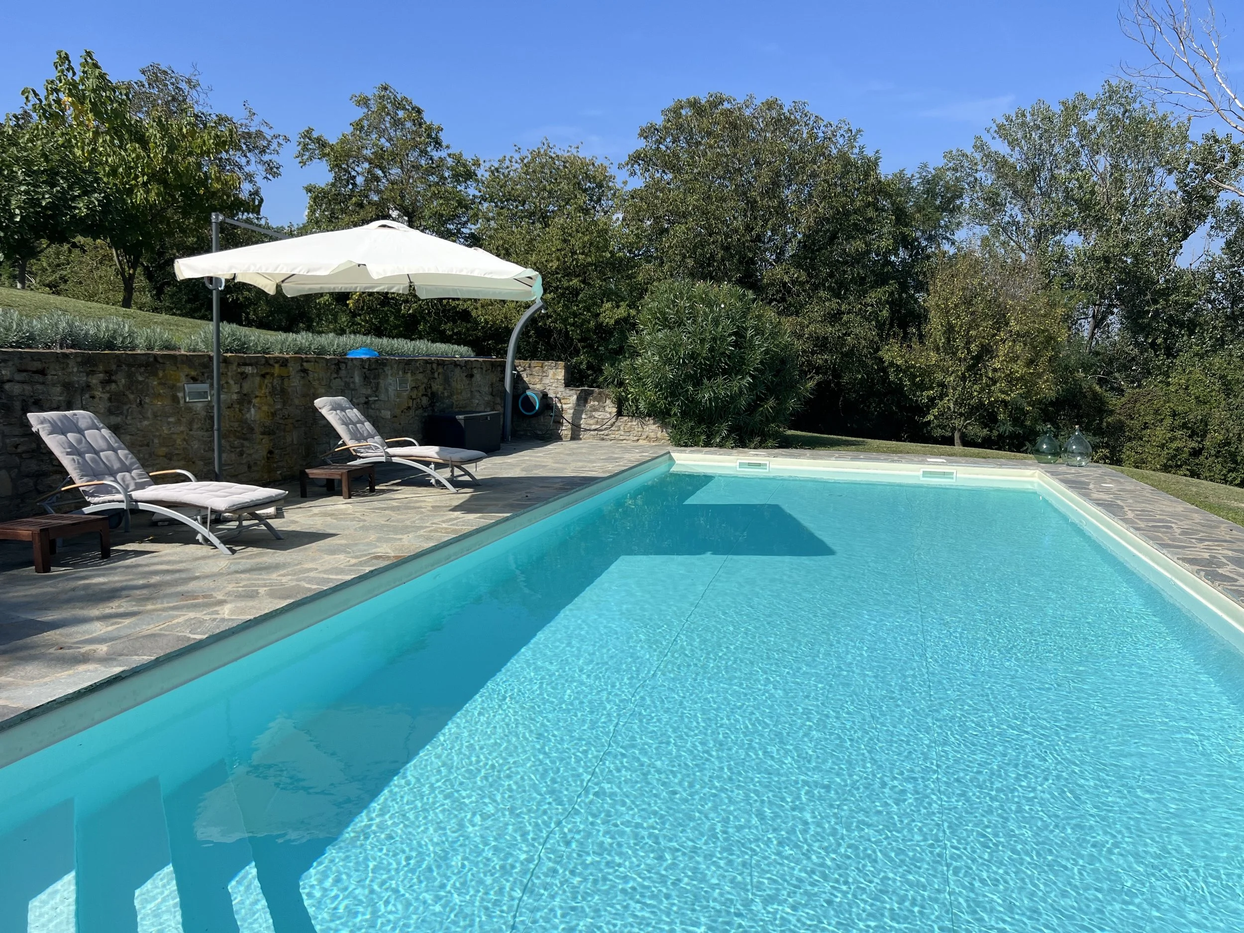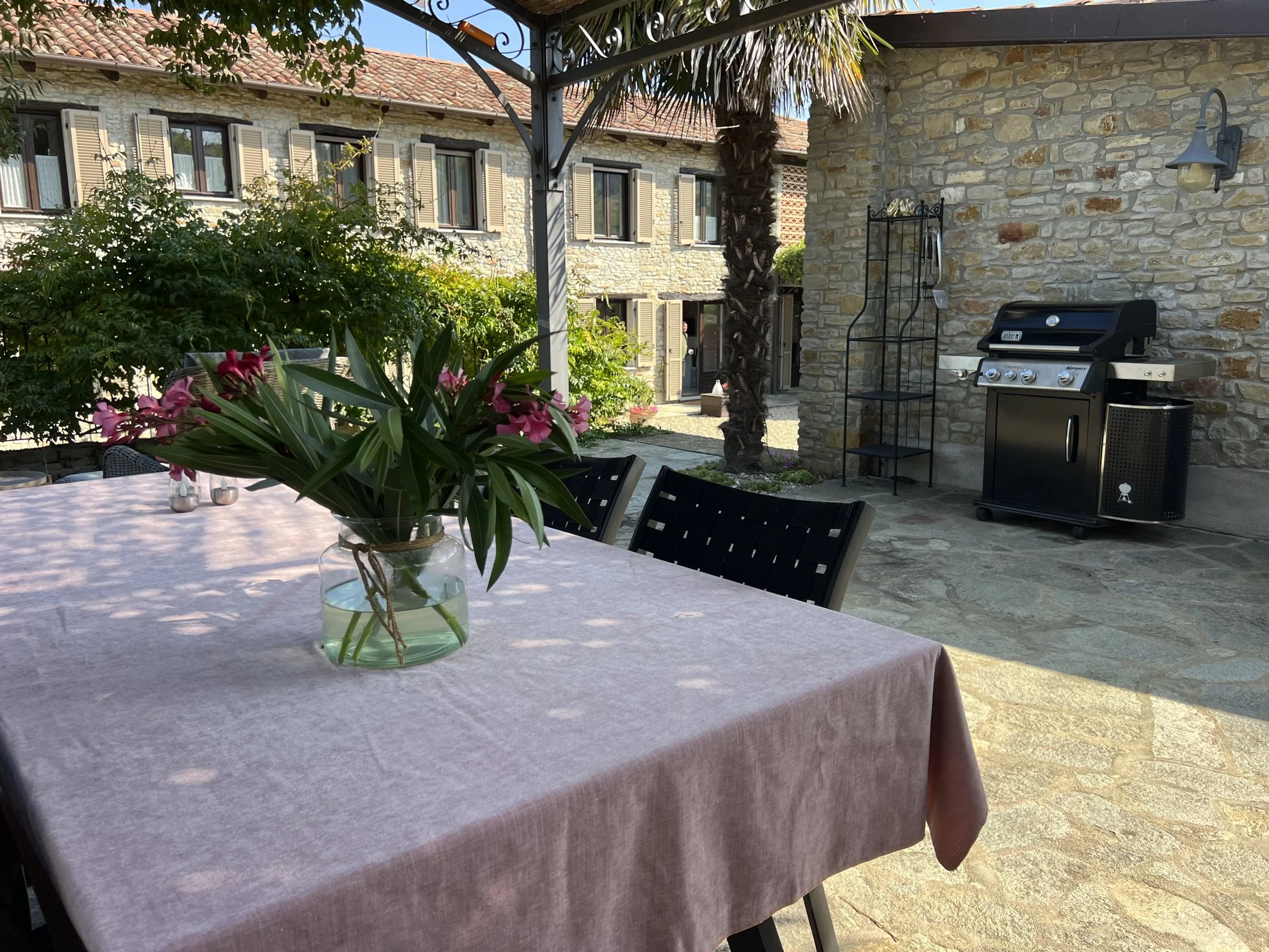 By the stone stairs leading up to the pool terrace is a charming plant-covered gazebo terrace with dining area and lounge chairs: the perfect space to enjoy long lunches in the shade, arranging BBQ dinners or simply just relax whilst enjoying the tranquility and taking in the stunning countryside.